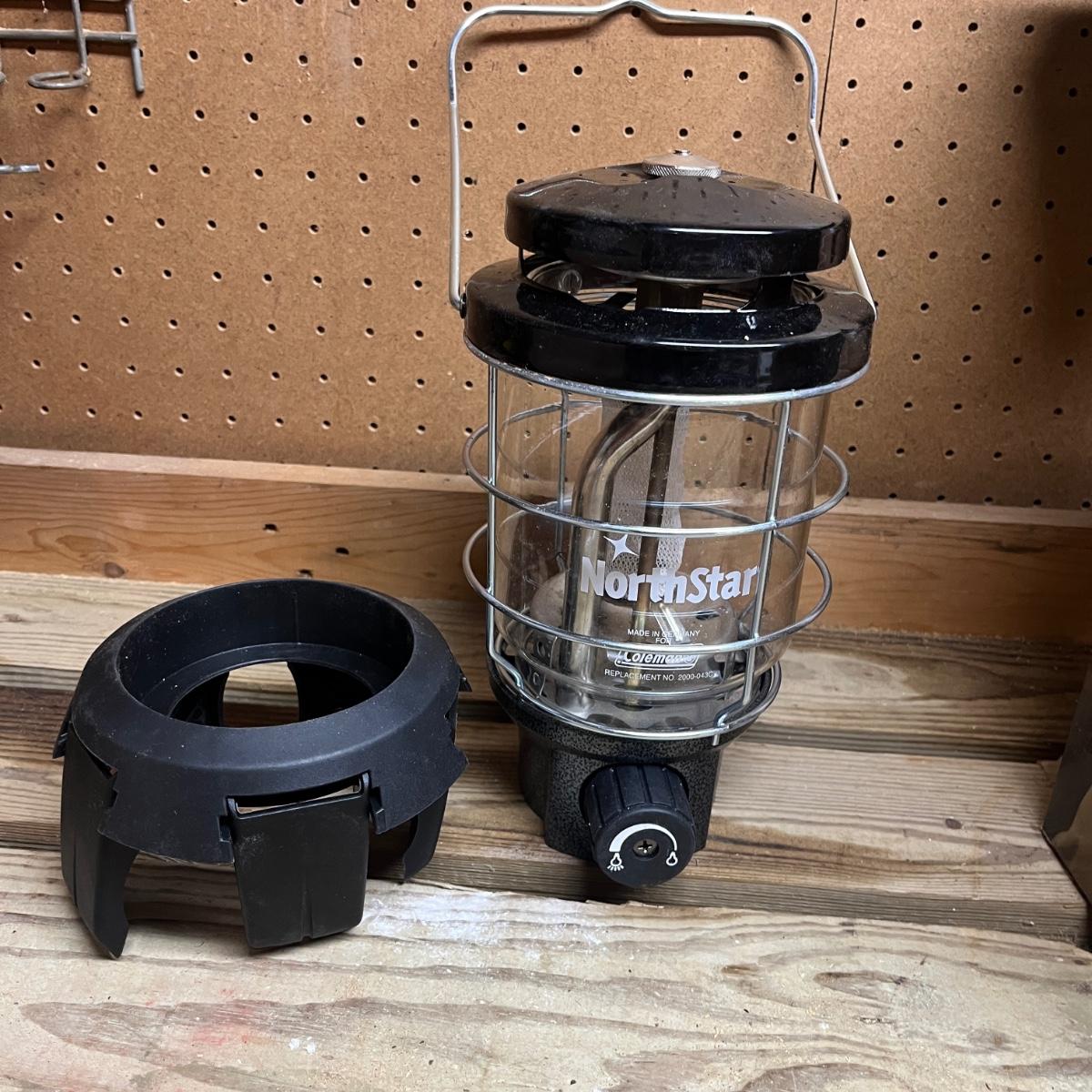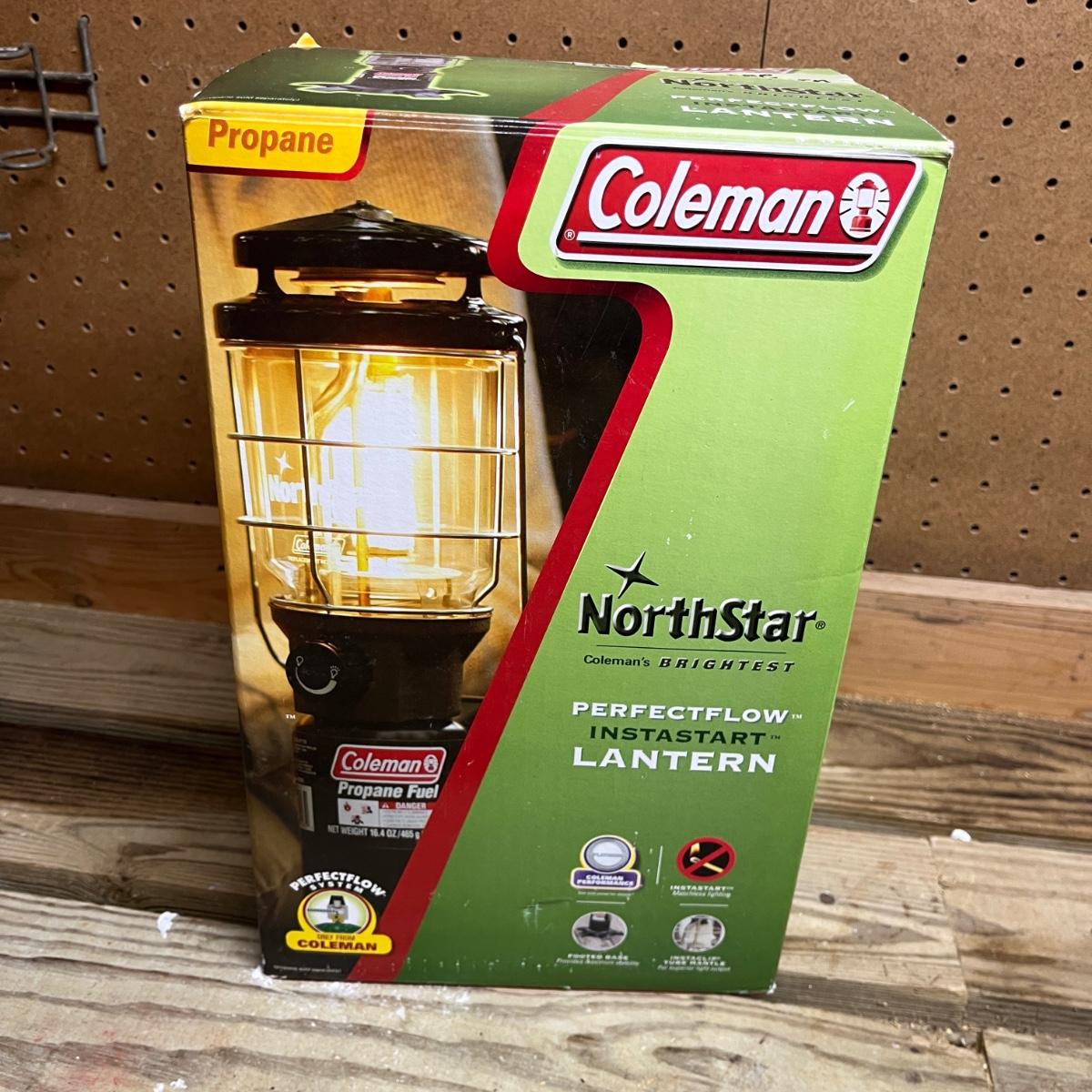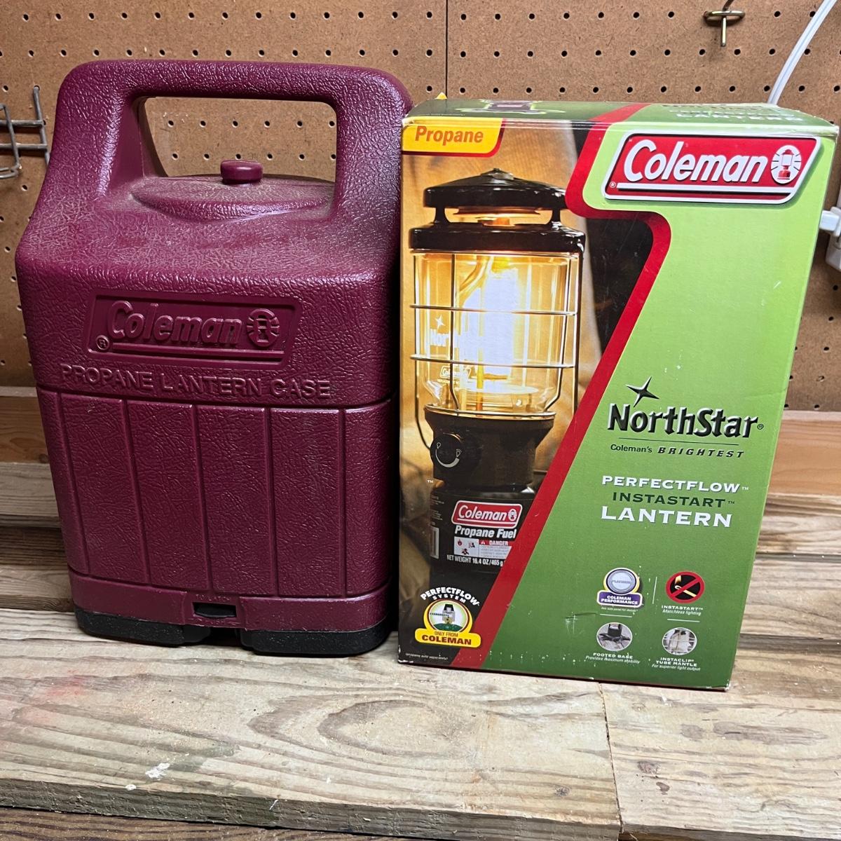 Lot includes a Coleman propane lantern in plastic carrying case and a Coleman Northstar propane lantern. Carrying case measures 8” x 8” x 13”H.