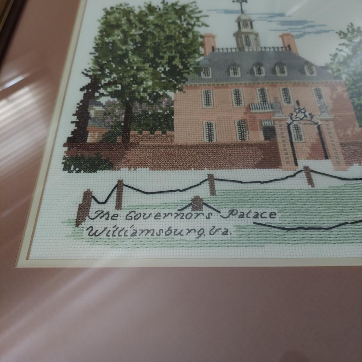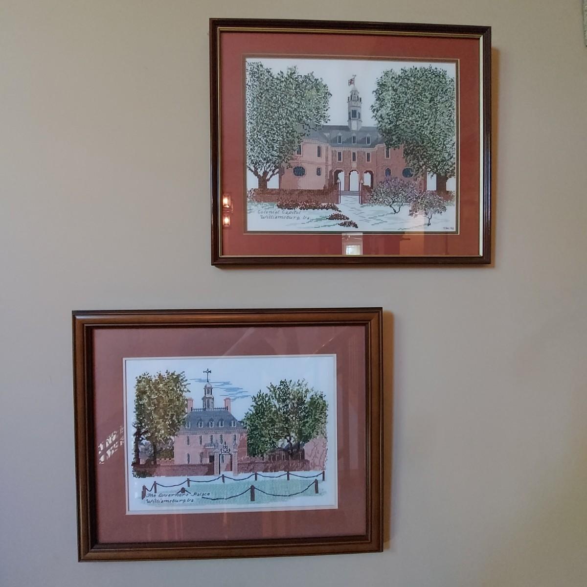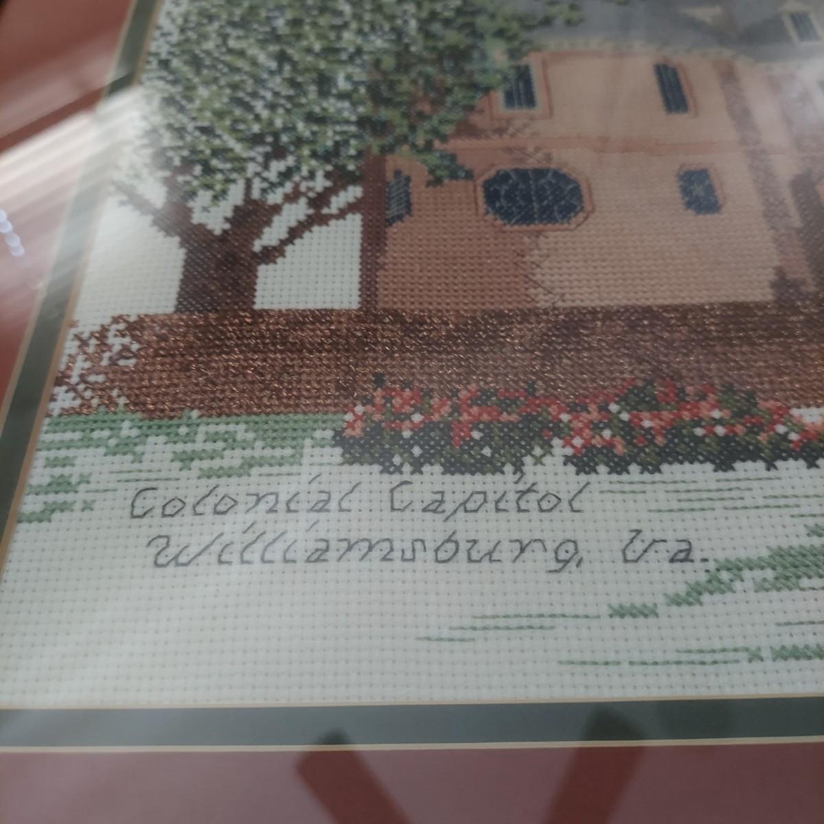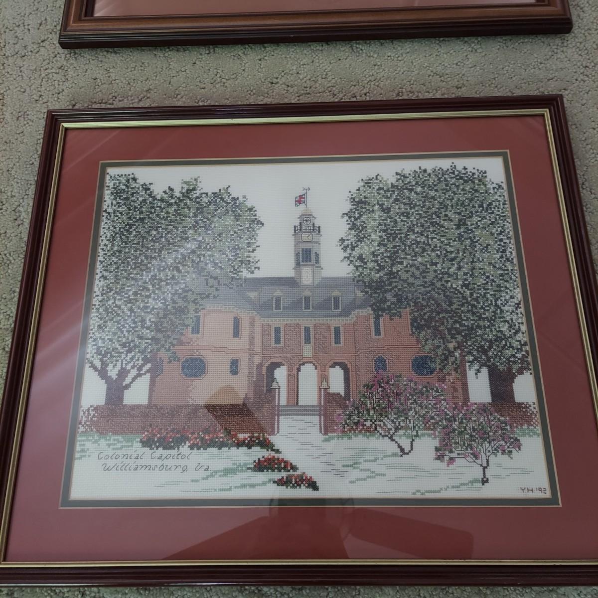 Two Colonial Williamsburg framed needlepoints. Colonial Capitol Williamsburg, VA '92 has green and red mats with red and gold frame. Measures approximately 21" x 18"H. The Governors Place Williamsburg, VA 1990 has brown and cream mats with wood frame. Measures approximately 22" x 18"H. Shipping available. Shipping art can be costly. We suggest contacting our preferred local shipping provider, Postage Express, with dimensions and getting an estimate before bidding: (828) 670-5501 or postageexpress@yahoo.com.