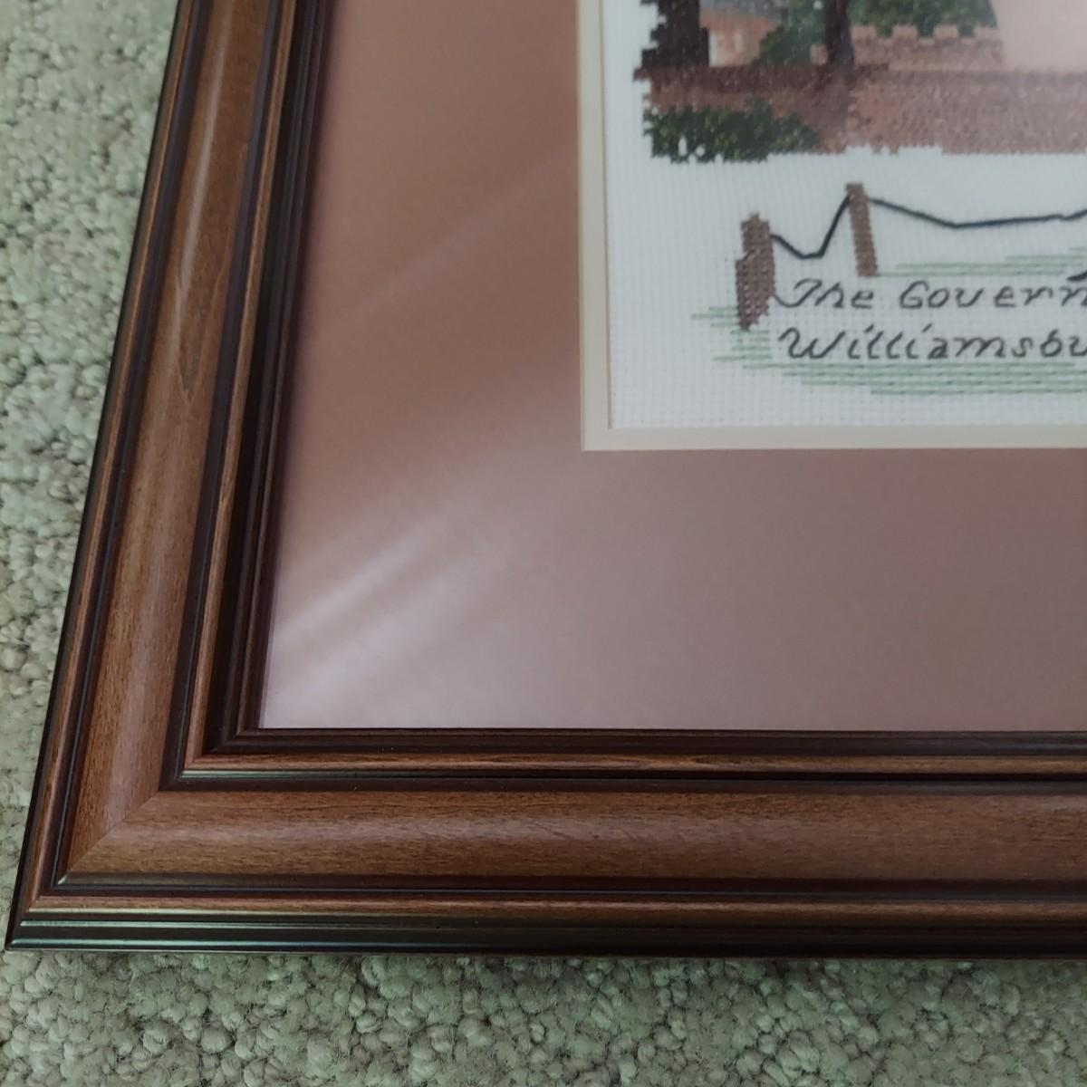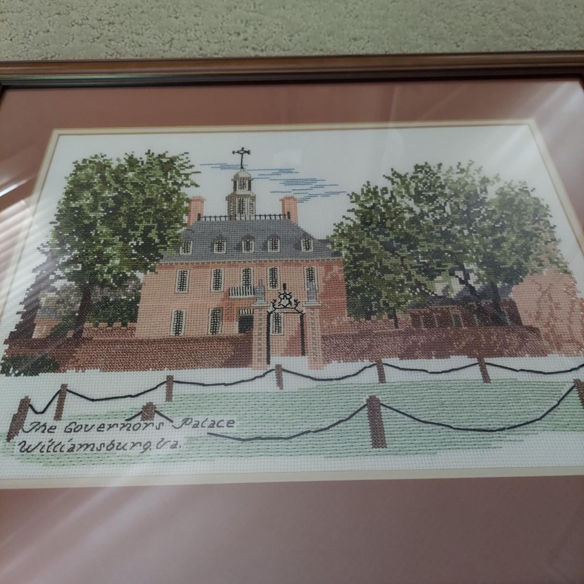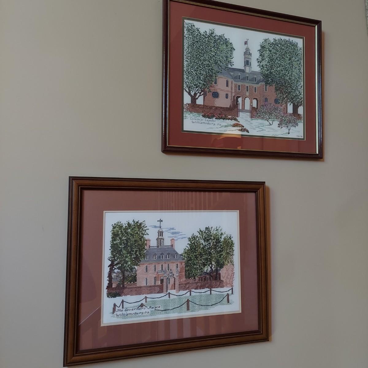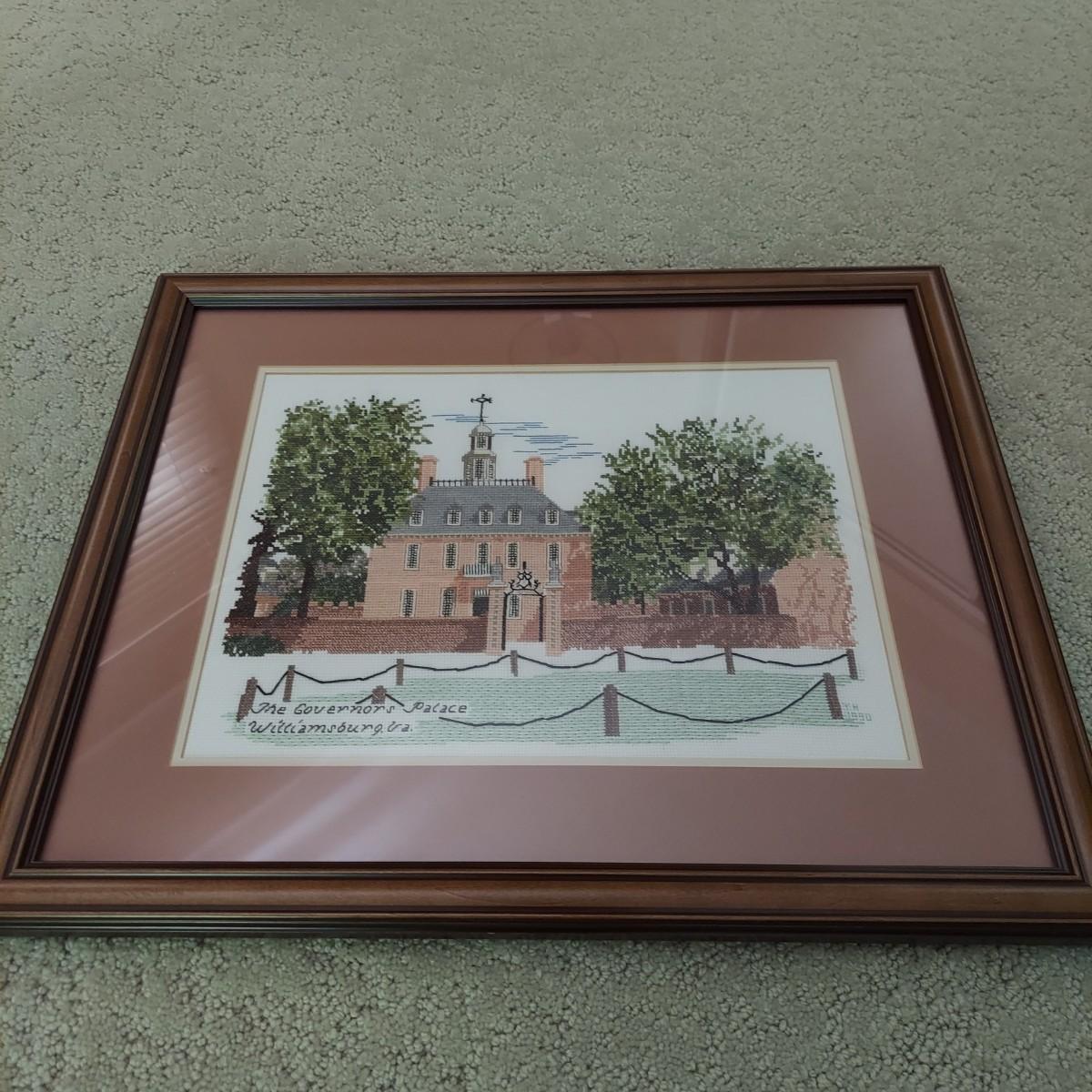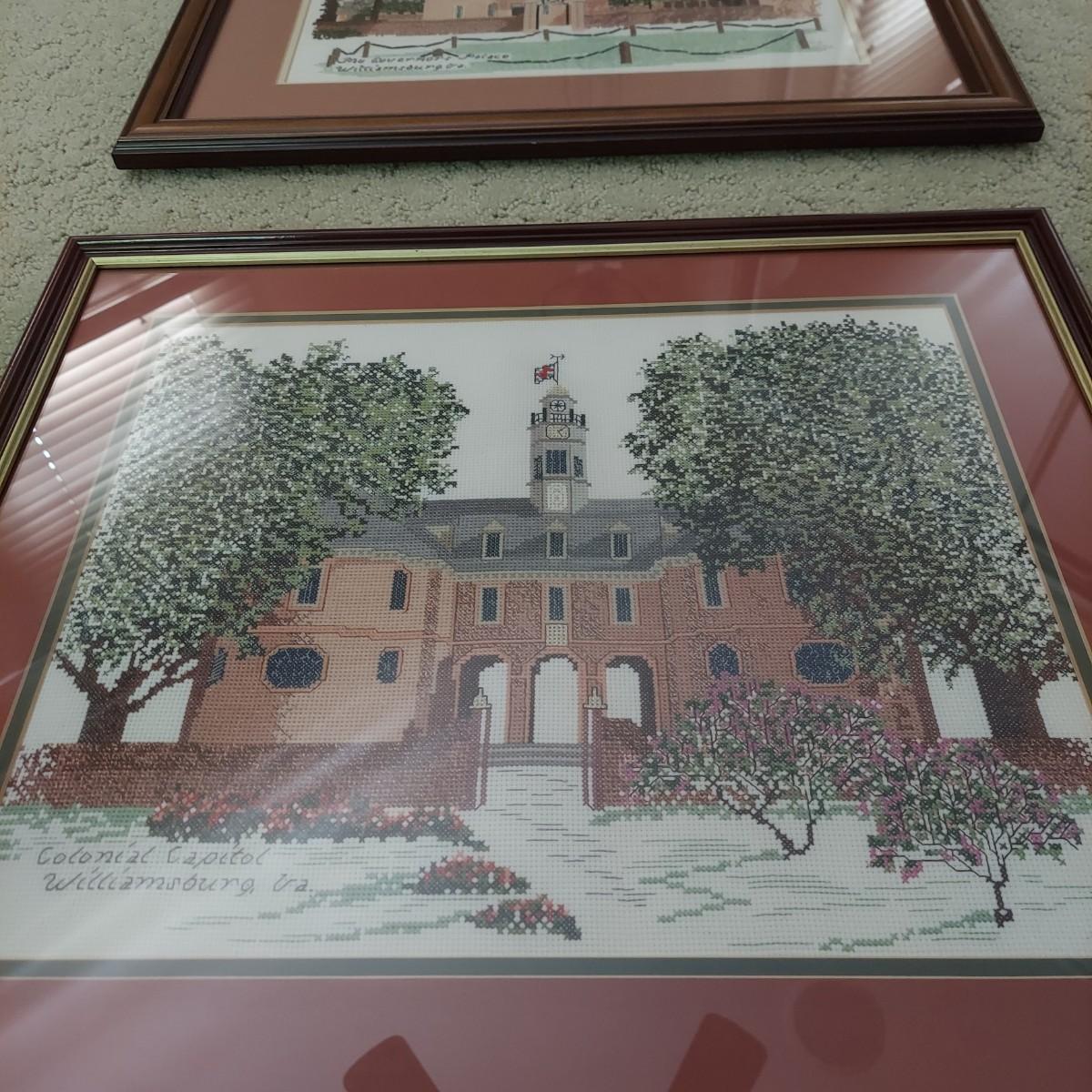 Two Colonial Williamsburg framed needlepoints. Colonial Capitol Williamsburg, VA '92 has green and red mats with red and gold frame. Measures approximately 21" x 18"H. The Governors Place Williamsburg, VA 1990 has brown and cream mats with wood frame. Measures approximately 22" x 18"H. Shipping available. Shipping art can be costly. We suggest contacting our preferred local shipping provider, Postage Express, with dimensions and getting an estimate before bidding: (828) 670-5501 or postageexpress@yahoo.com.