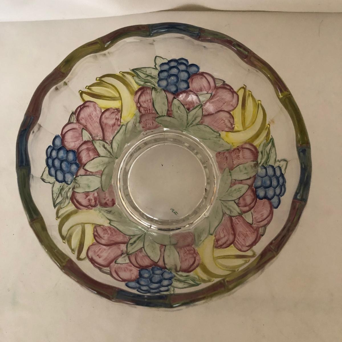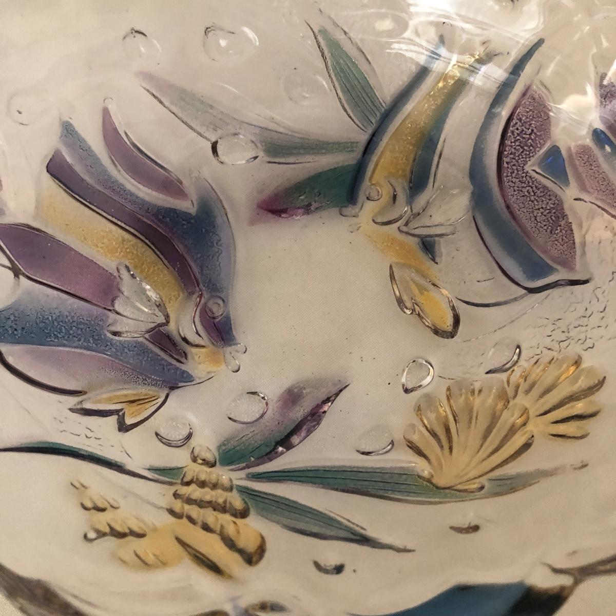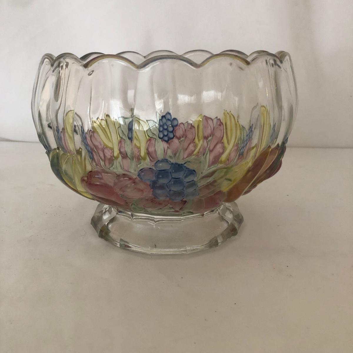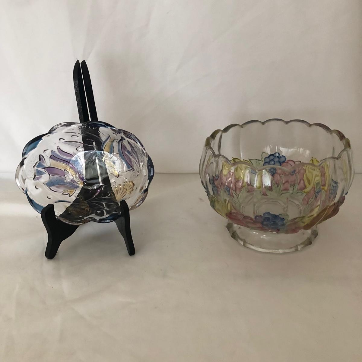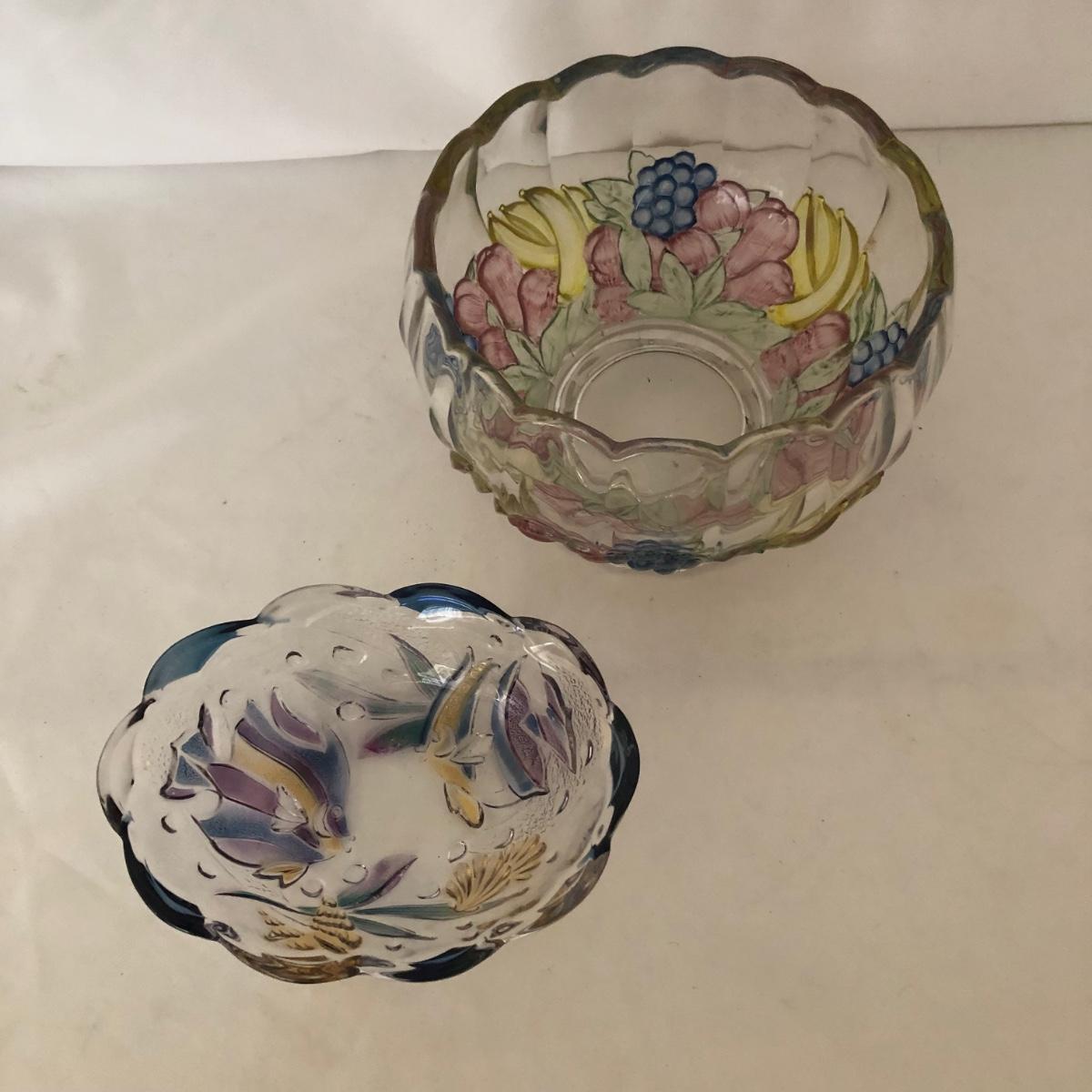 These two bowls have color designs in each bowl. The floral and fruit bowl measures 7.5” at the opening and stands 5.5” tall. The fish bowl measures 7.5” x 5.5” x 2”. Shipping Available.