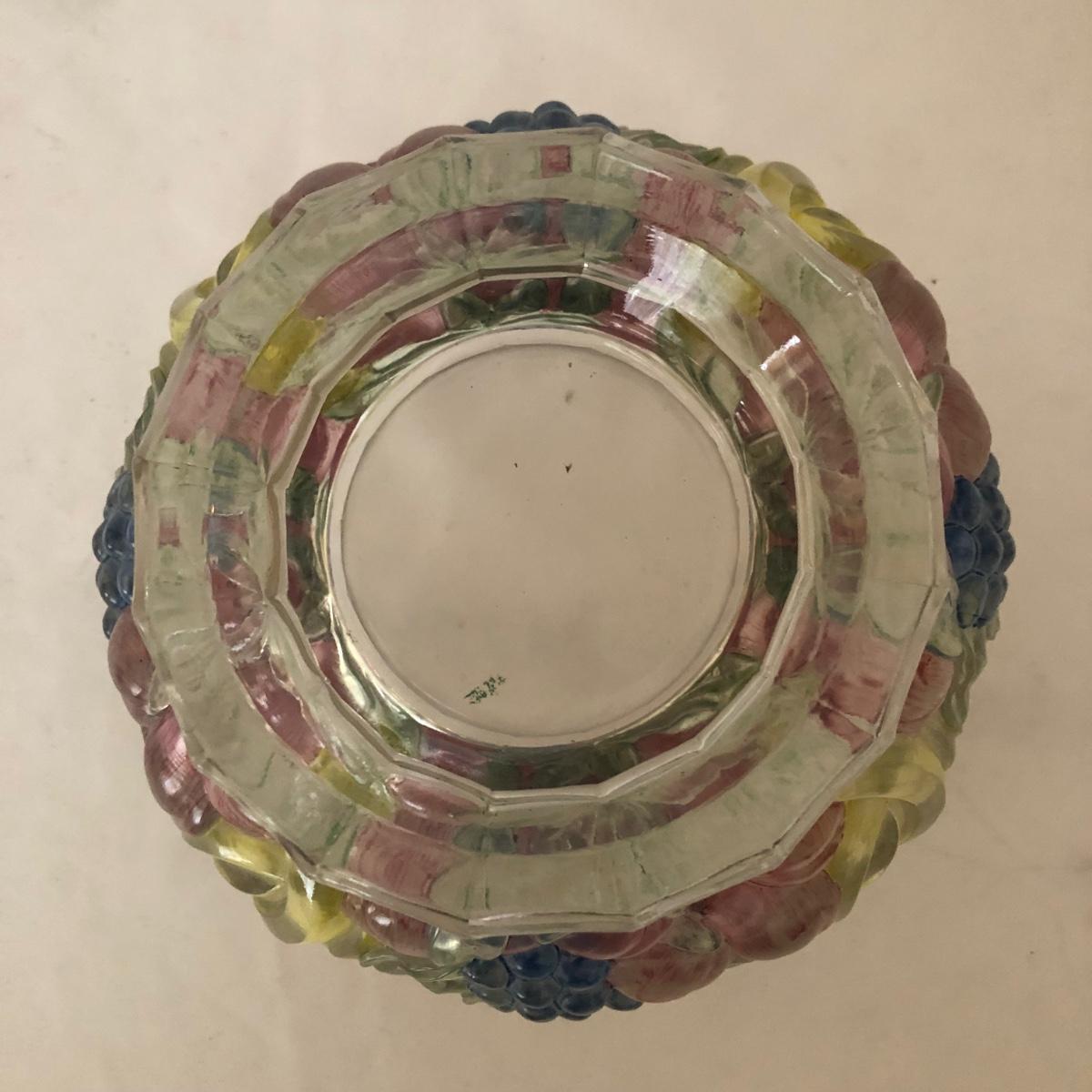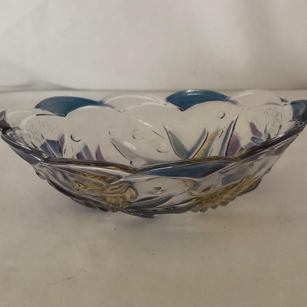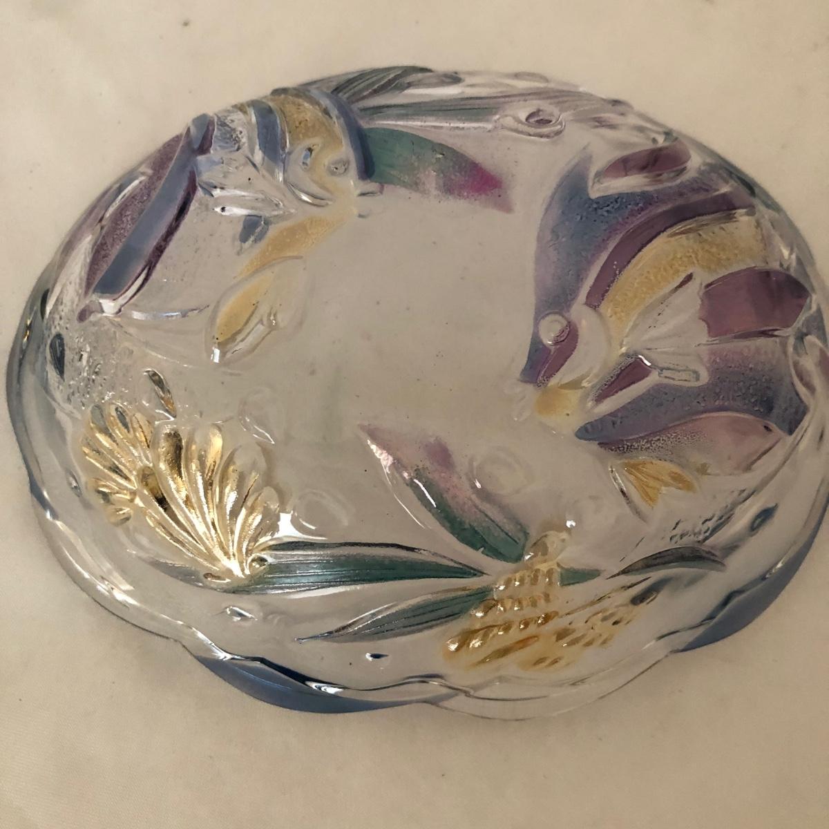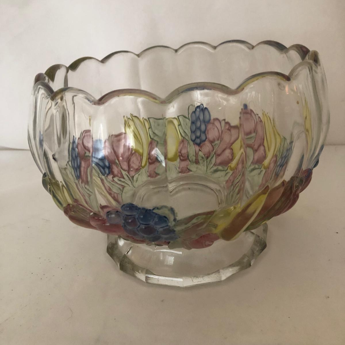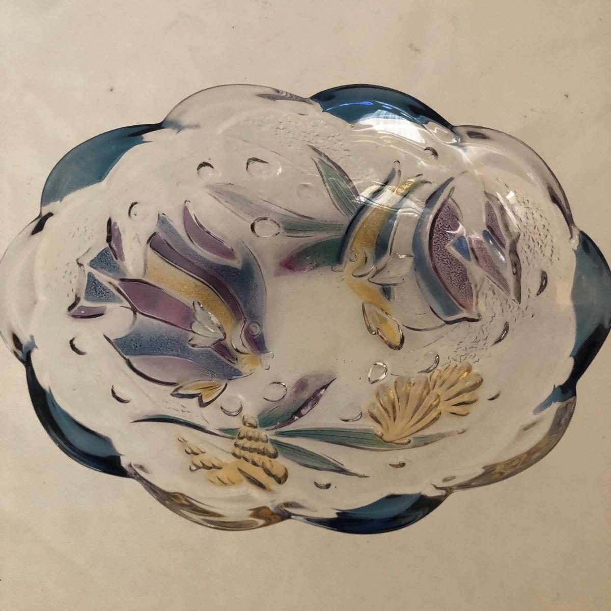 These two bowls have color designs in each bowl. The floral and fruit bowl measures 7.5” at the opening and stands 5.5” tall. The fish bowl measures 7.5” x 5.5” x 2”. Shipping Available.