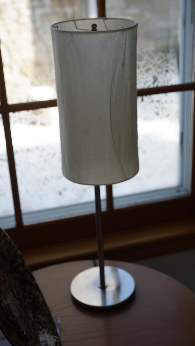 The other is a simple yet useful chrome lamp with a cloth shade. This one is for a little extra light. Not very bright. Would work well in hallway or bedroom
