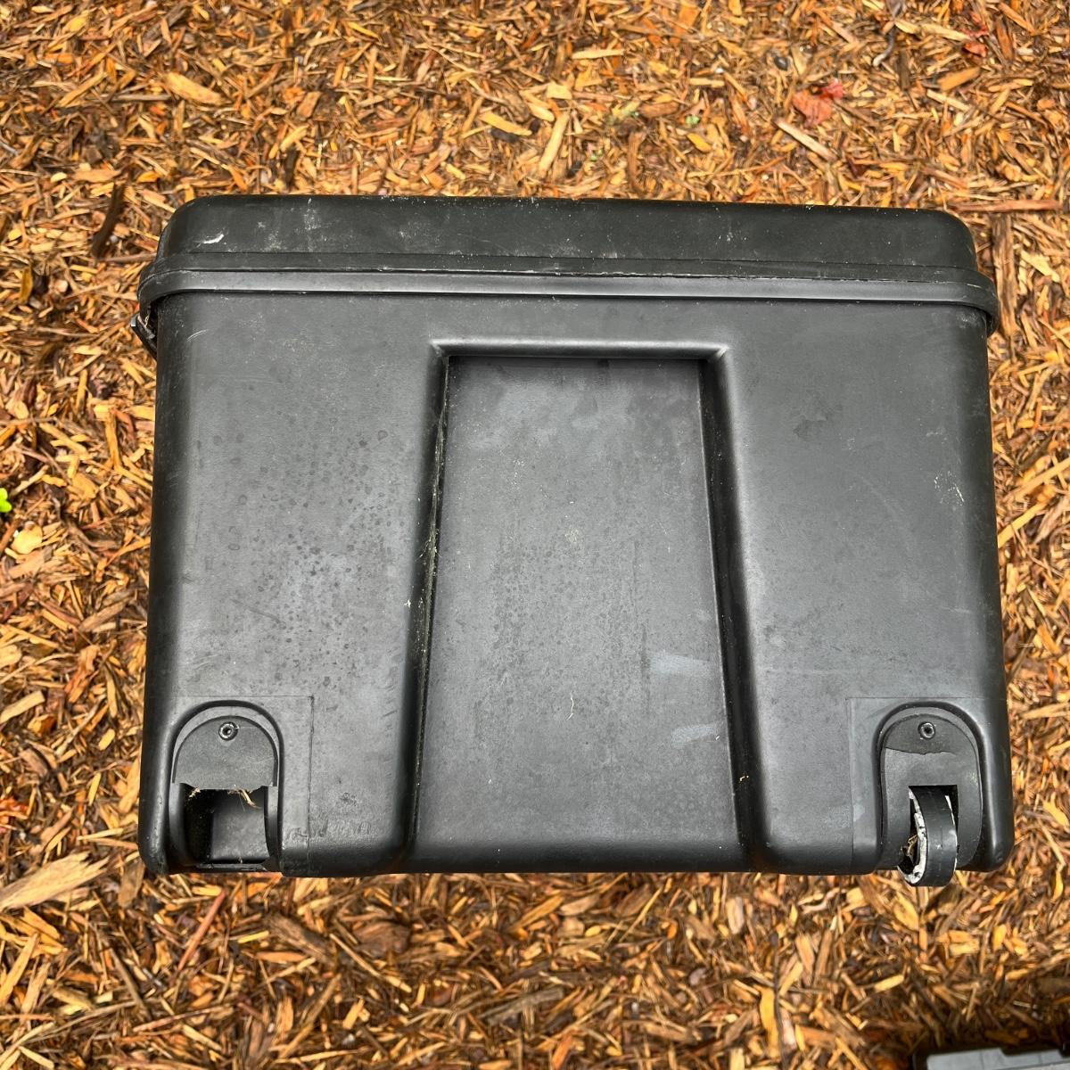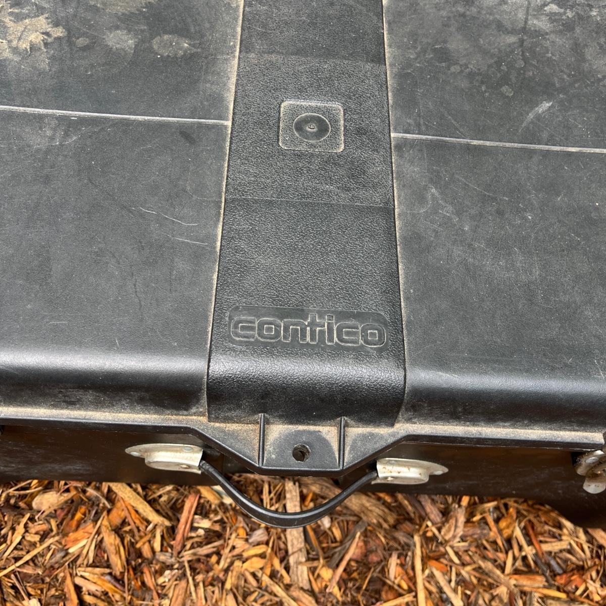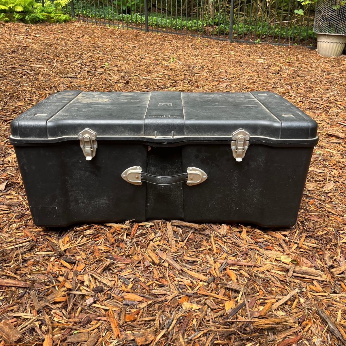 Lot includes two plastic Contico storage trunks that each measure 32” x 17” x 13”H. One trunk is missing wheel and one has broken handle, see pictures.