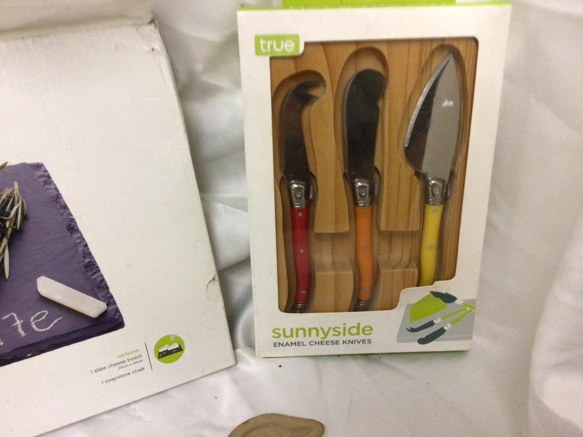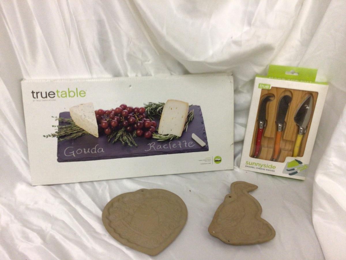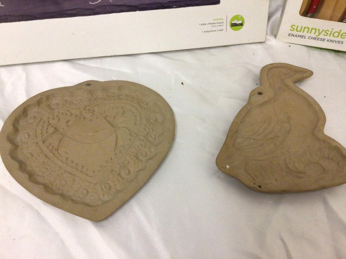 Two Cookie Molds, NIB Slate Cutting Board, Set of Four NIB Cheese Knives