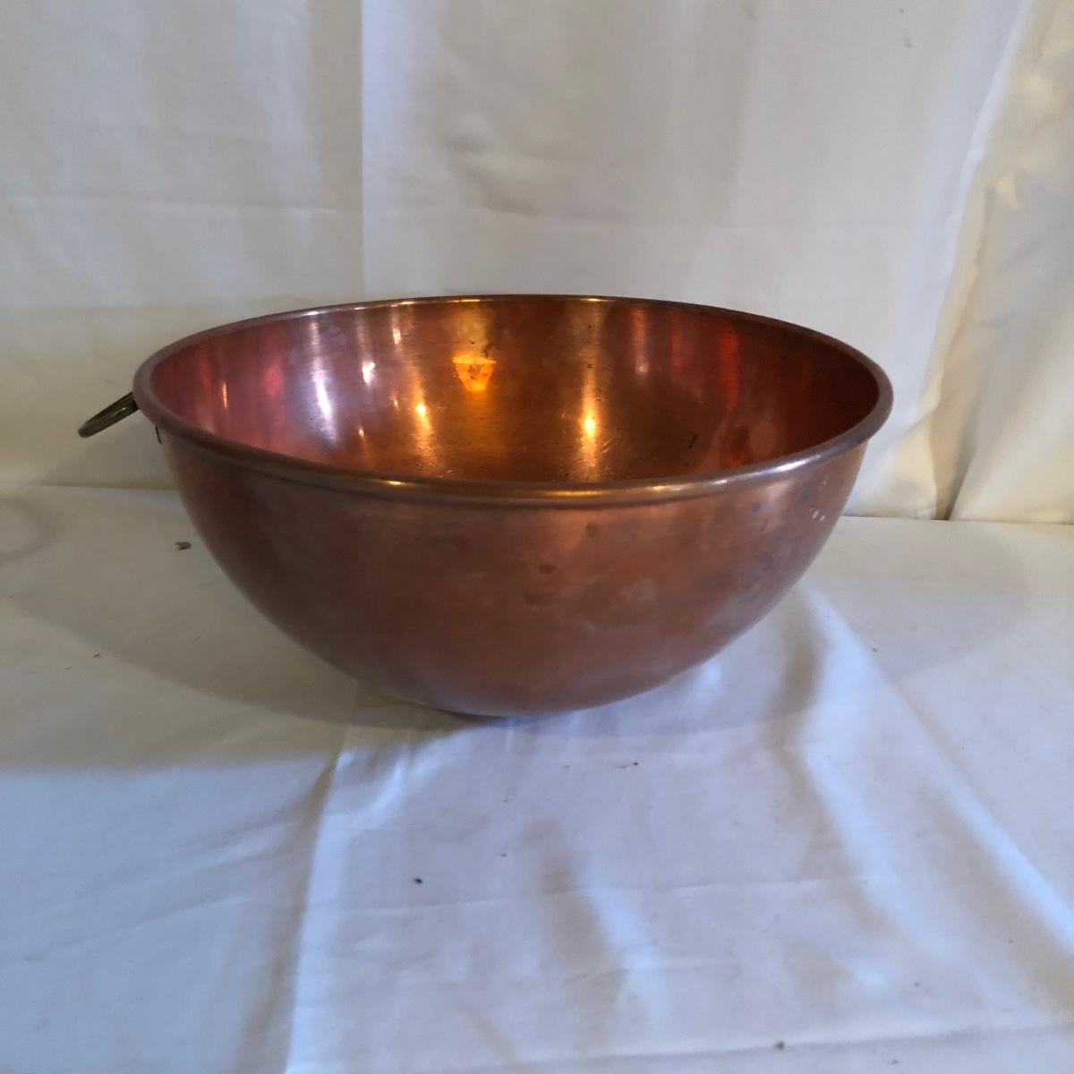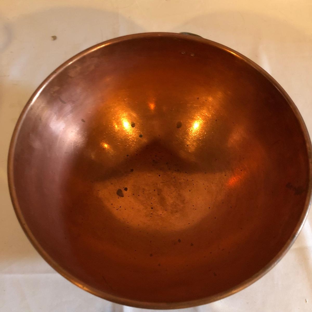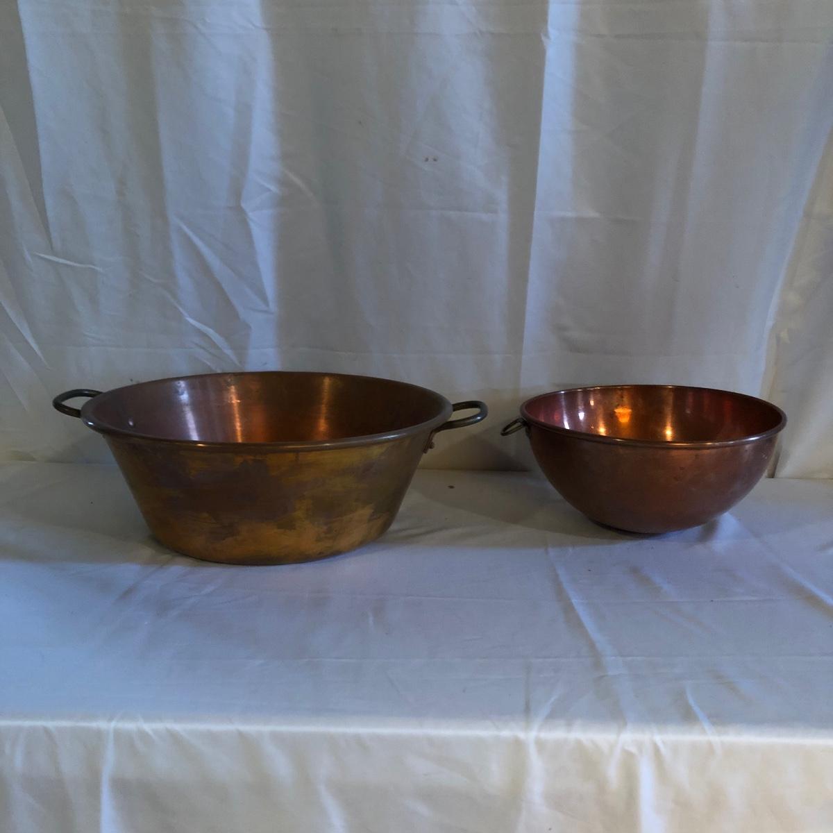 Lot includes two copper bowls, one has two riveted on handles and the other has a riveted on d ring. Largest bowl measures 14”D x 5” tall.