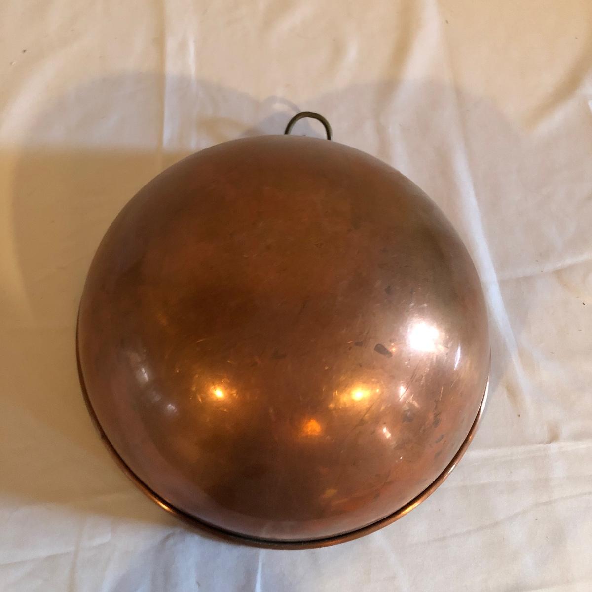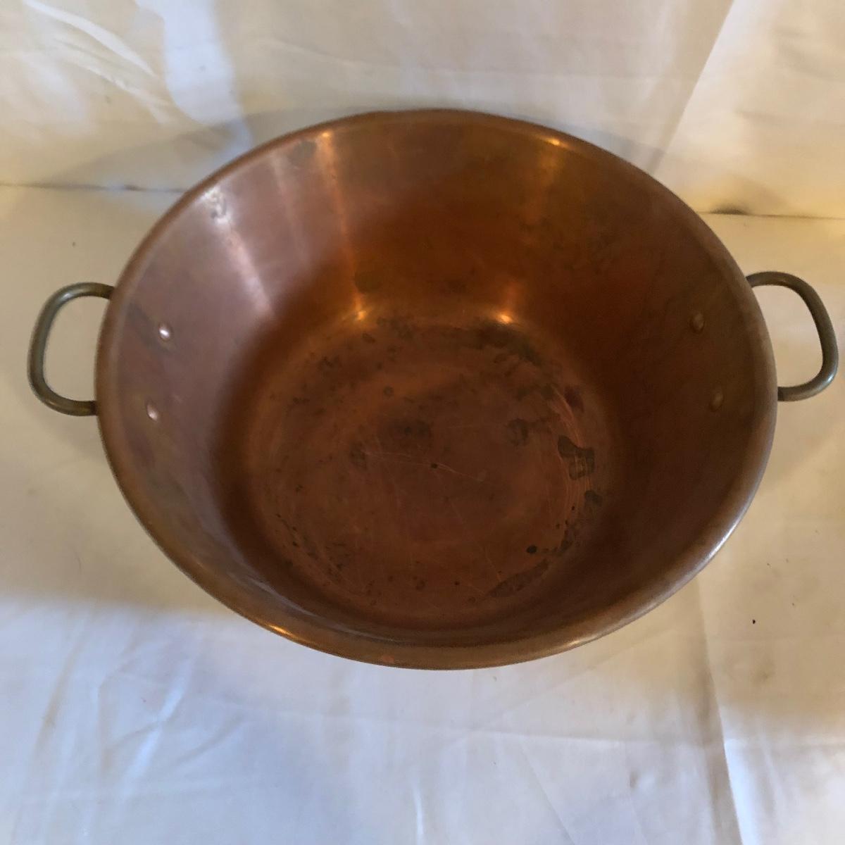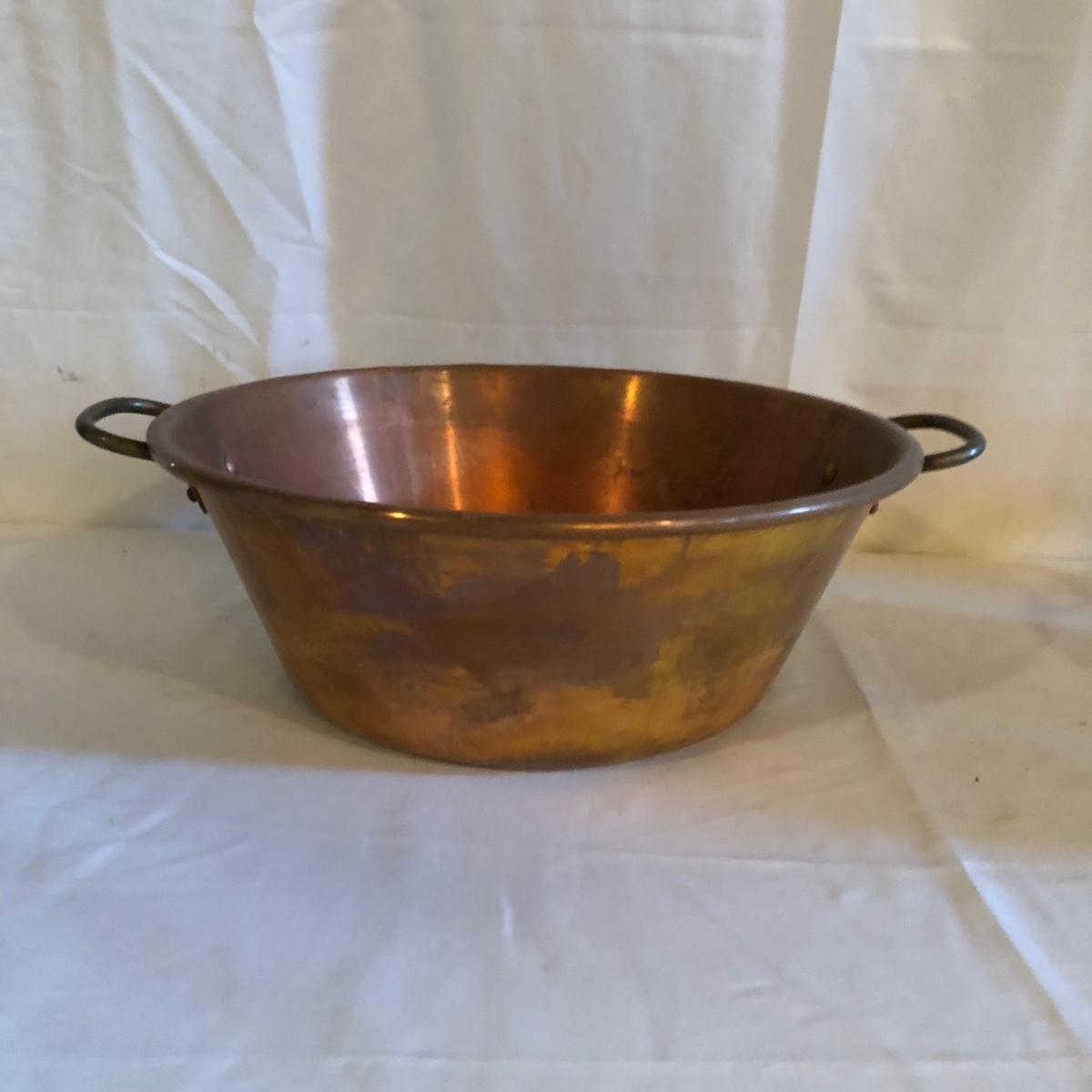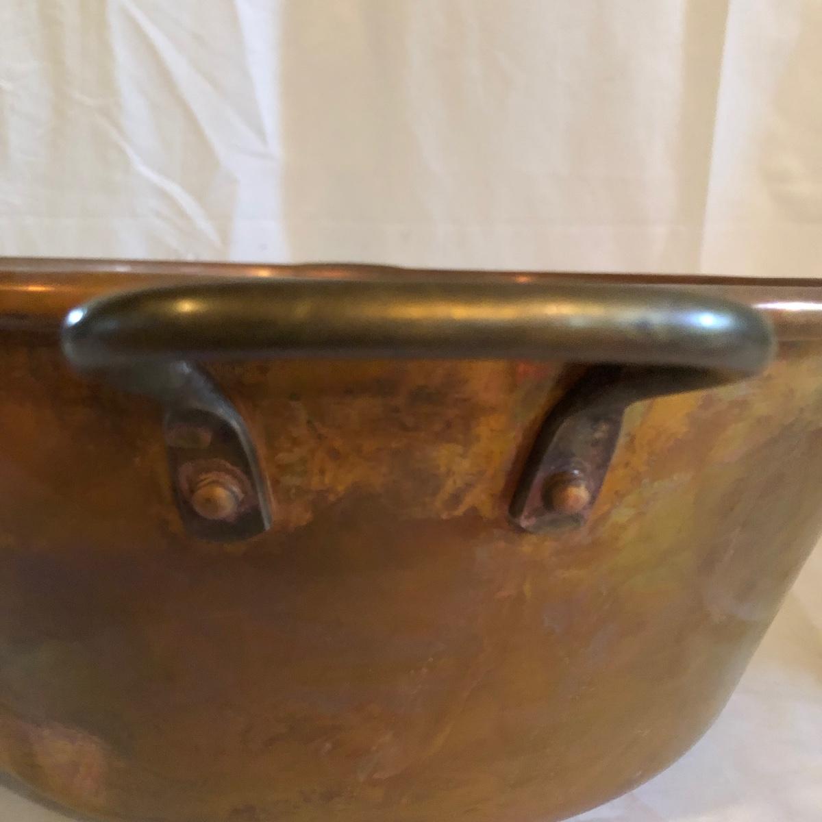Lot includes two copper bowls, one has two riveted on handles and the other has a riveted on d ring. Largest bowl measures 14”D x 5” tall.