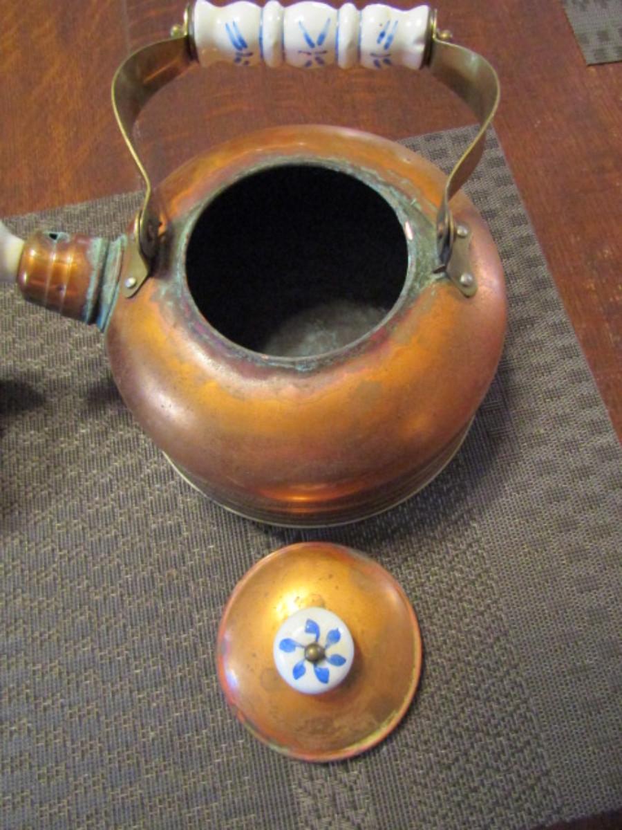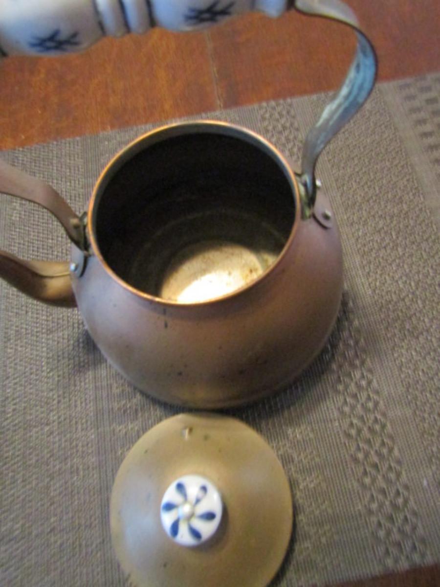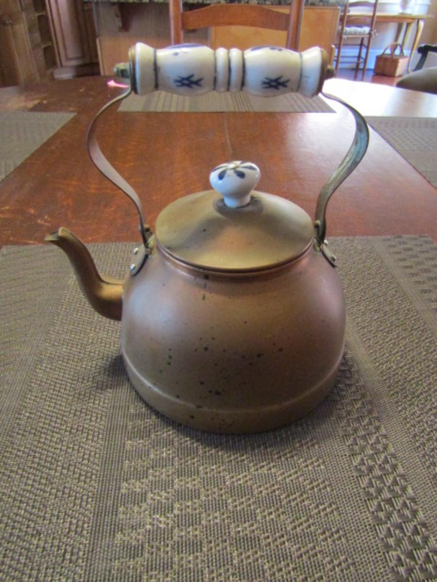 Two Copper Finished Tea Kettles. Please see all pictures- one is dented- both need polishing.