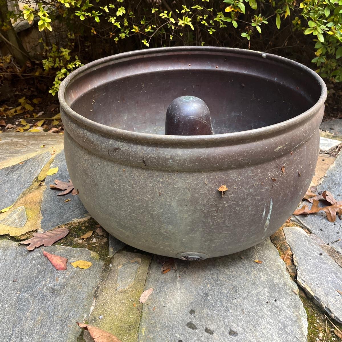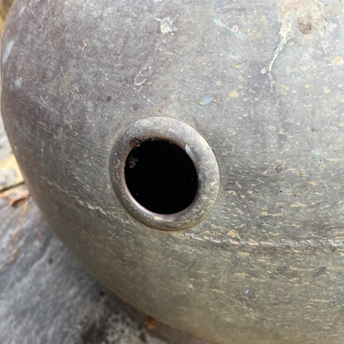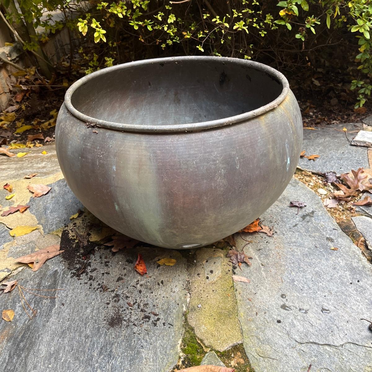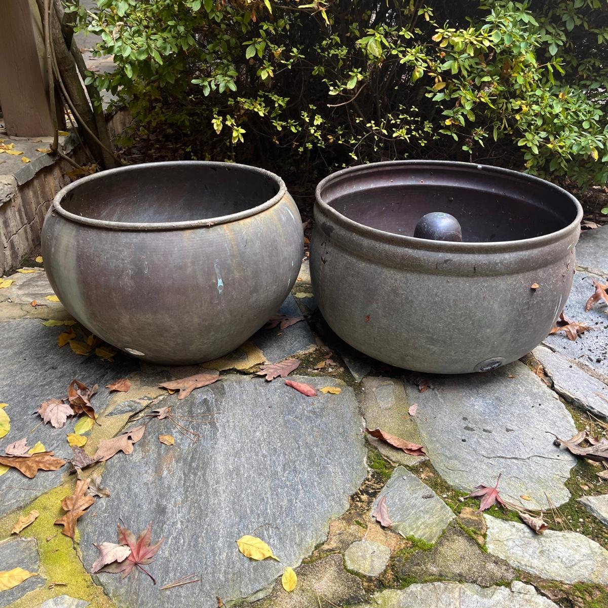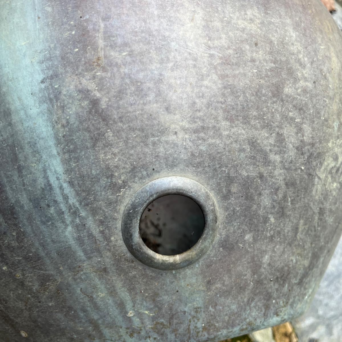 These copper hose holders have nice patina and have holes on the side for the hose to come out. Holder with center post inside has a split in it, see pictures. Largest holder measures 19”D x 12”H.