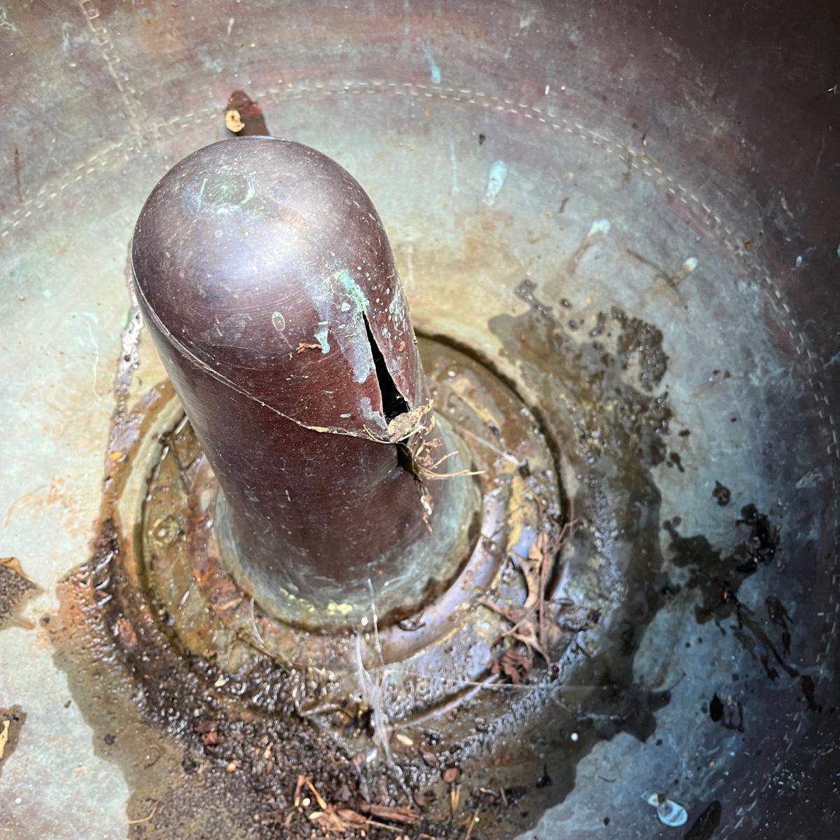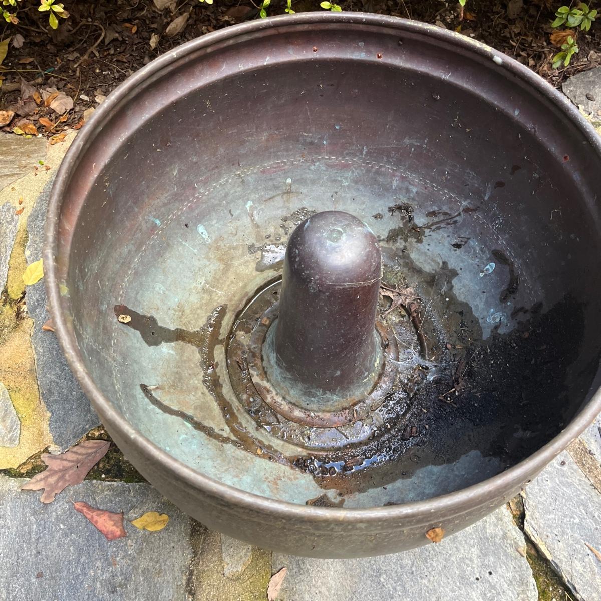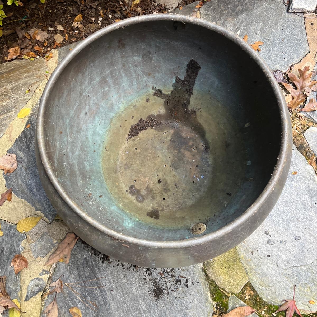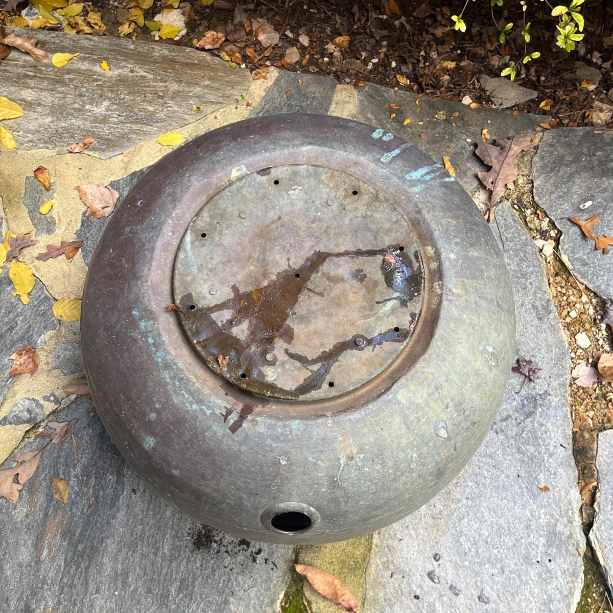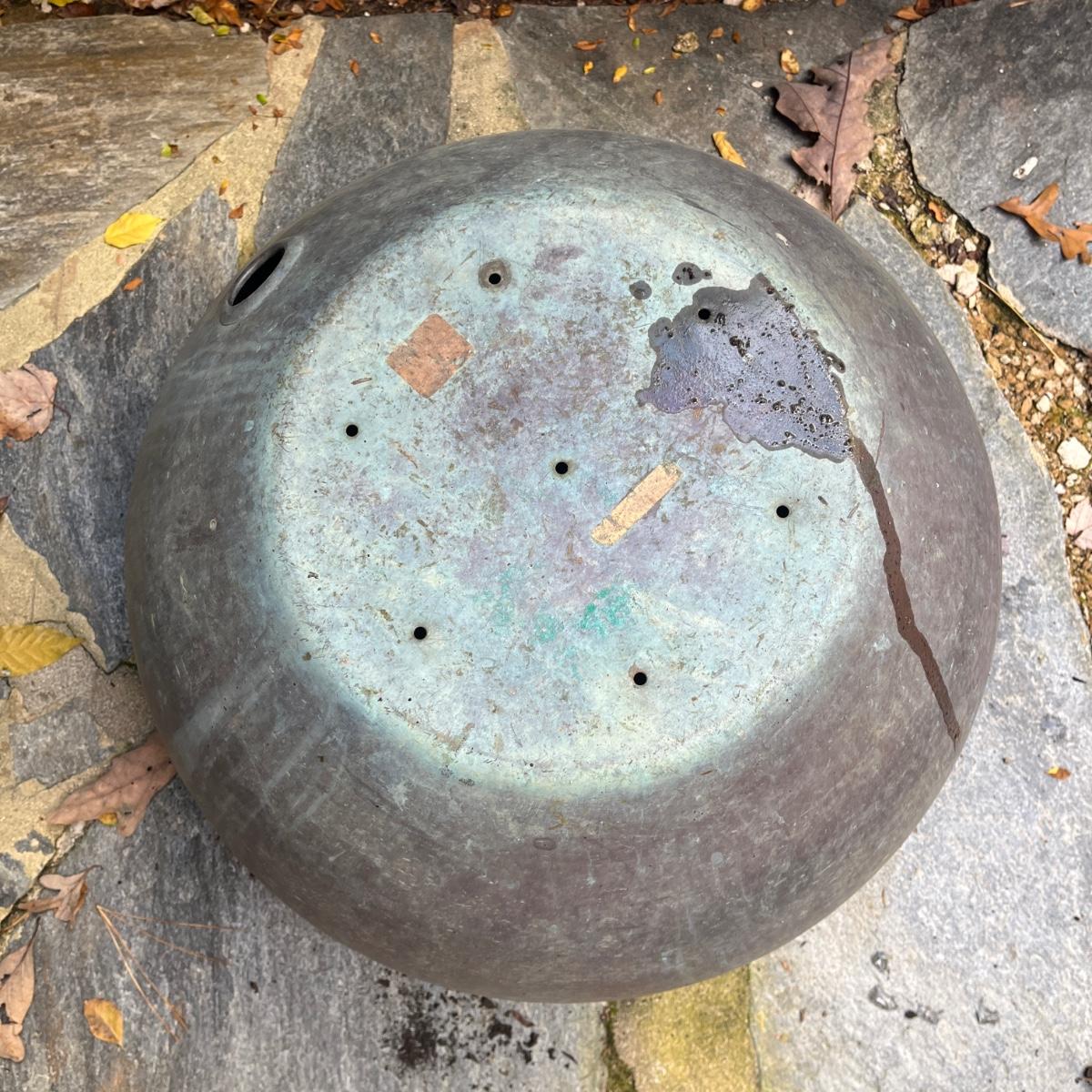 These copper hose holders have nice patina and have holes on the side for the hose to come out. Holder with center post inside has a split in it, see pictures. Largest holder measures 19”D x 12”H.