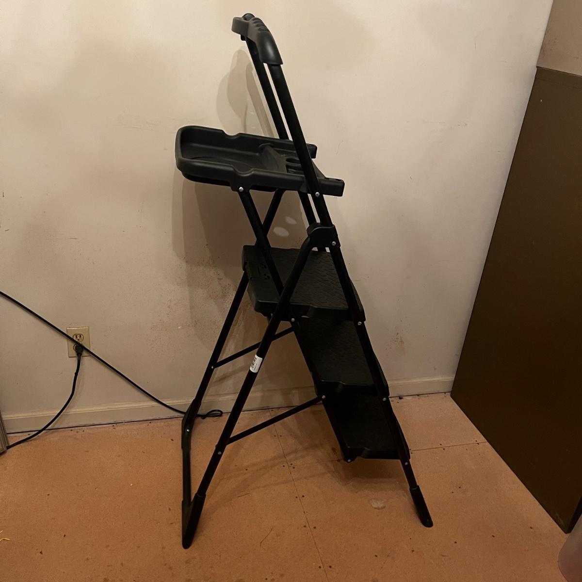 Lot includes a folding three step Cosco step stool, folding two step Cosco step stool and a folding plastic step. The three-step stool measures 31” x 22” x 56”H.
