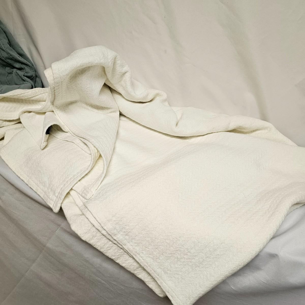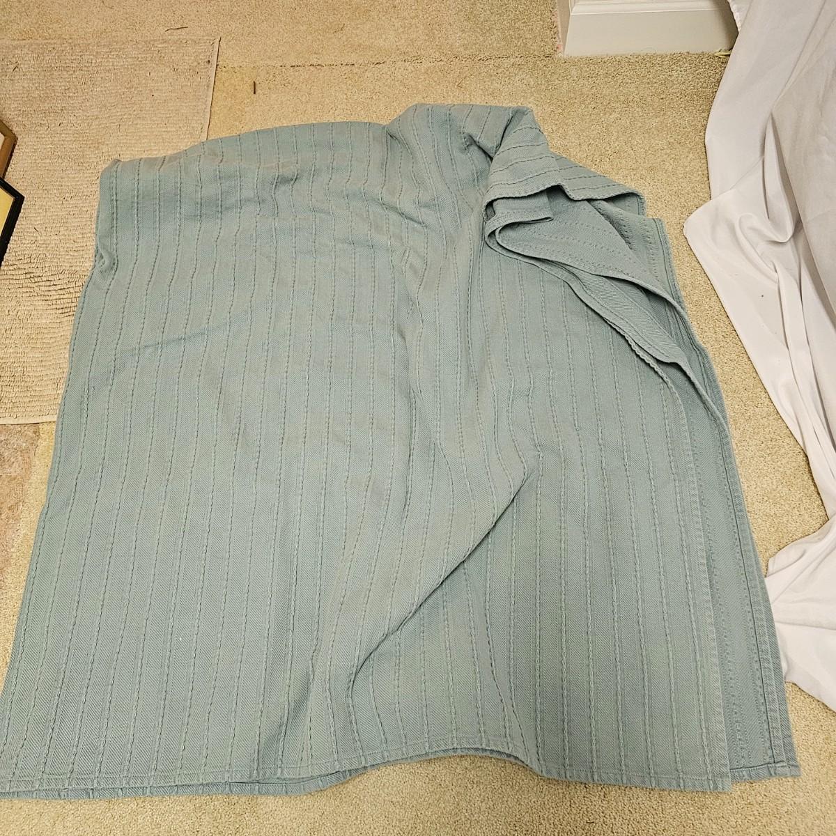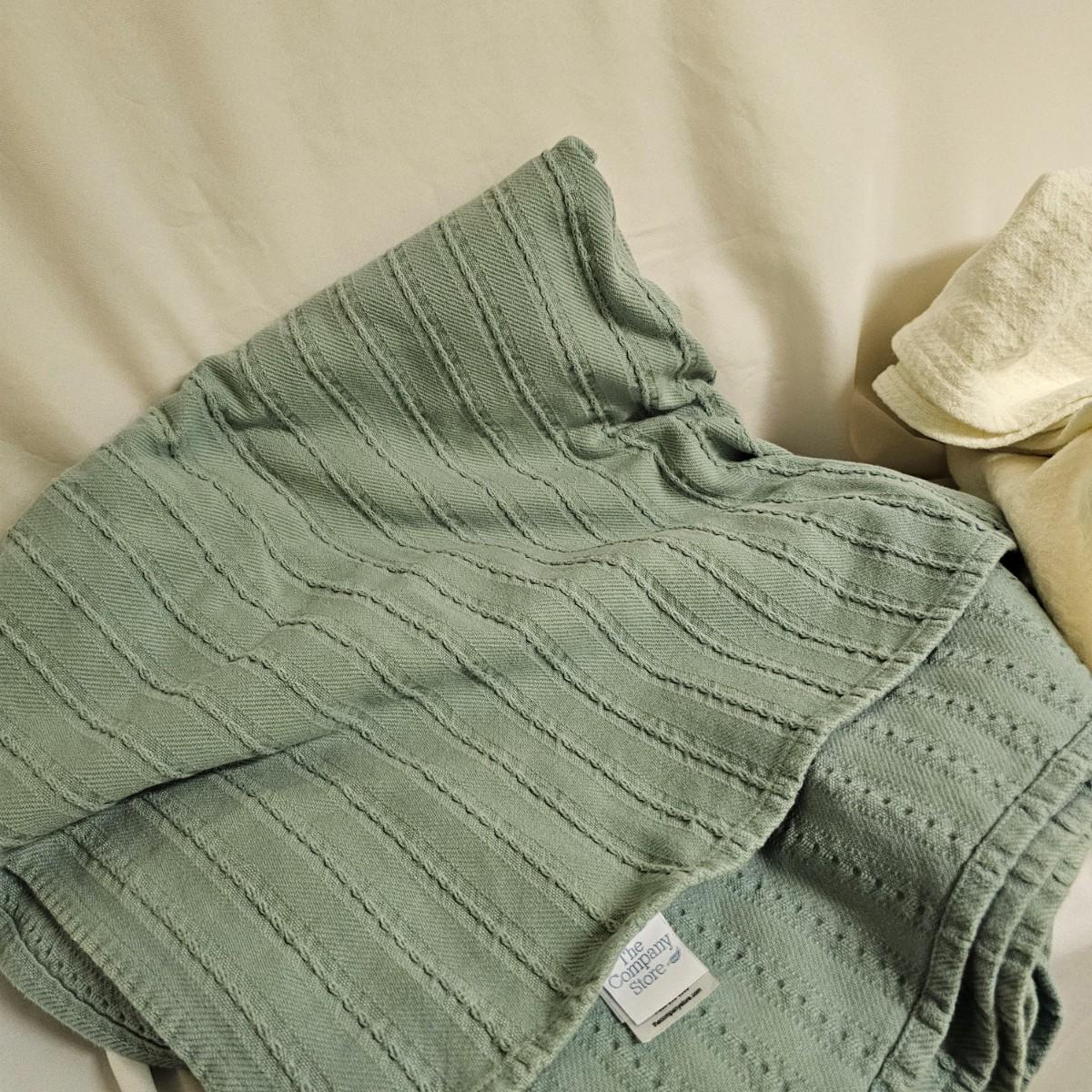 Two soft cotton blankets. Green blanket is 90" x 96" from The Company Store, is made of Egyptian cotton. Cream blanket is by Lands' End, measures 80" x 90", 100% cotton. See photos for details. Shipping available.