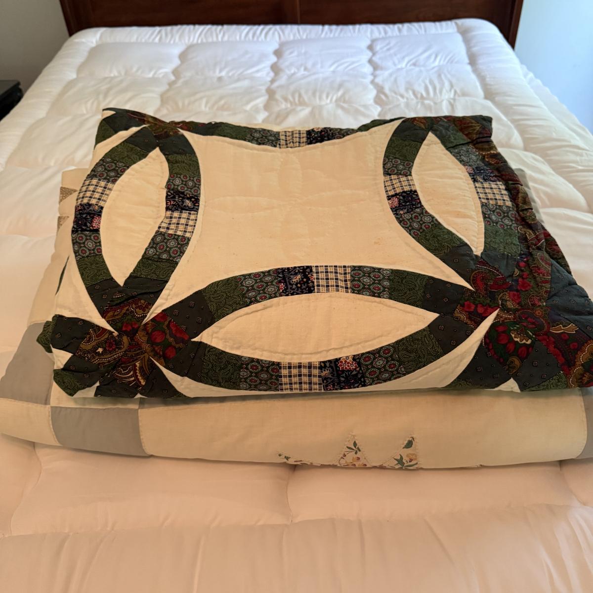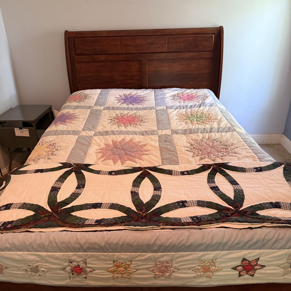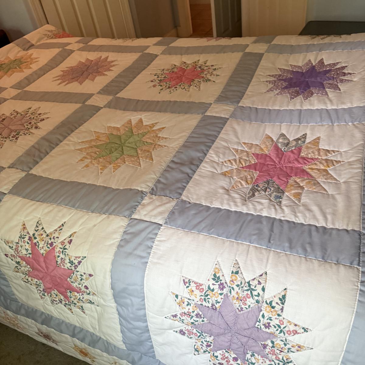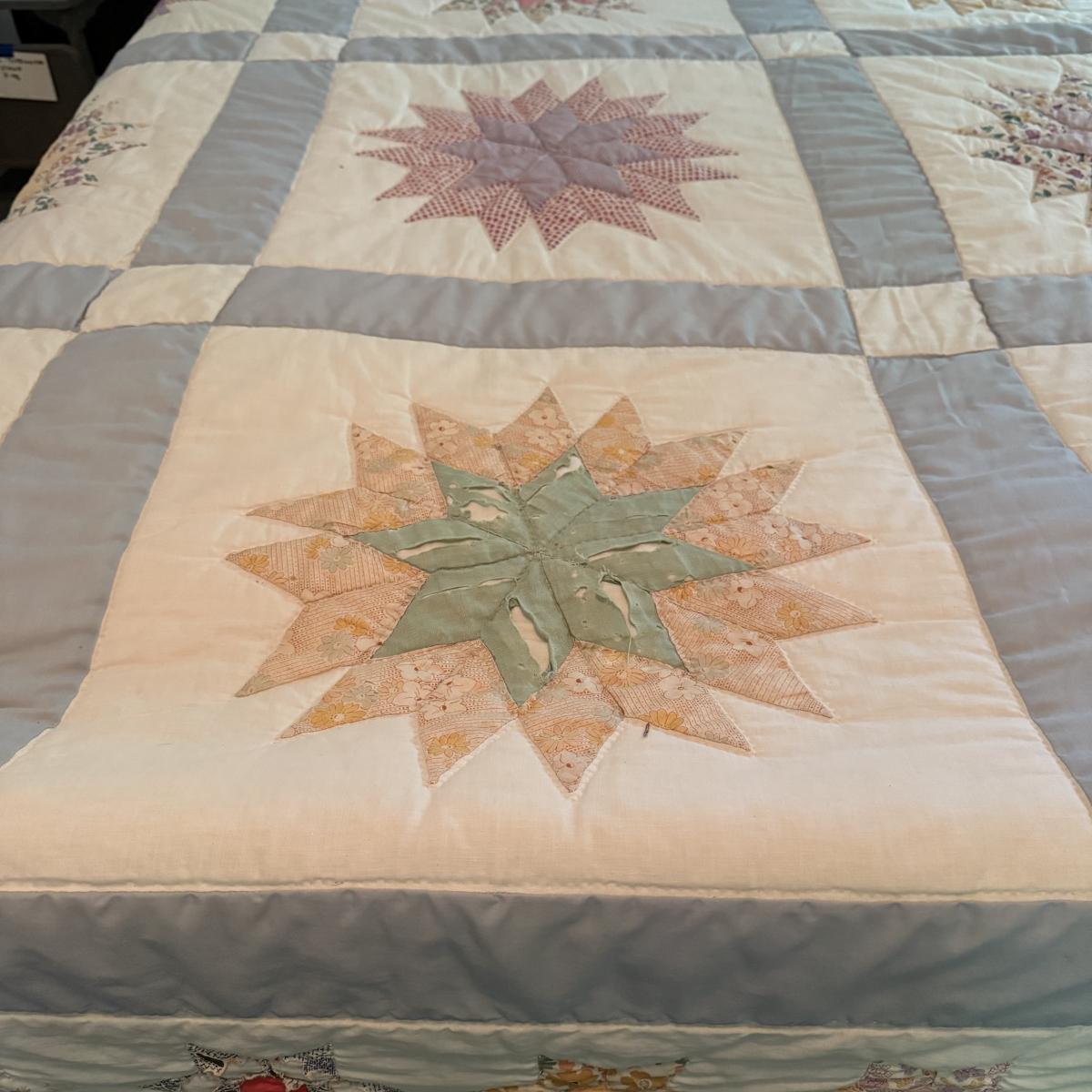 This lot contains two gorgeous quilts. The first is a stunning large pastel quilt featuring stars and measuring 104” x 104”. There are some tears in some of the fabrics in the stars, see pictures for details. The next is a slightly smaller quilt with circular designs. This piece measures 64” x 80”. Shipping available.