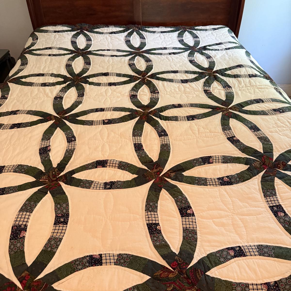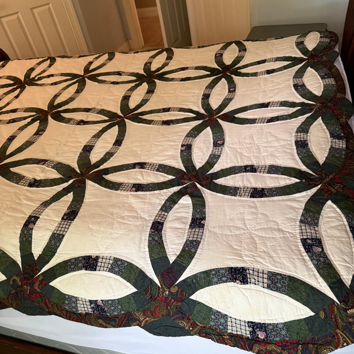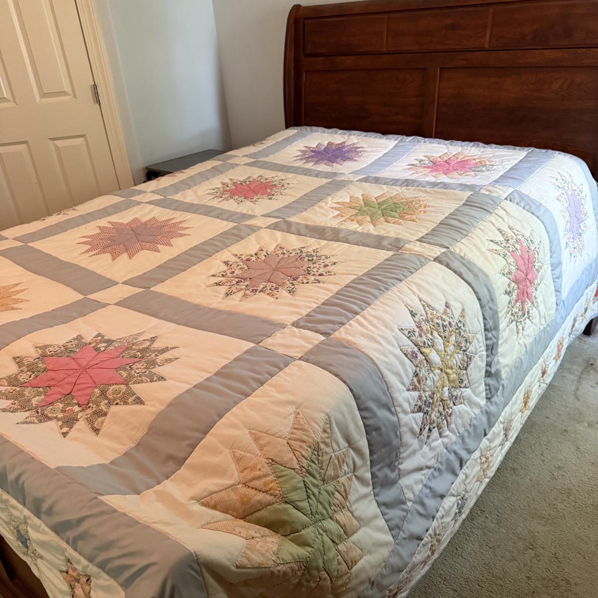 This lot contains two gorgeous quilts. The first is a stunning large pastel quilt featuring stars and measuring 104” x 104”. There are some tears in some of the fabrics in the stars, see pictures for details. The next is a slightly smaller quilt with circular designs. This piece measures 64” x 80”. Shipping available.