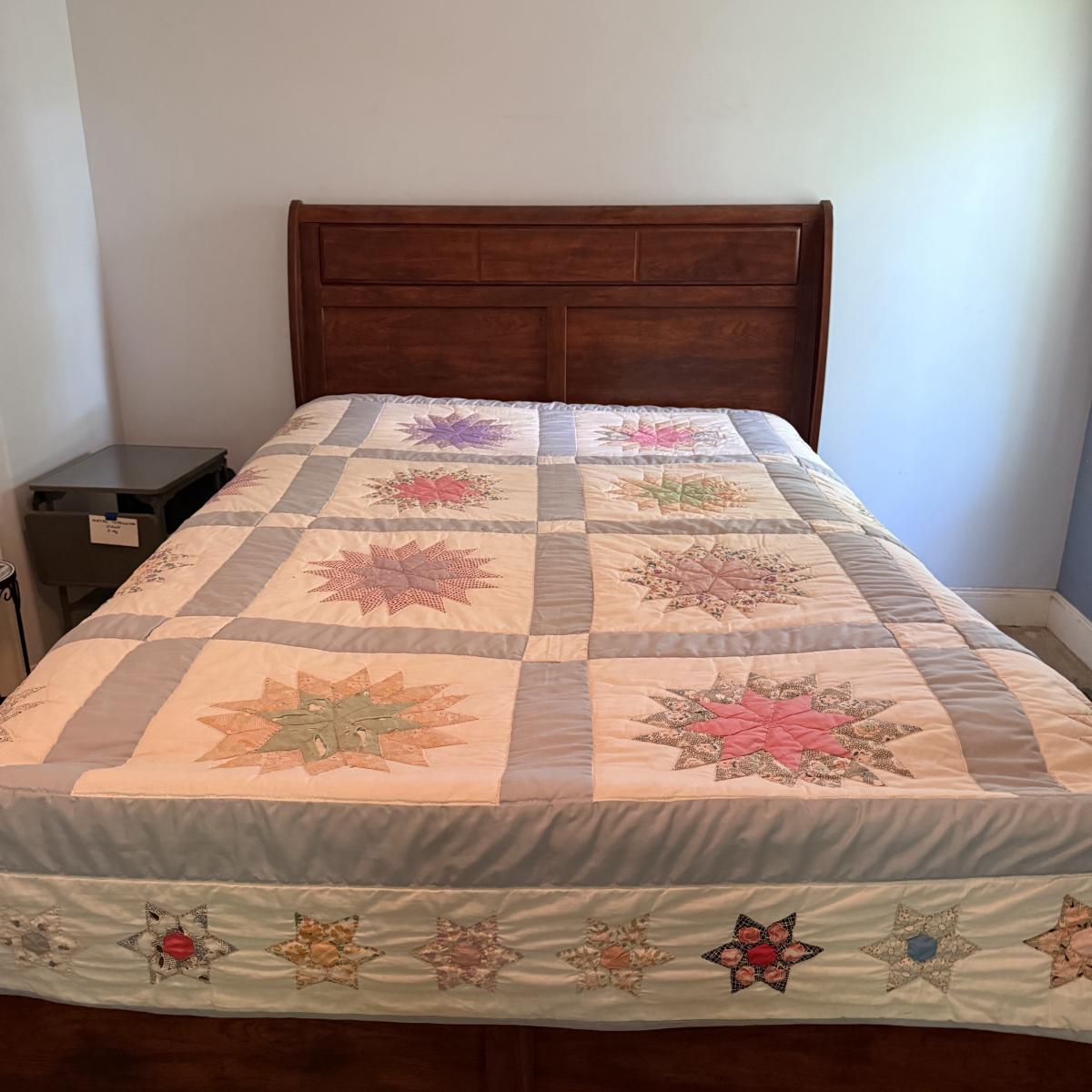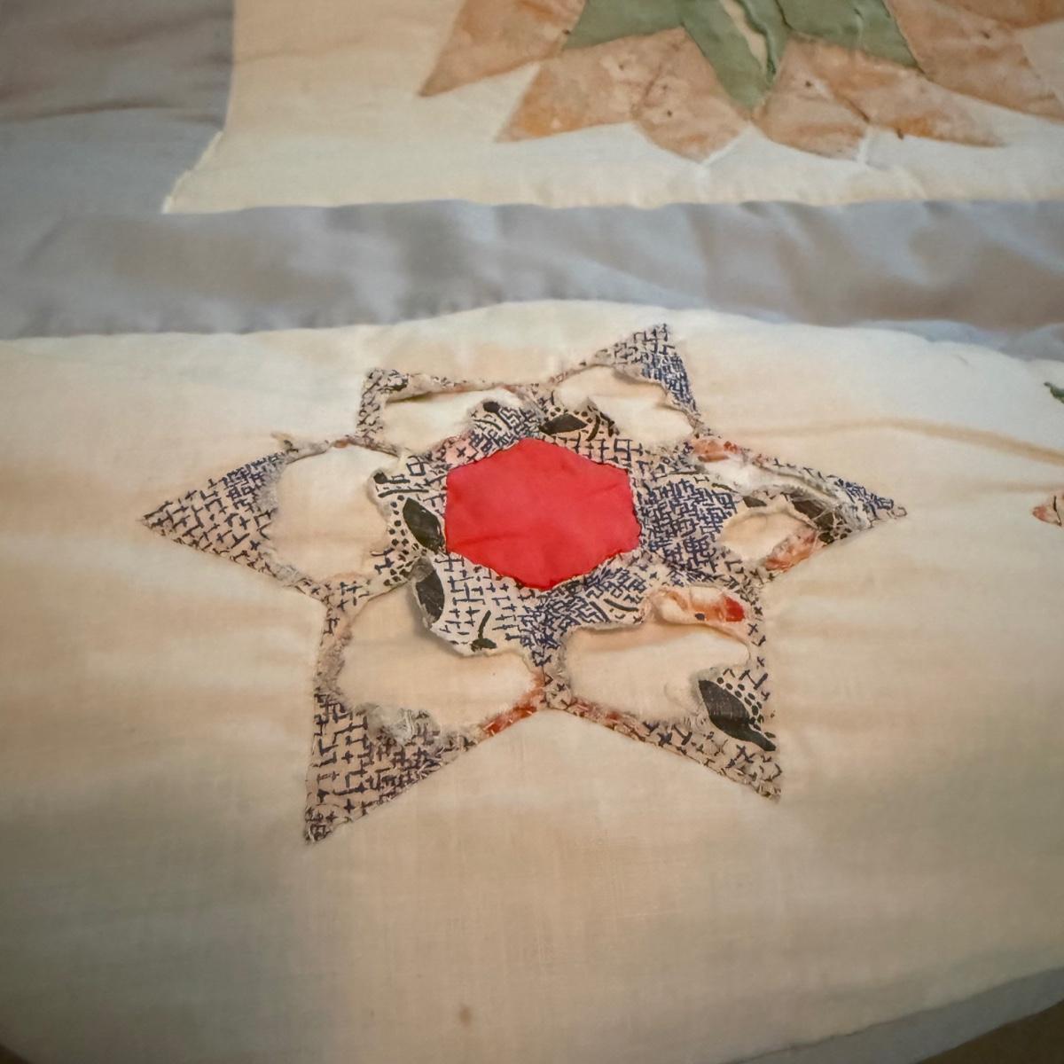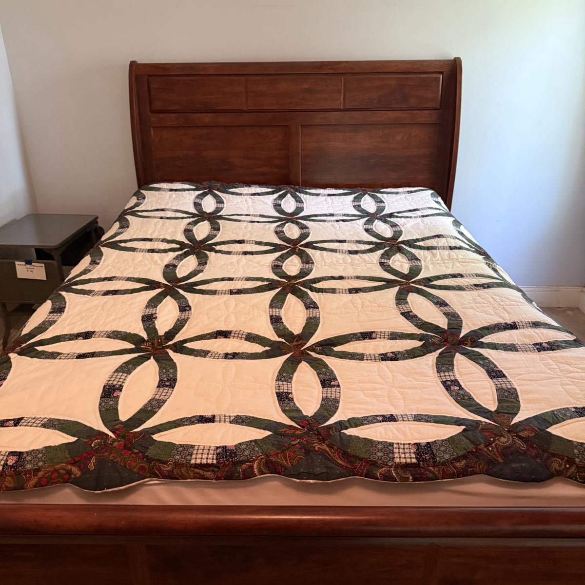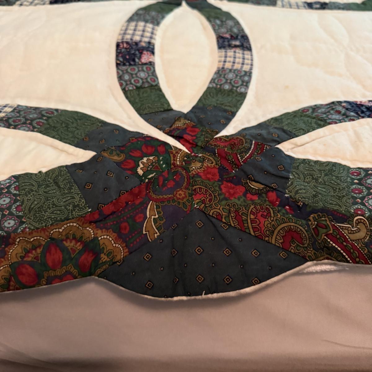 This lot contains two gorgeous quilts. The first is a stunning large pastel quilt featuring stars and measuring 104” x 104”. There are some tears in some of the fabrics in the stars, see pictures for details. The next is a slightly smaller quilt with circular designs. This piece measures 64” x 80”. Shipping available.