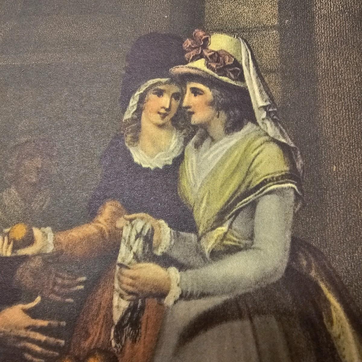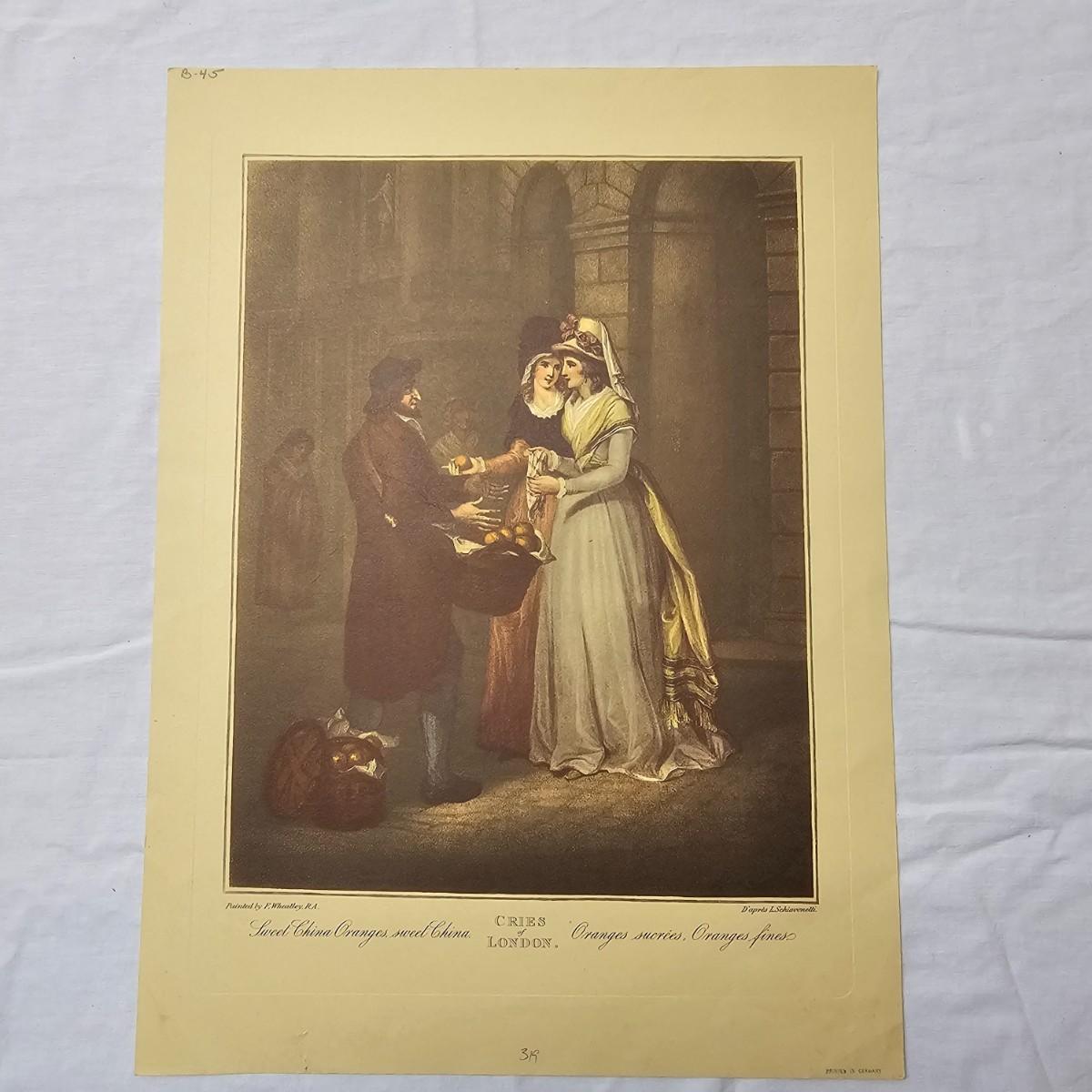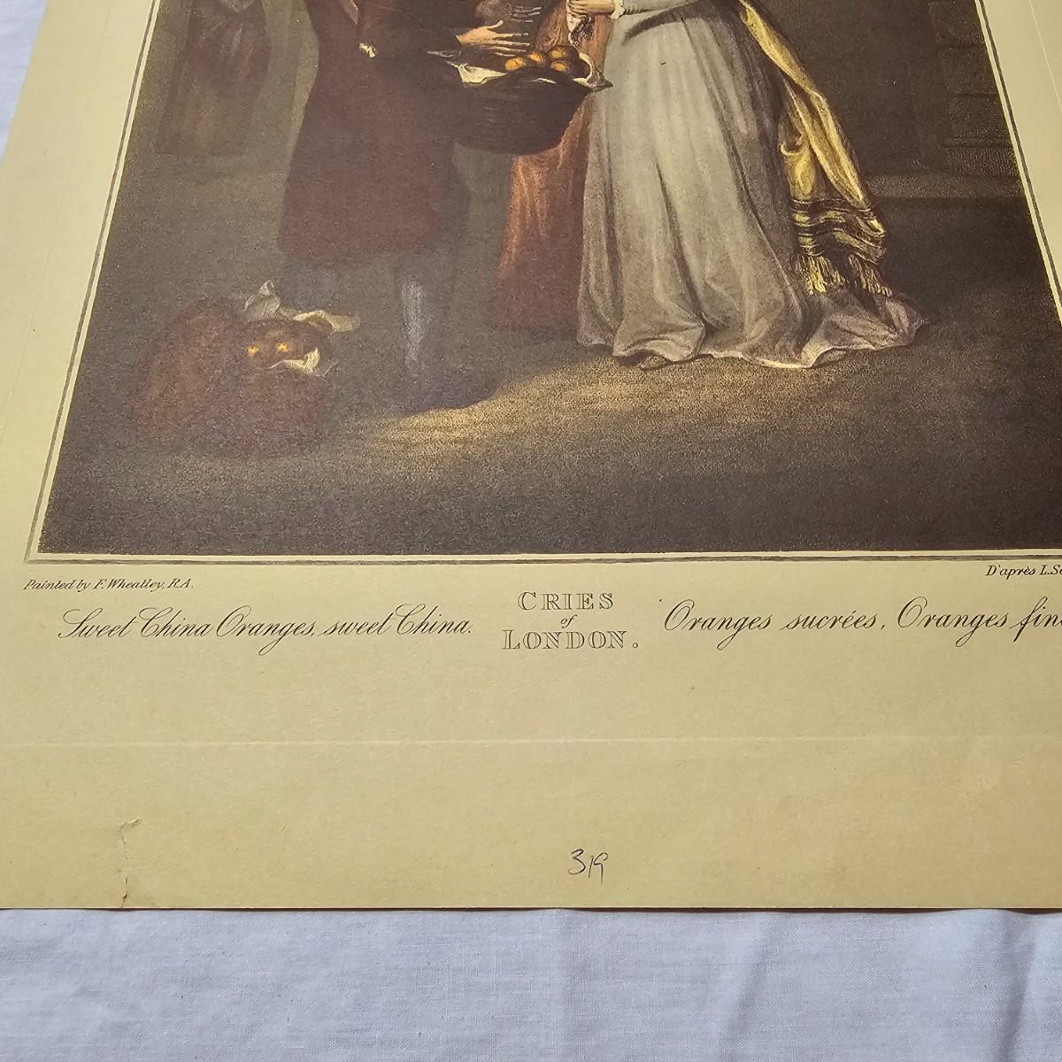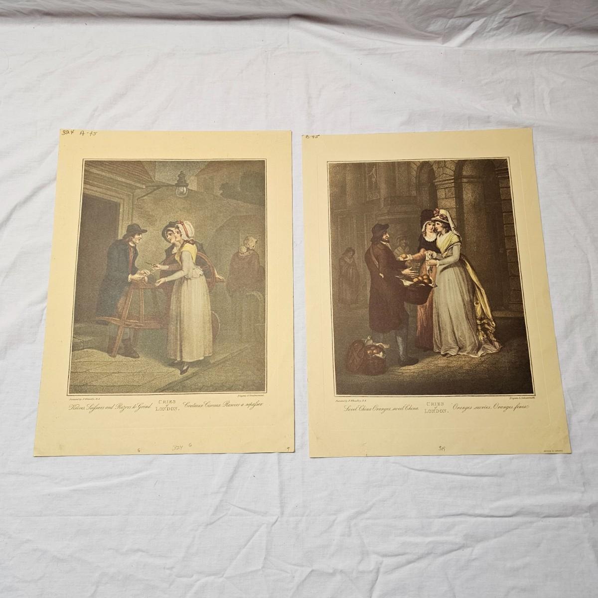 A pair of vintage prints of London town life, depicting commerce between town people and vendors. Both items say painted by F. Wheatley, R.A. Prints measure 11.75"W x 16"H. Some discoloring on edges. See photos for details. Shipping available.