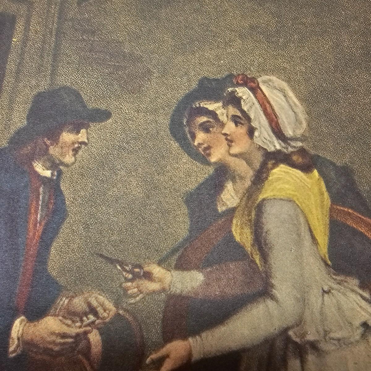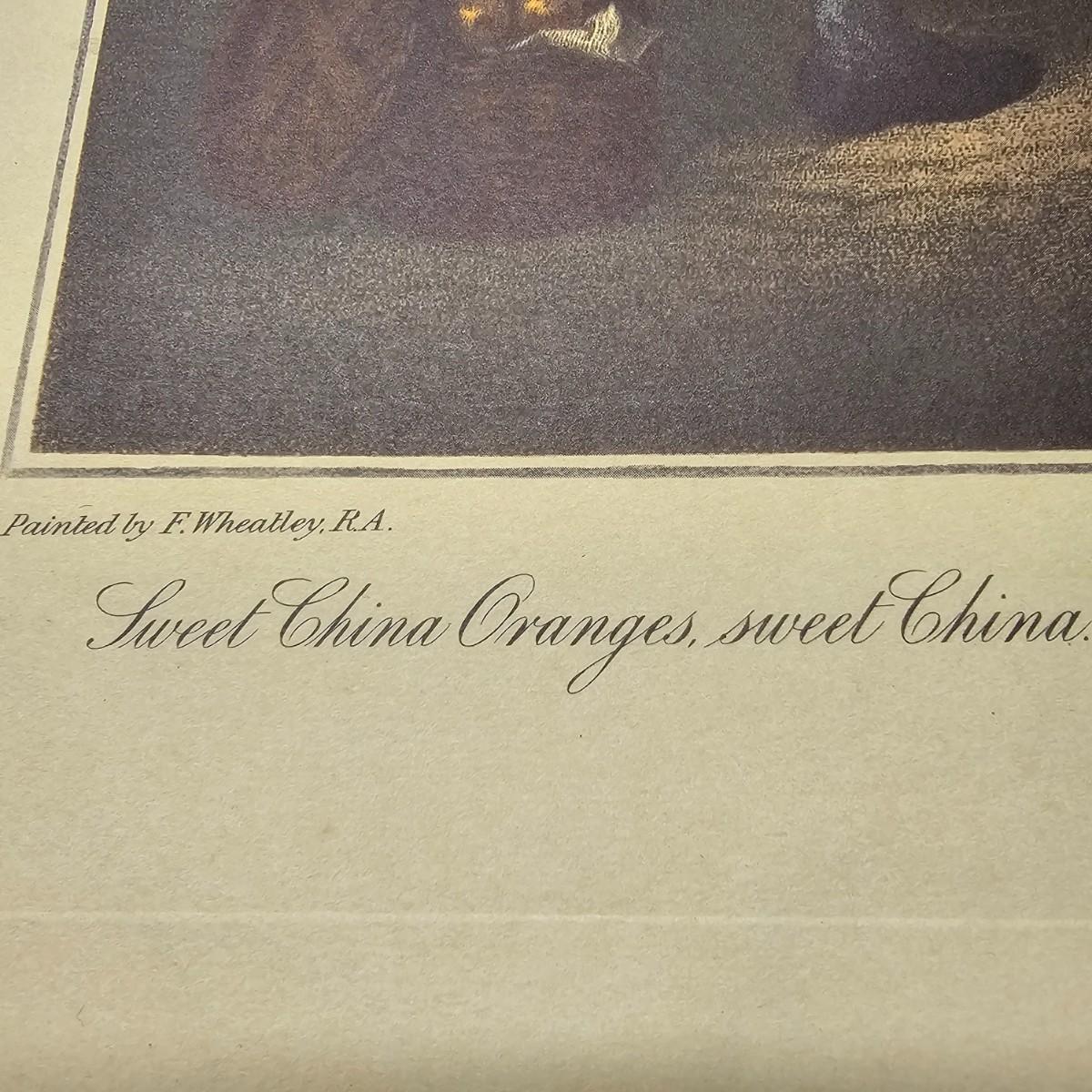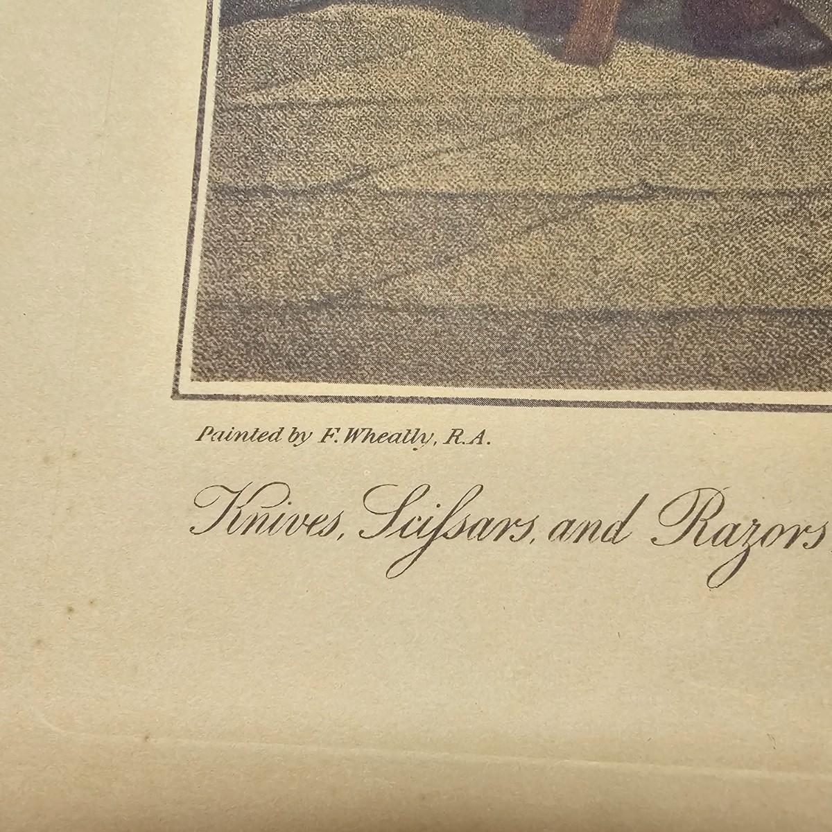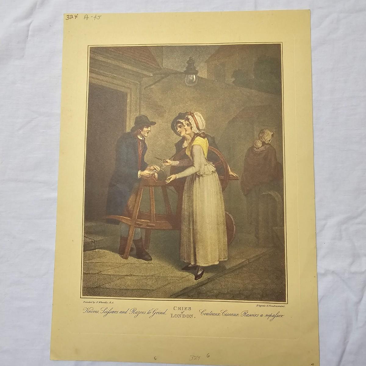 A pair of vintage prints of London town life, depicting commerce between town people and vendors. Both items say painted by F. Wheatley, R.A. Prints measure 11.75"W x 16"H. Some discoloring on edges. See photos for details. Shipping available.