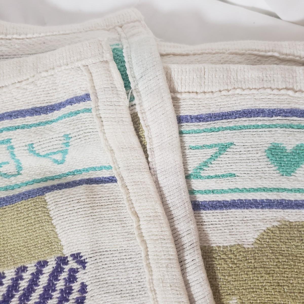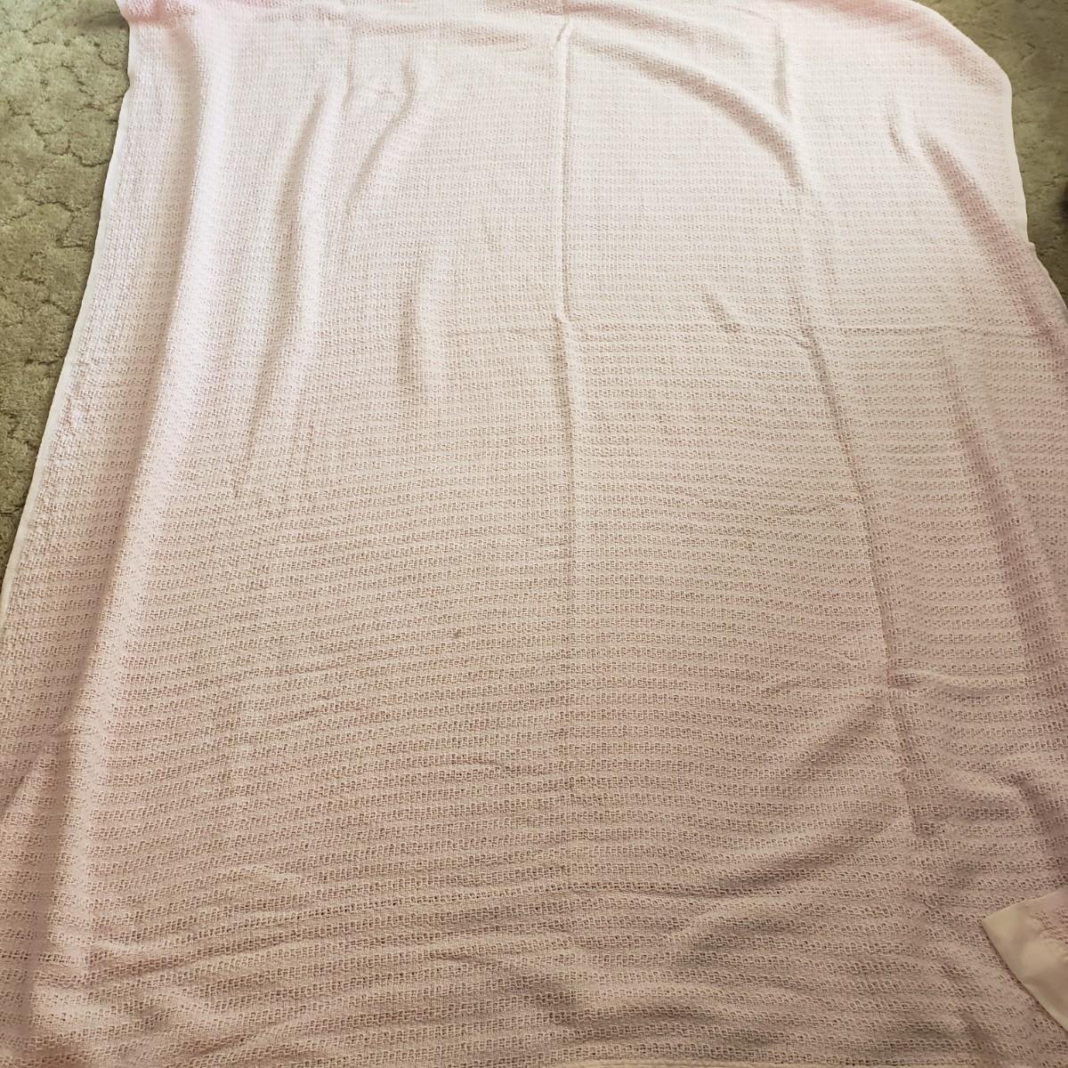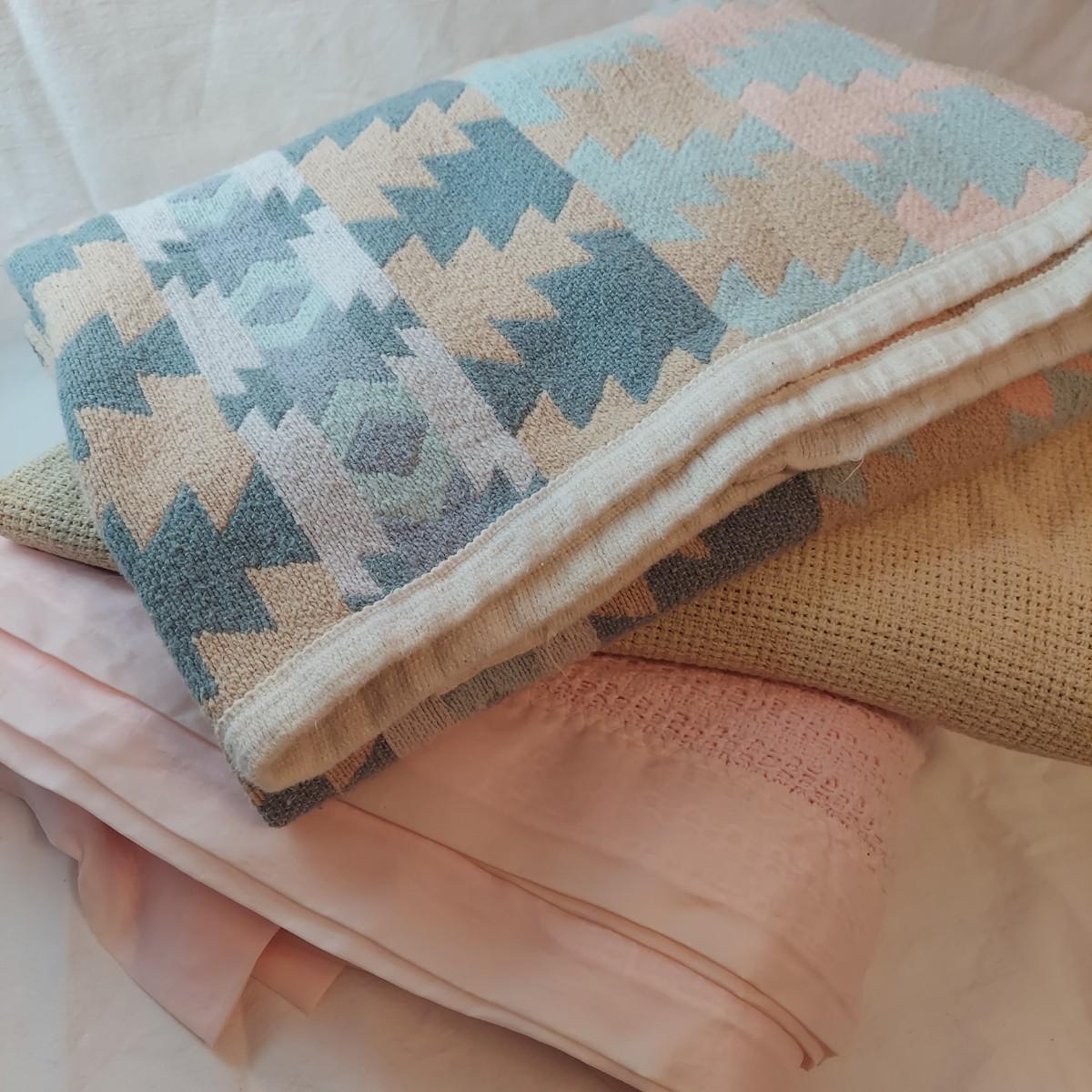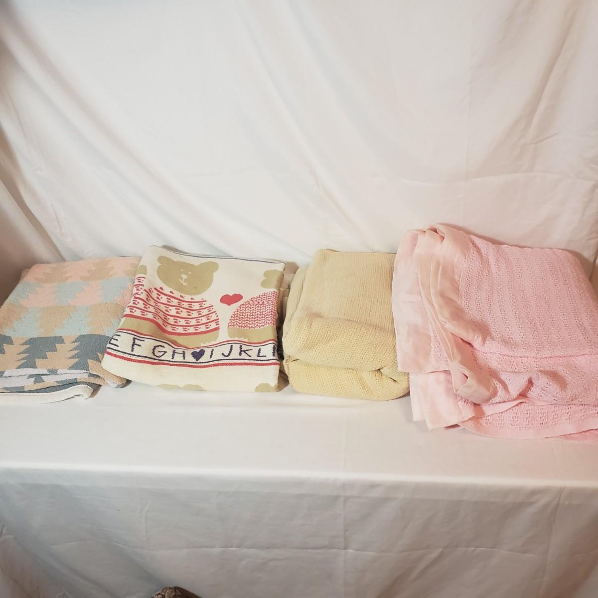 There are four cozy blankets in this lot. The two patterned ones appear to be Crown Craft based on their RN number. They each measure 46" x 40"H. The two solid ones are a pale yellow and pink and made of cotton. They measure 90" x 69"H. All four appear to be cotton weaves.