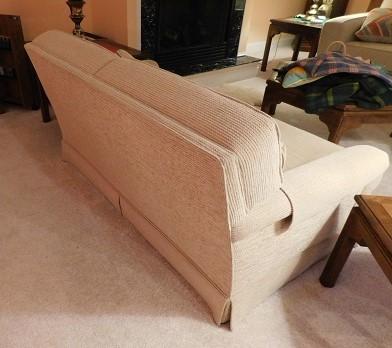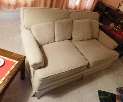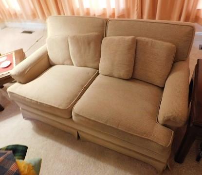 Two Cushion Loveseat with Throw Pillows 59" Long x 38" Deep. We always suggest cleaning upholstered pieces but this item is in good shape