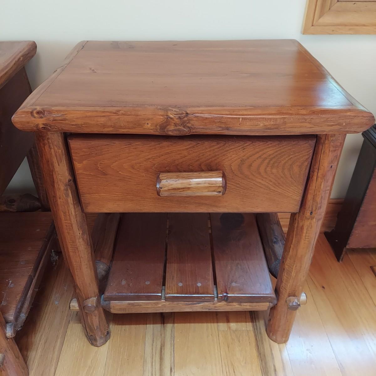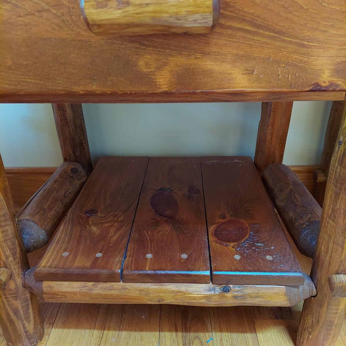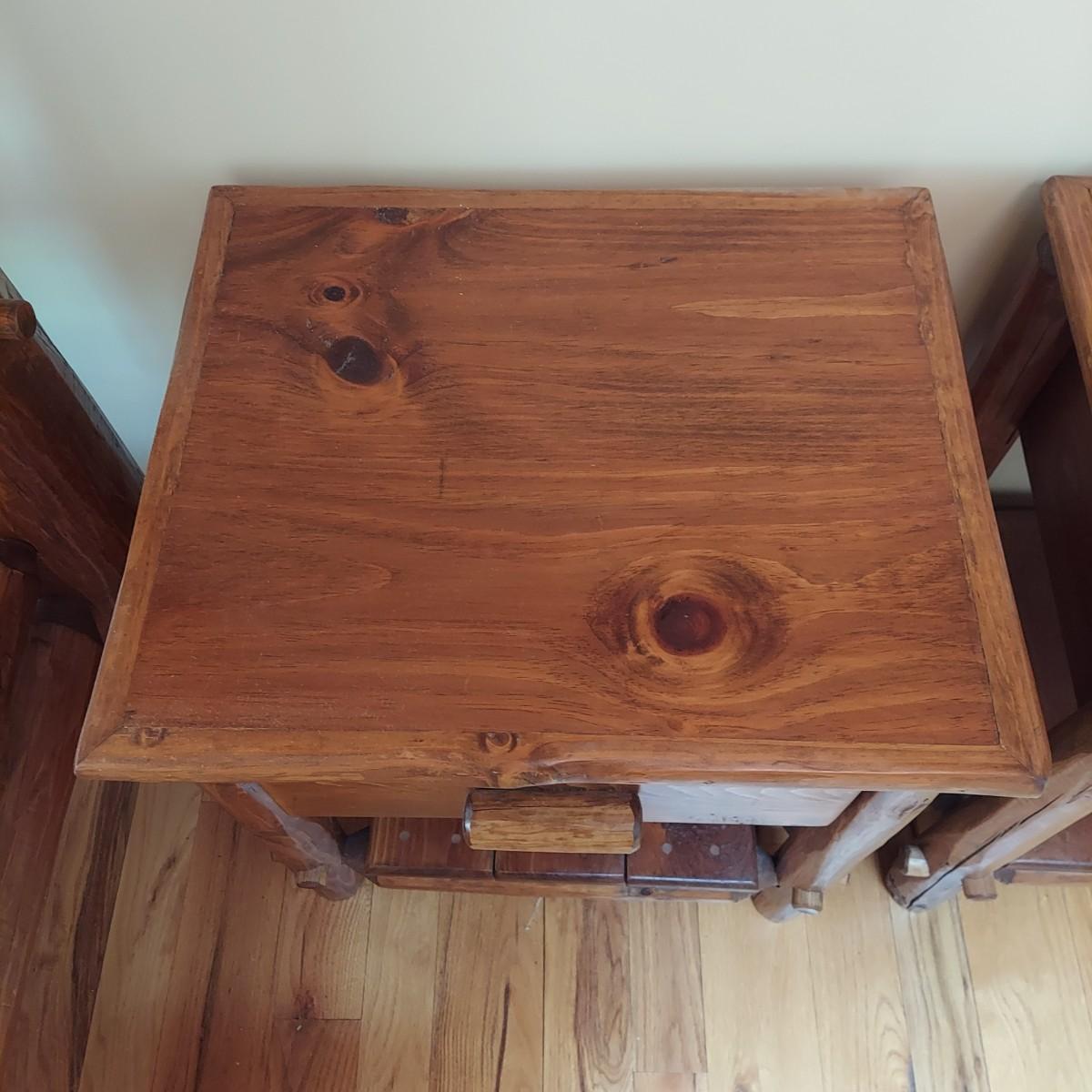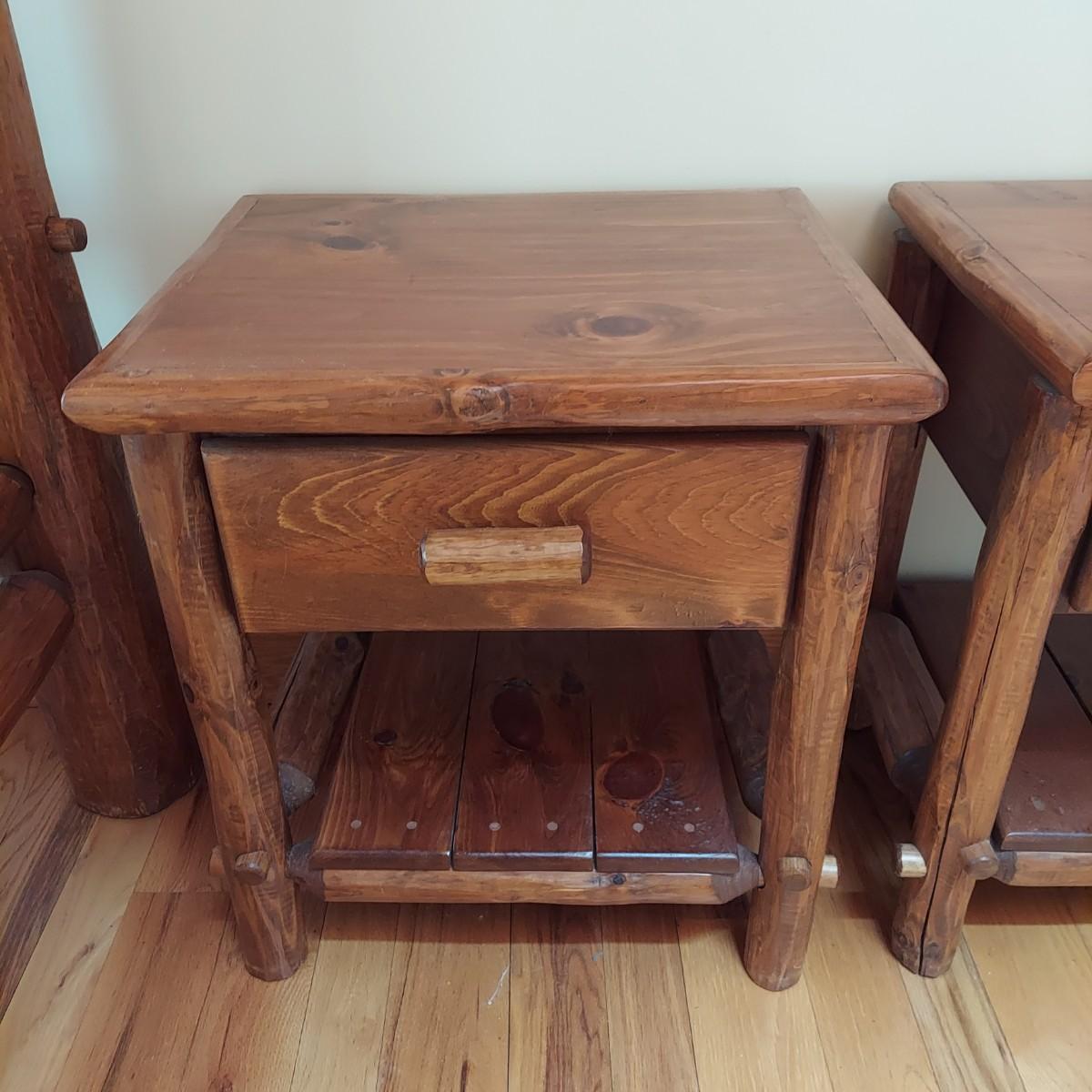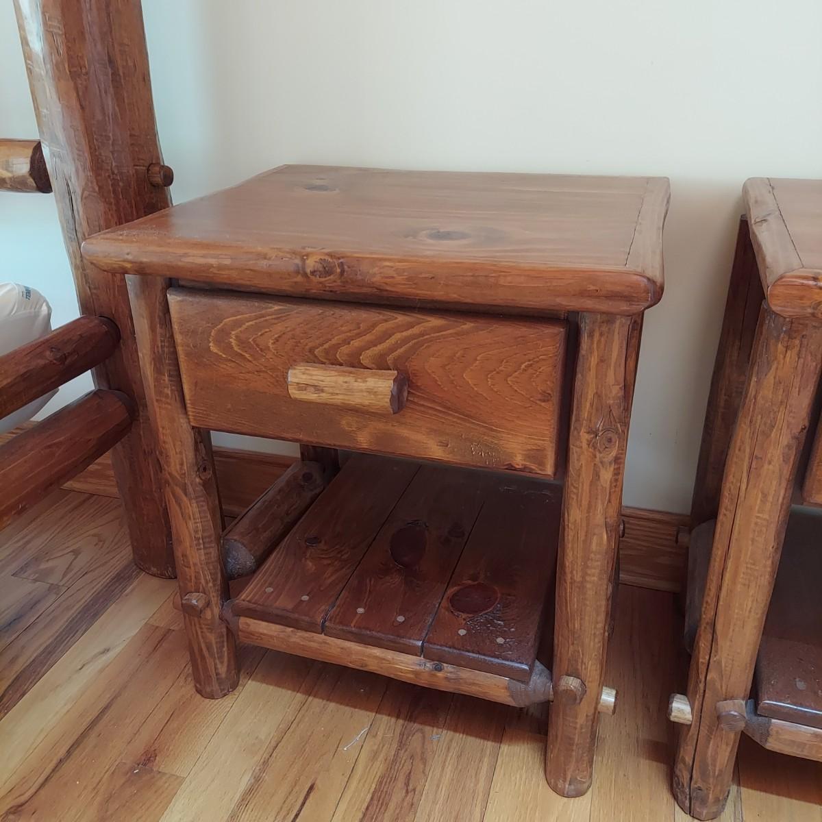 Two log cabin style custom built nightstands. The seller states they were handmade by Lang Hornthal. Each measures 23.5” x 20” x 28"H. They were made to match the queen size bed and storage chest available in another lot. Please see photos for details. Local pickup only.