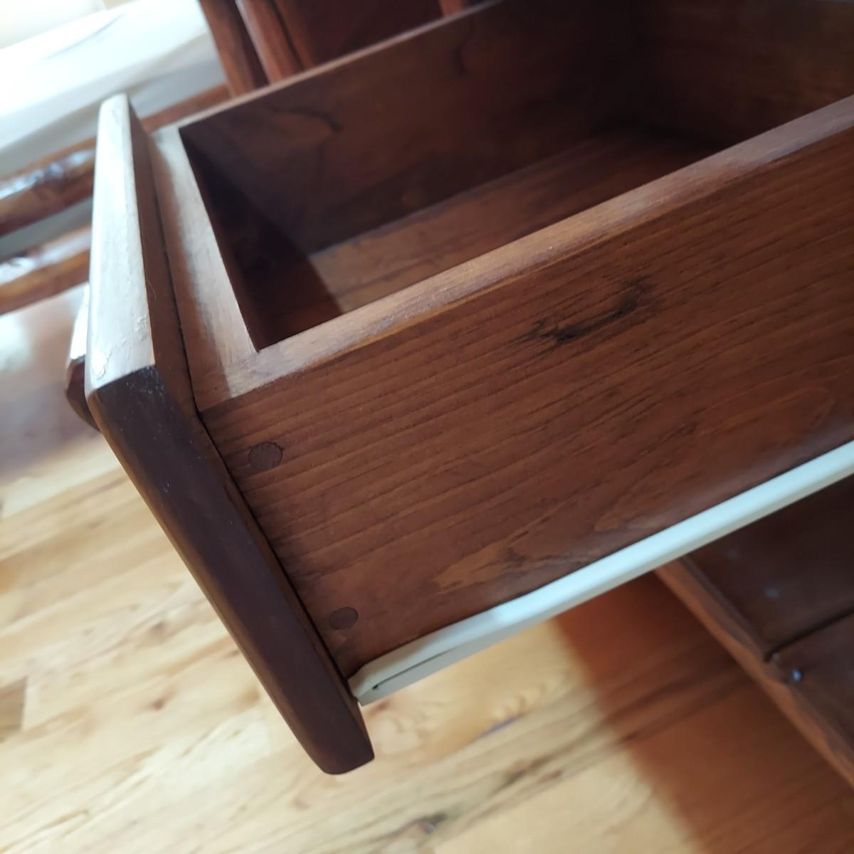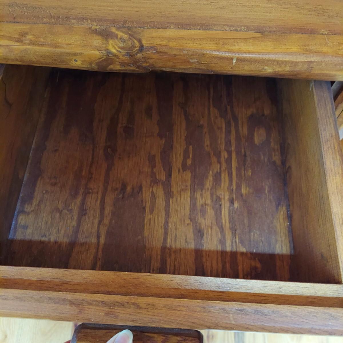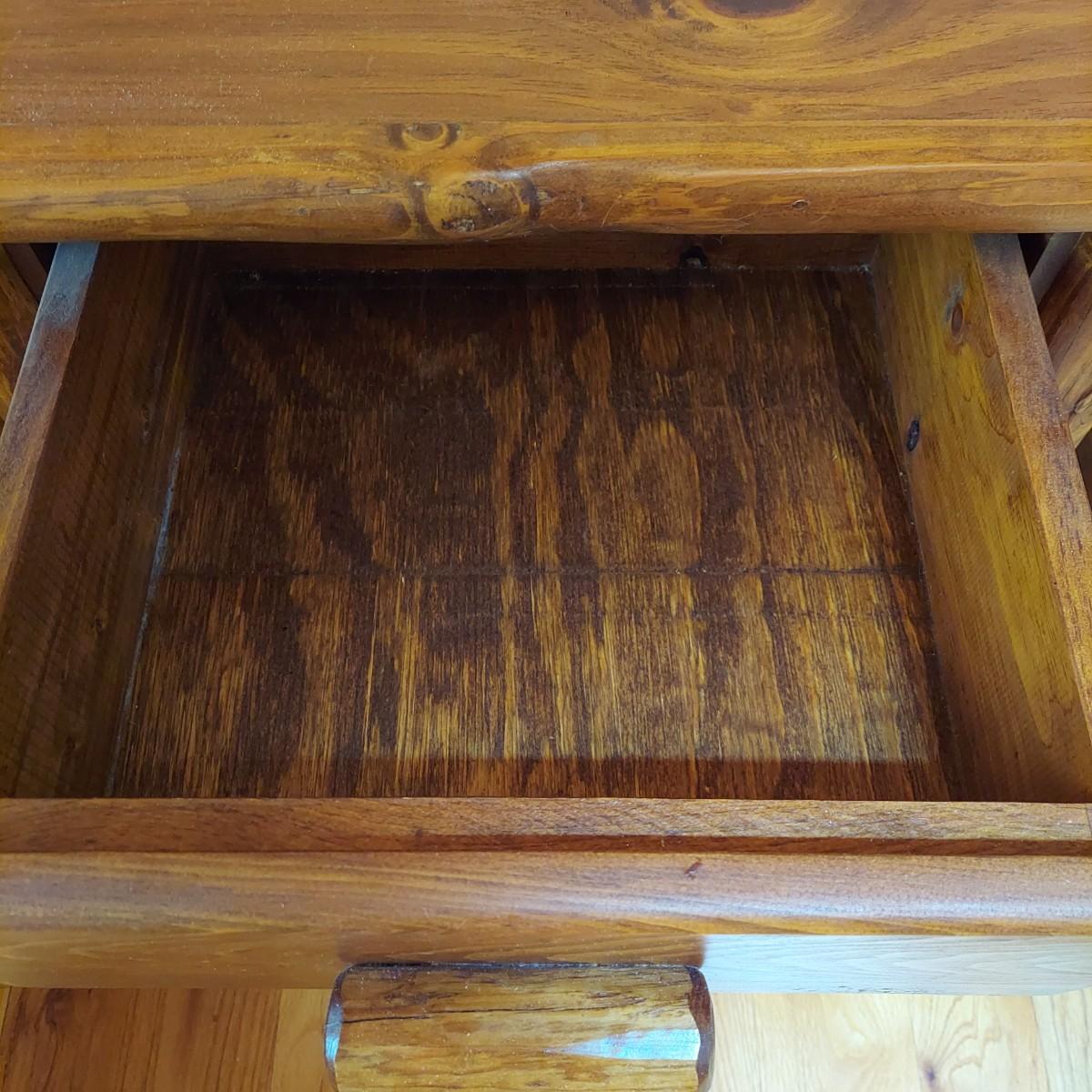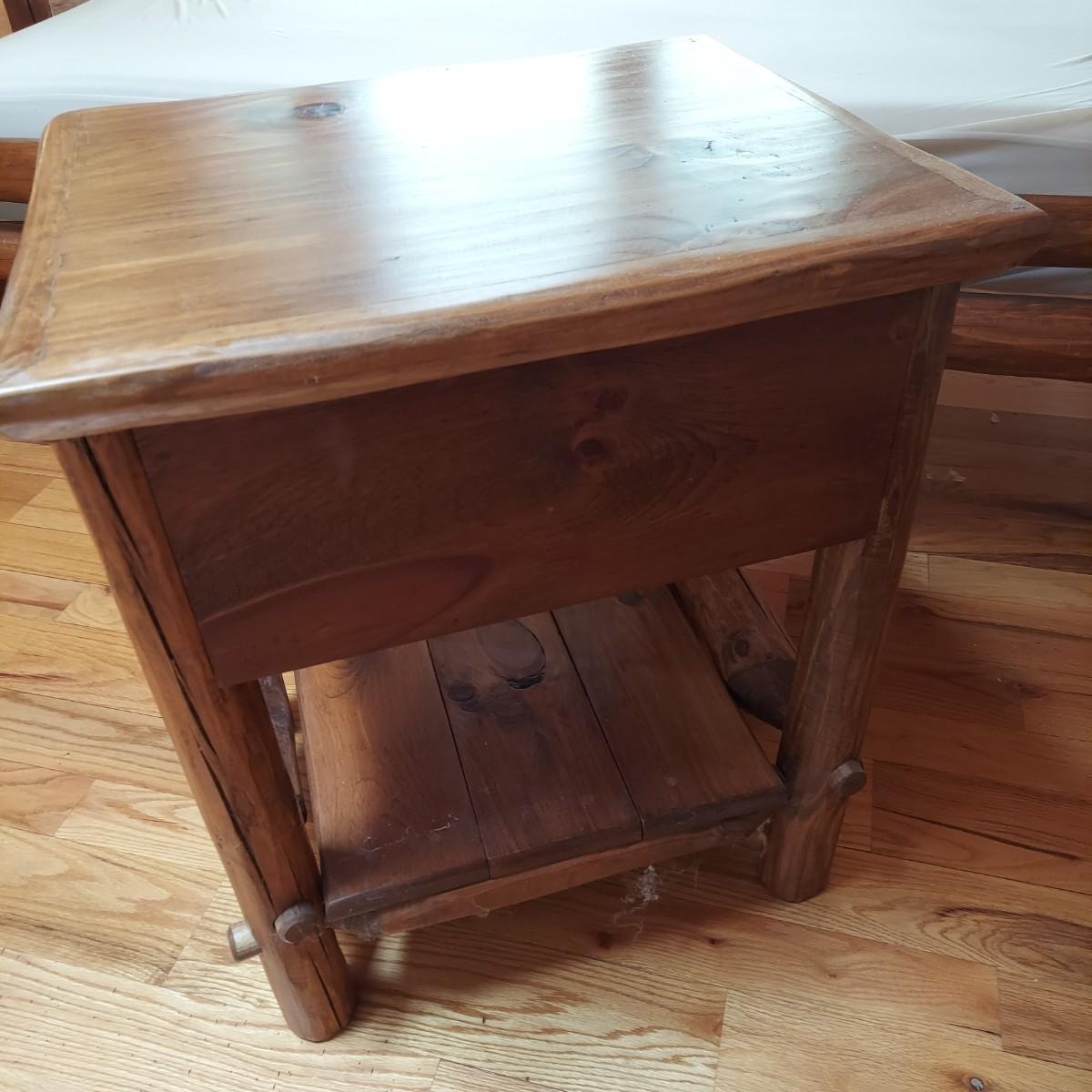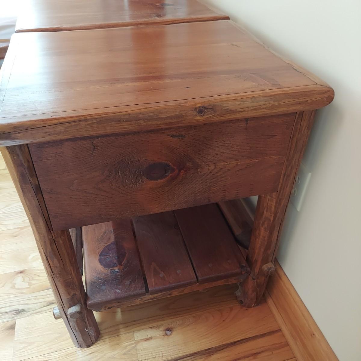 Two log cabin style custom built nightstands. The seller states they were handmade by Lang Hornthal. Each measures 23.5” x 20” x 28"H. They were made to match the queen size bed and storage chest available in another lot. Please see photos for details. Local pickup only.