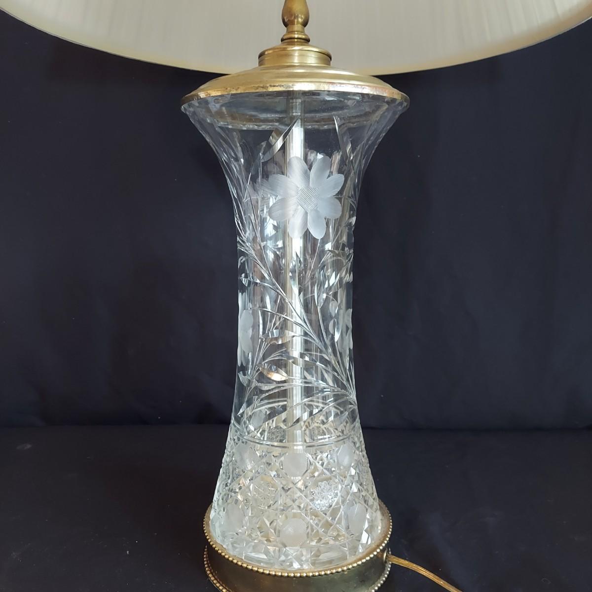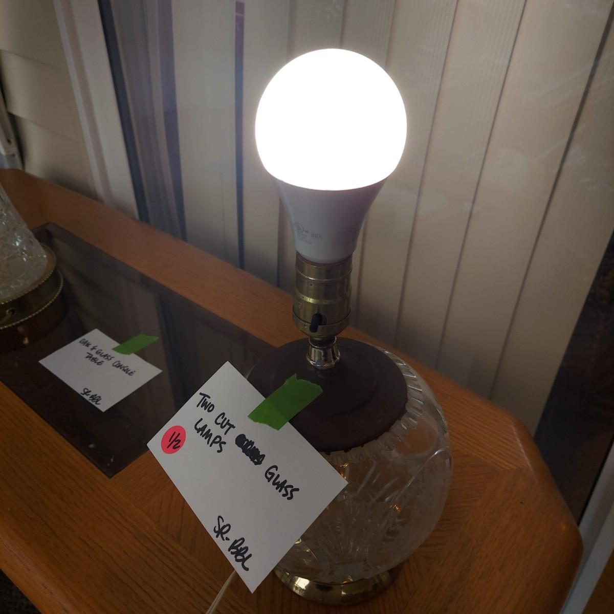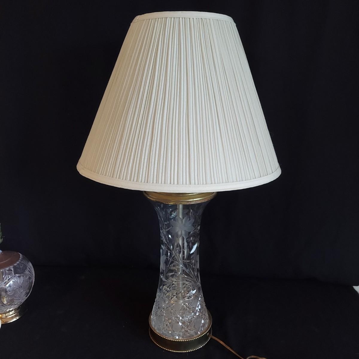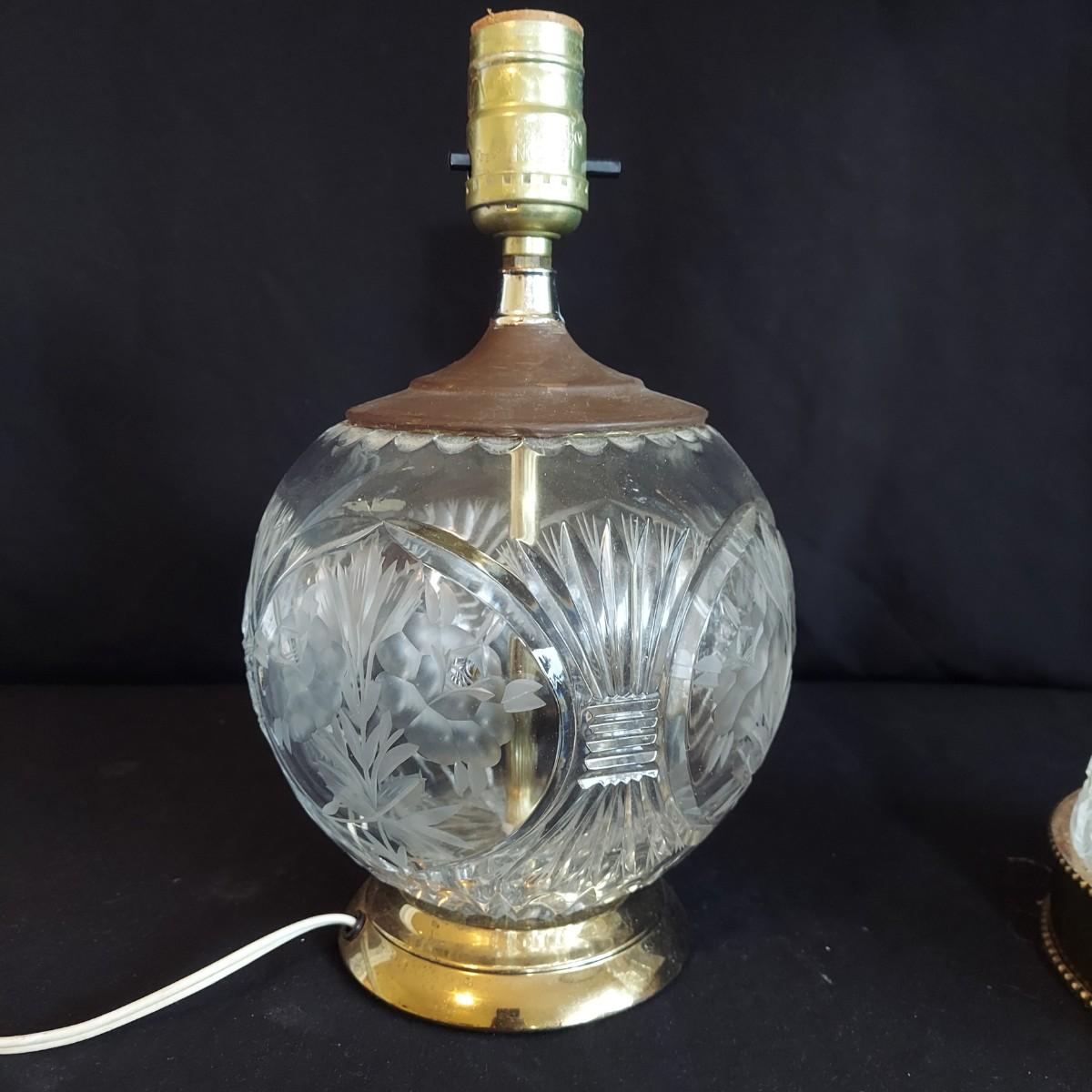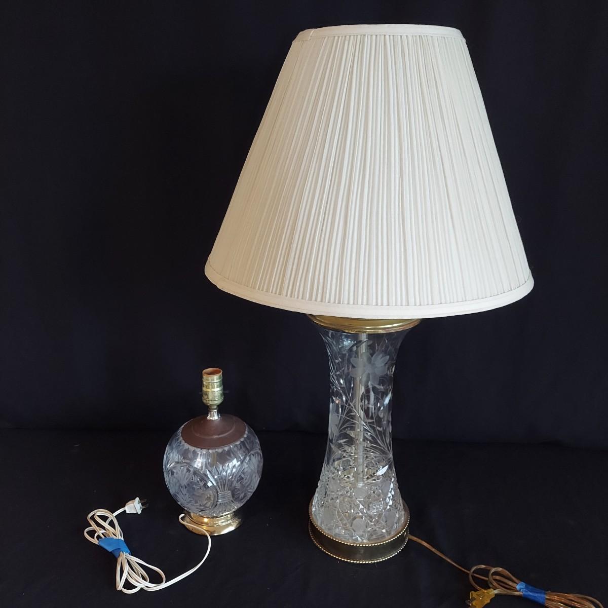 Two lamps with cut glass bodies. Makes a nice ting–could be crystal. Heavy weight. The small lamp has no shade, has a two way switch and measures 6"D x 10.5"H. The largest lamp has a 3 way switch and is 7"D x 31"H with a cloth shade that measures 18"D across. Local Pickup Only