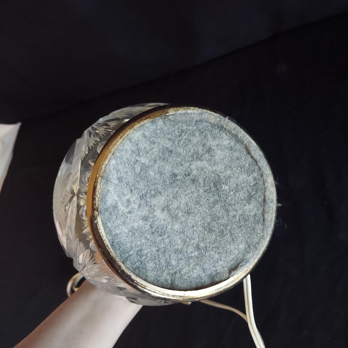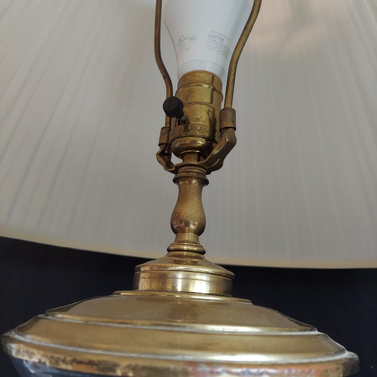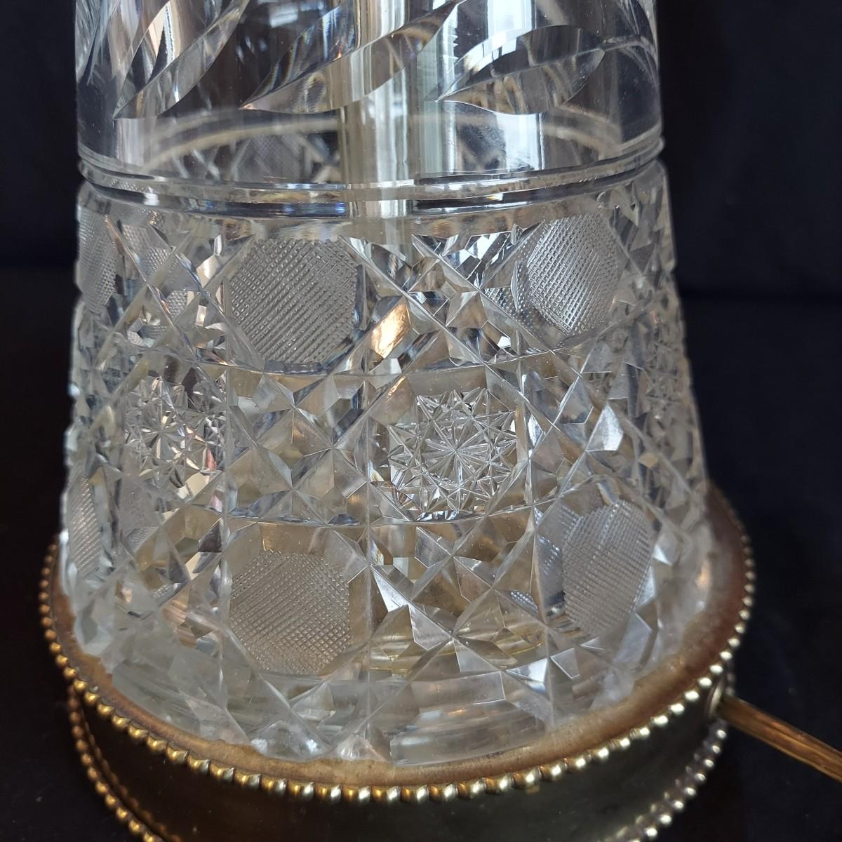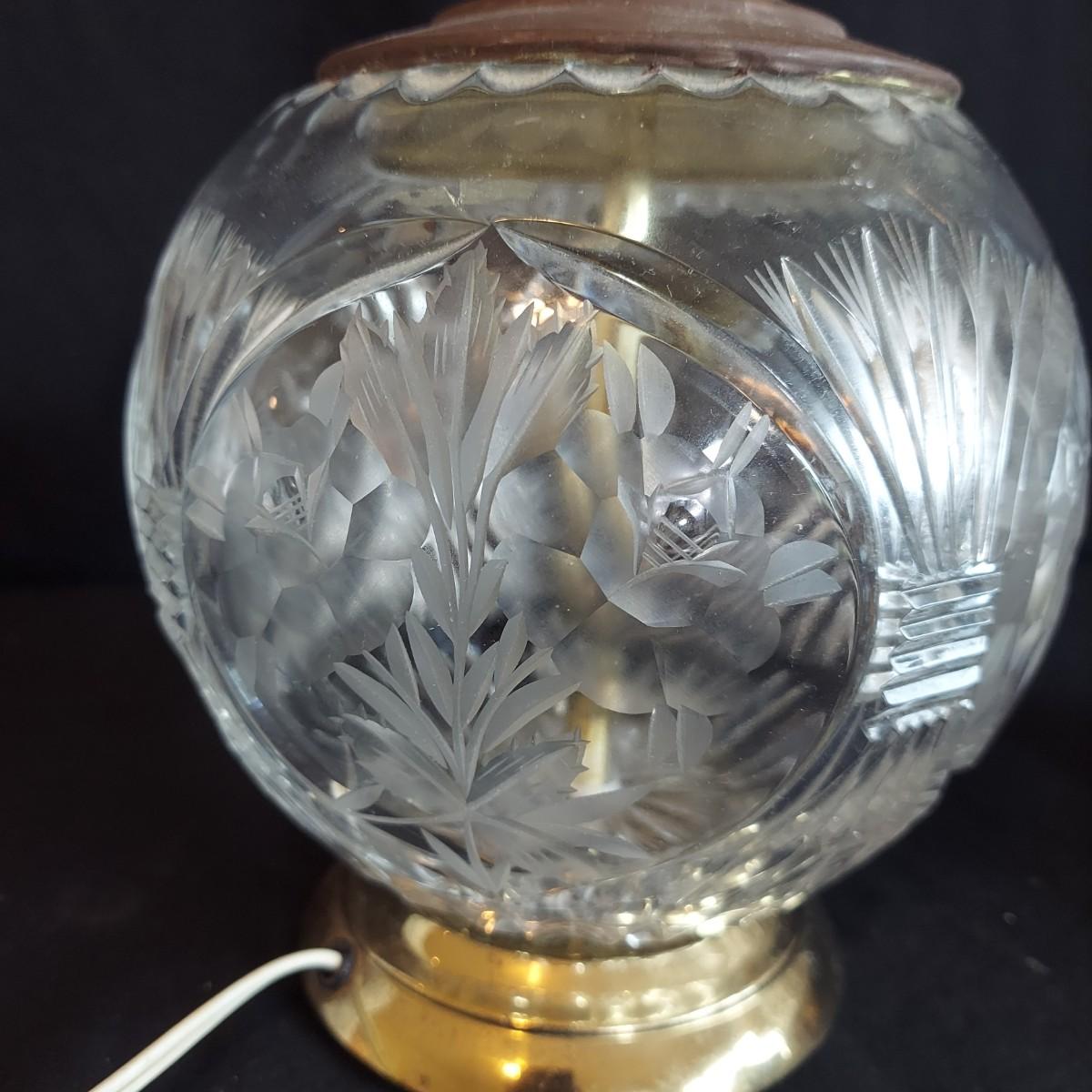 Two lamps with cut glass bodies. Makes a nice ting–could be crystal. Heavy weight. The small lamp has no shade, has a two way switch and measures 6"D x 10.5"H. The largest lamp has a 3 way switch and is 7"D x 31"H with a cloth shade that measures 18"D across. Local Pickup Only