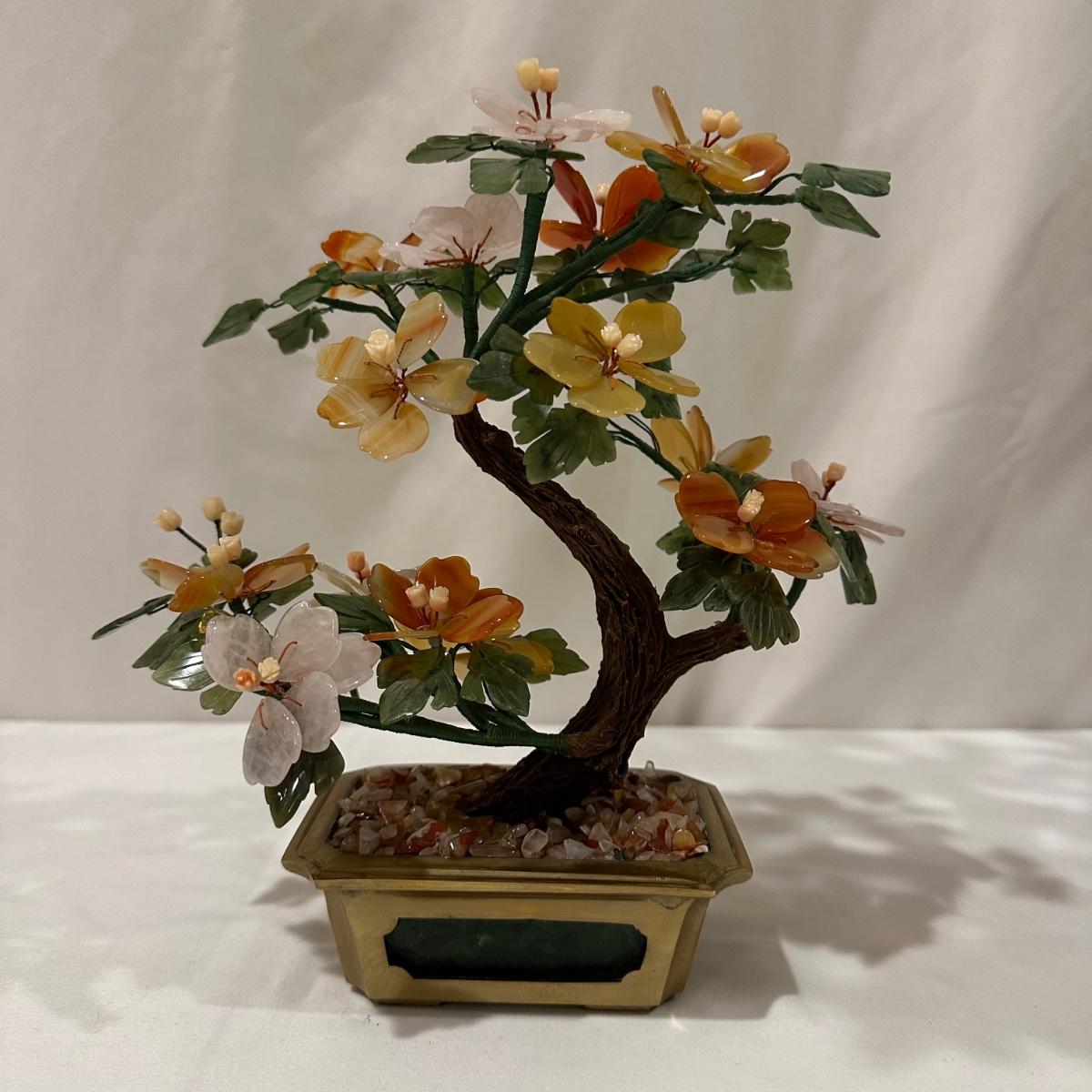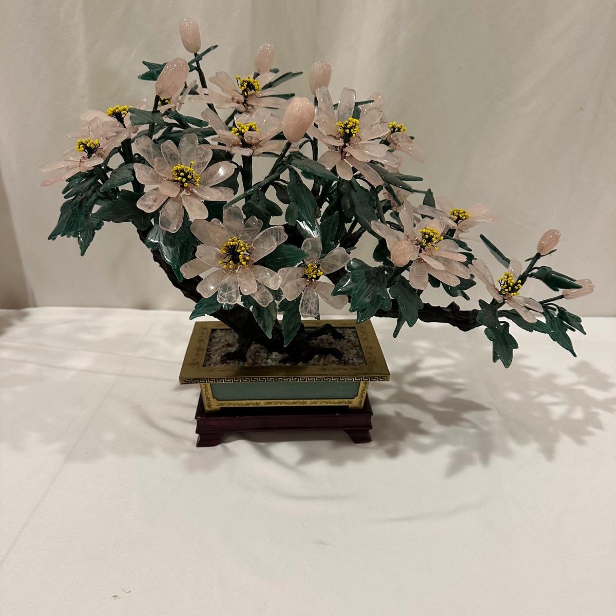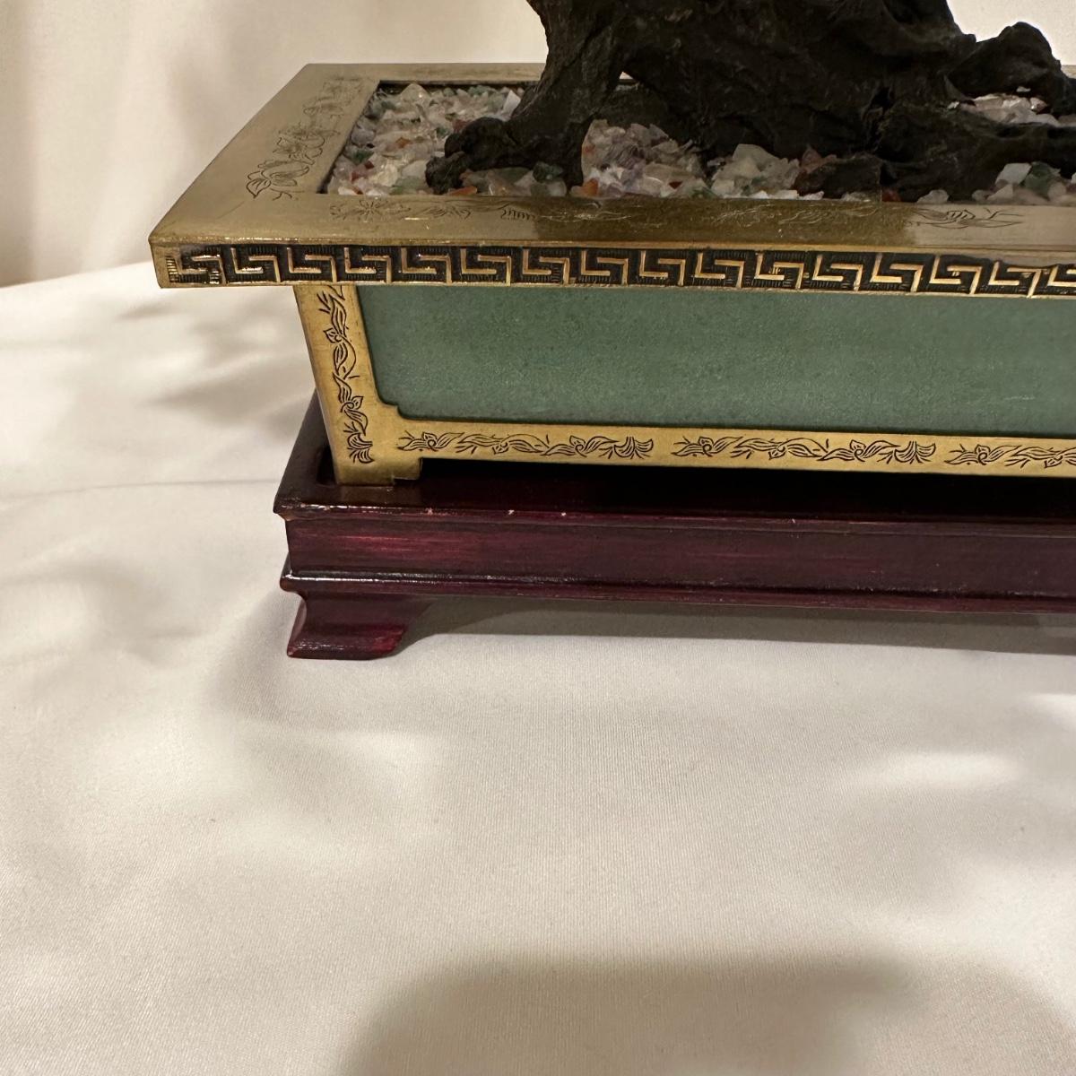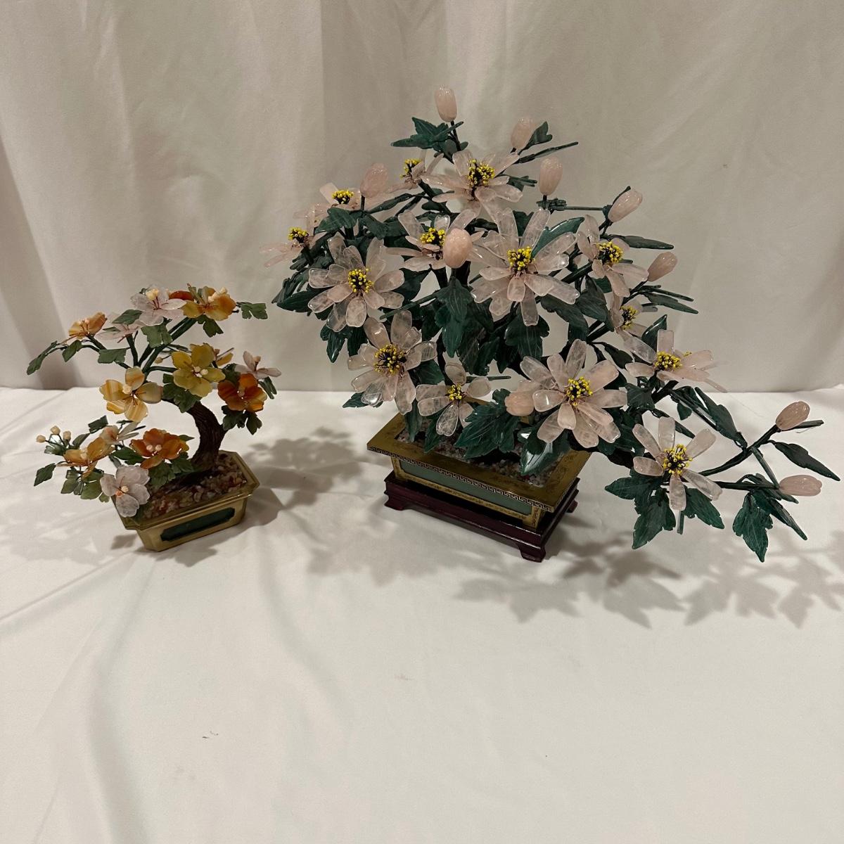 Decorative bonsai trees appear to be made of glass. The large bonsai measures 18” x 12” x 14”H including wooden stand. The smaller bonsai measures 9” x 6” x 10”H and does not include a wooden stand. Shipping available.