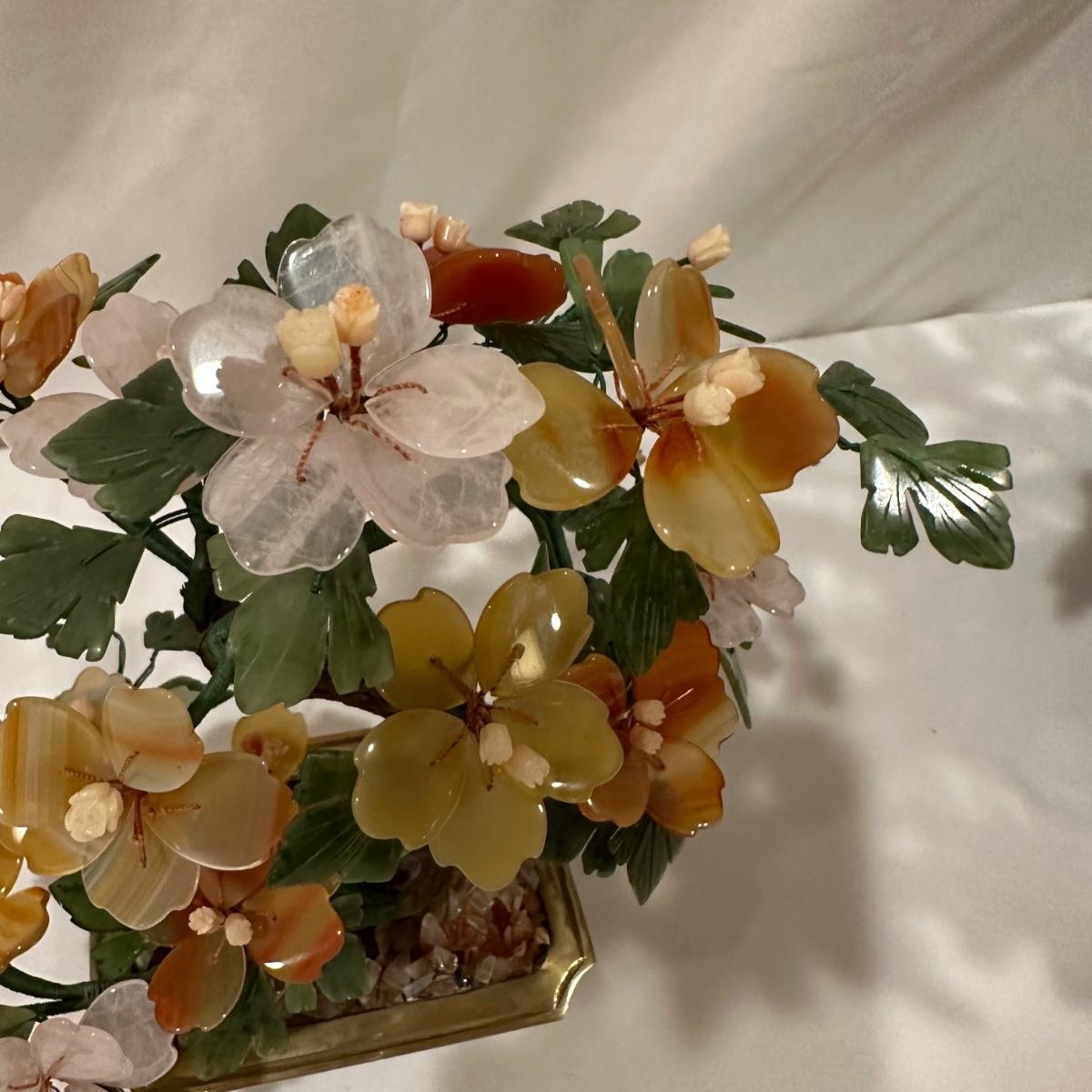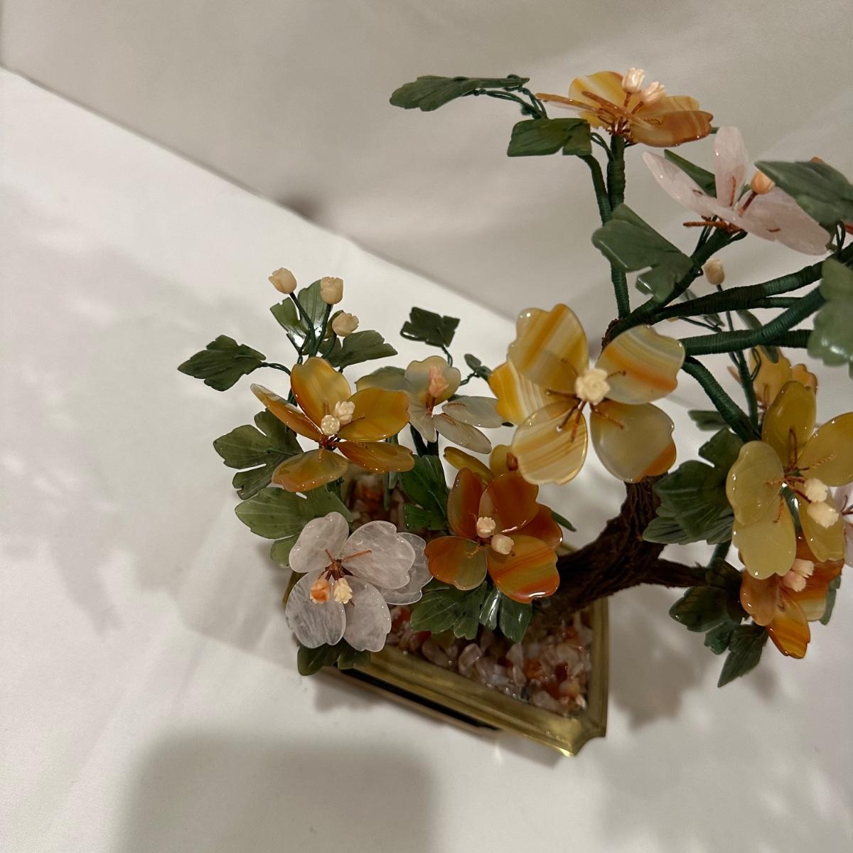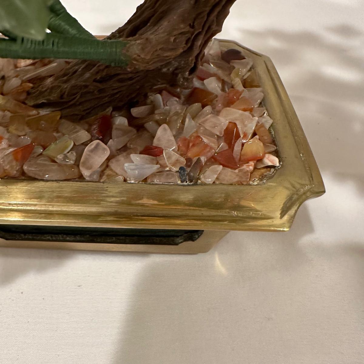 Decorative bonsai trees appear to be made of glass. The large bonsai measures 18” x 12” x 14”H including wooden stand. The smaller bonsai measures 9” x 6” x 10”H and does not include a wooden stand. Shipping available.