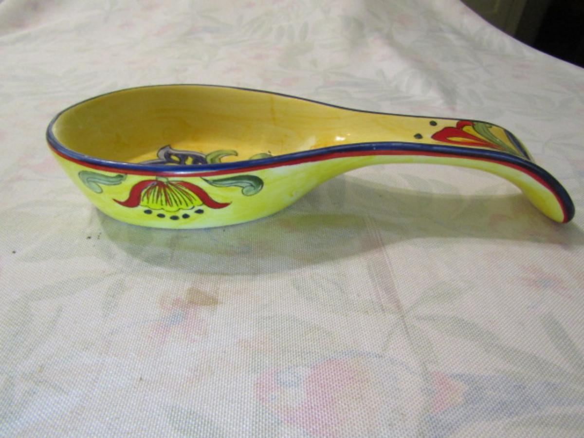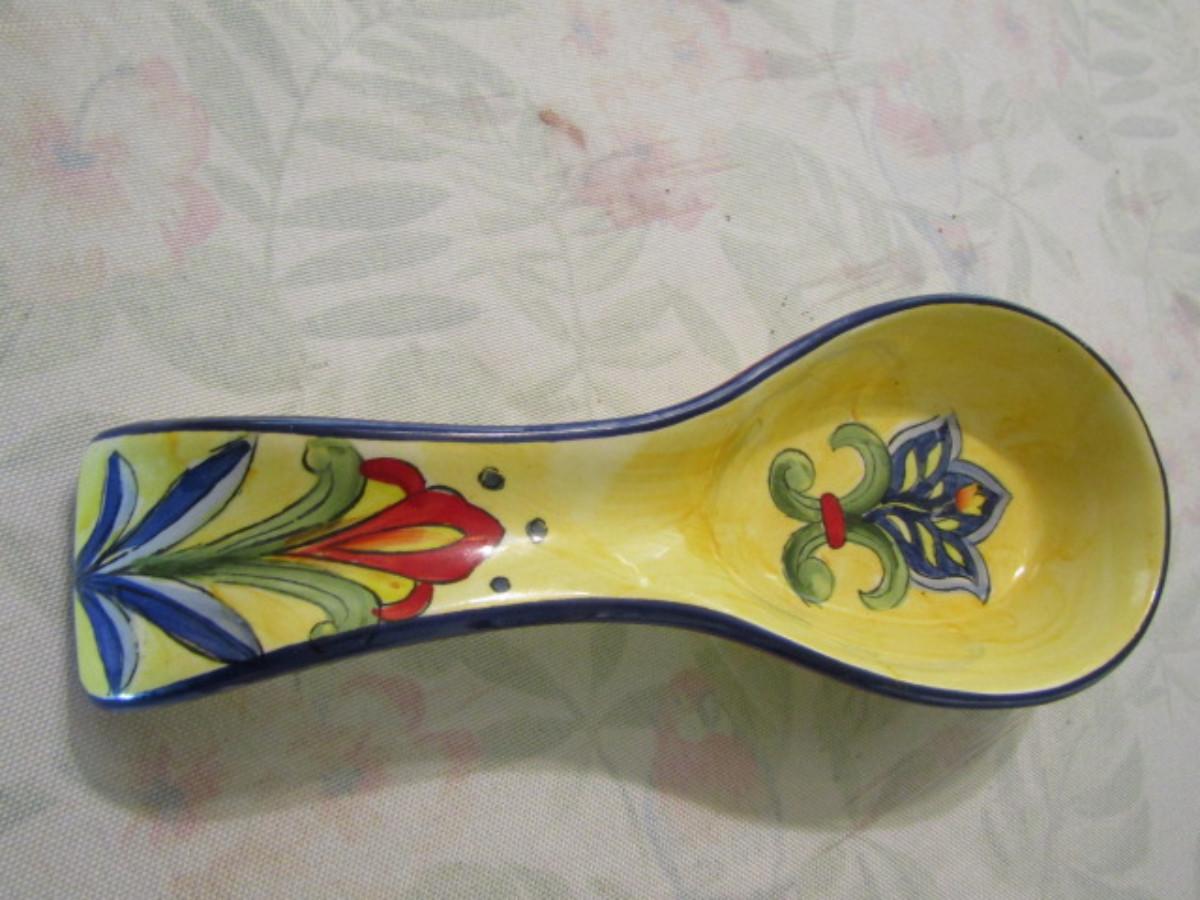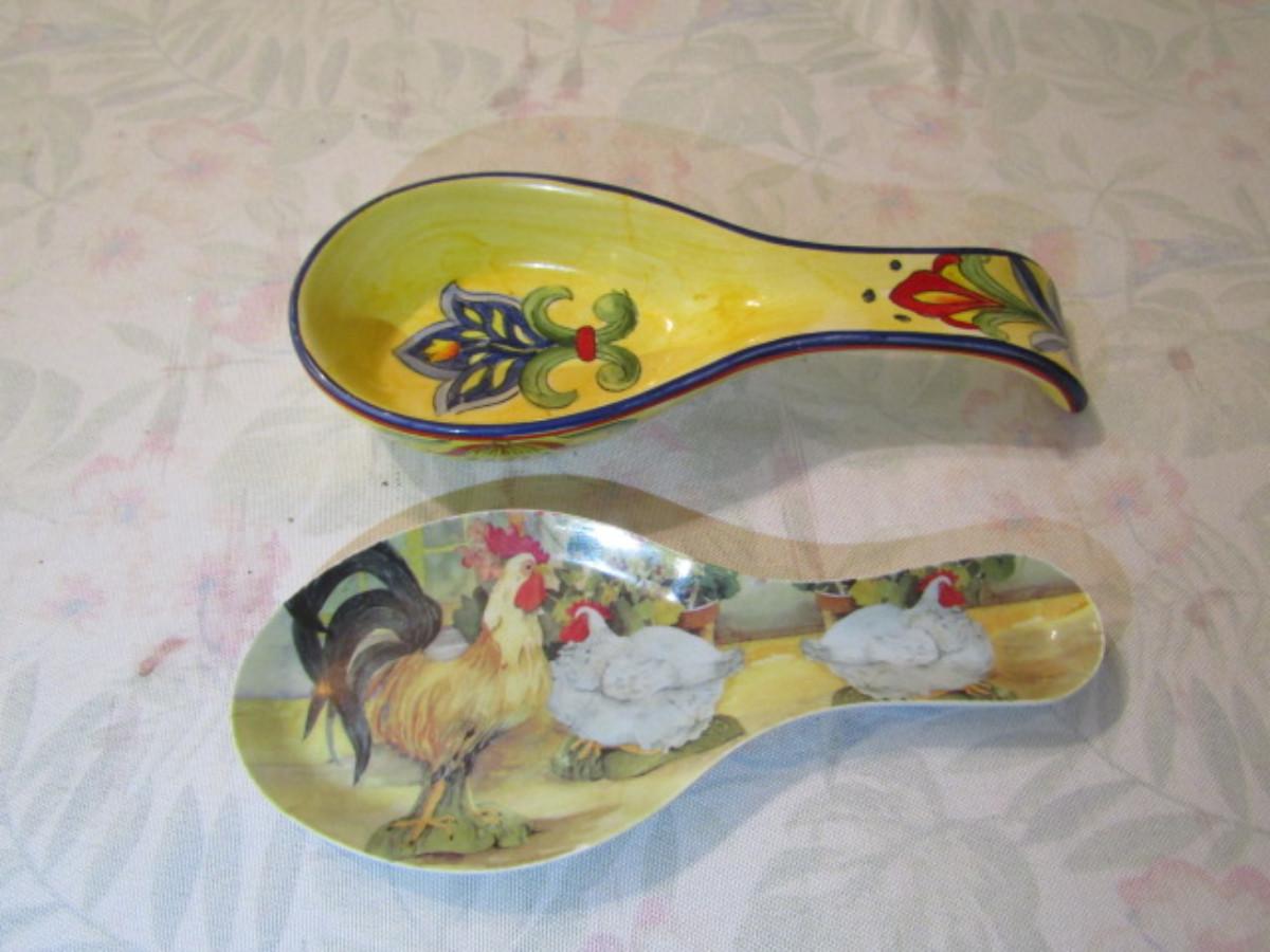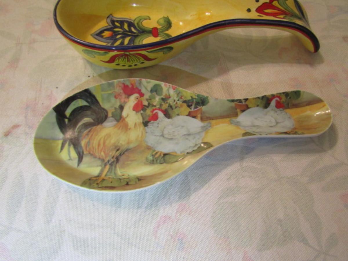 Two Decorative Spoon Rests- Melamine Chicken Theme and Glazed Ceramic Floral