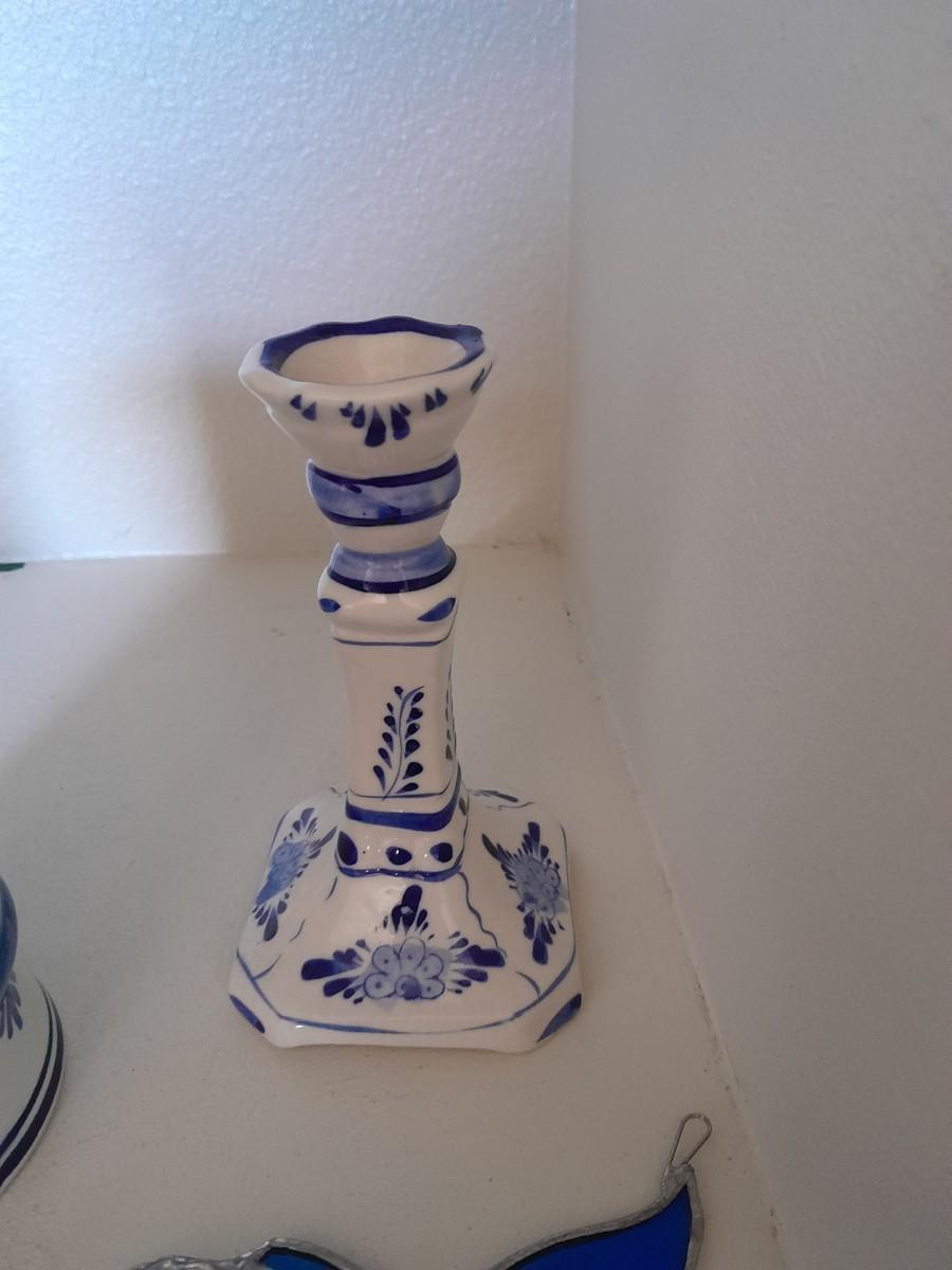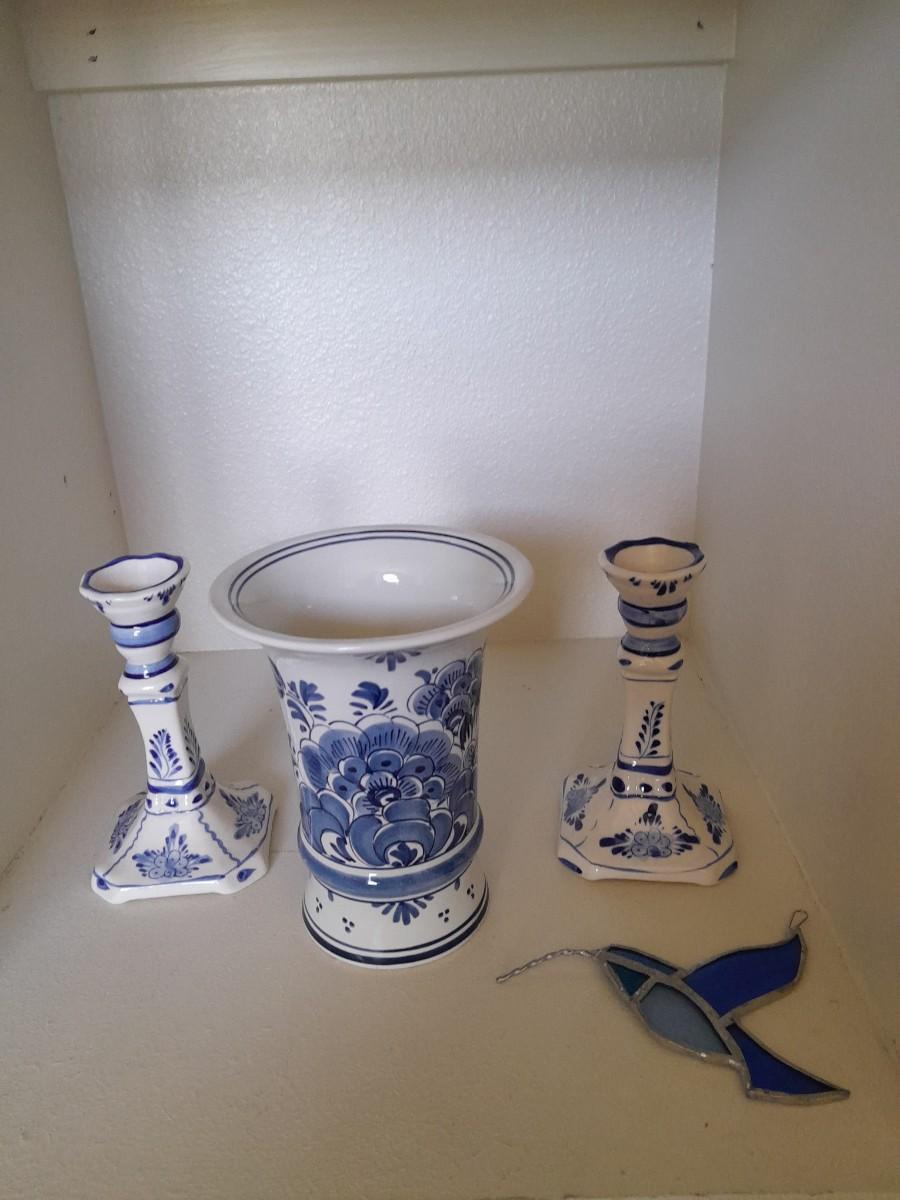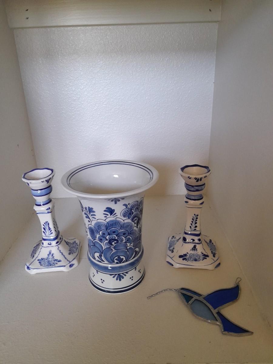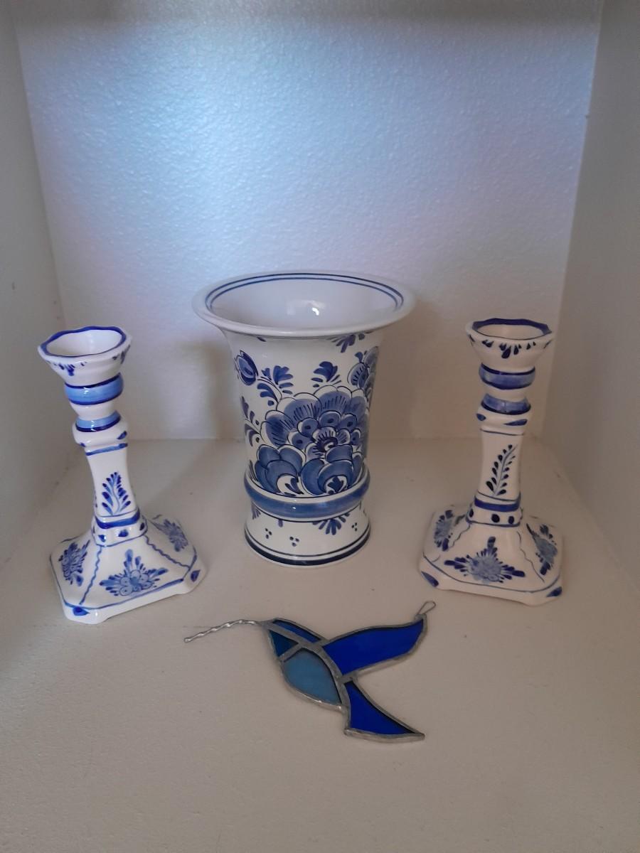 TWO DELFT BLUE HANDPAINTED CANDLESTICKS AND VASE, GLASS HUMMINGBIRD
