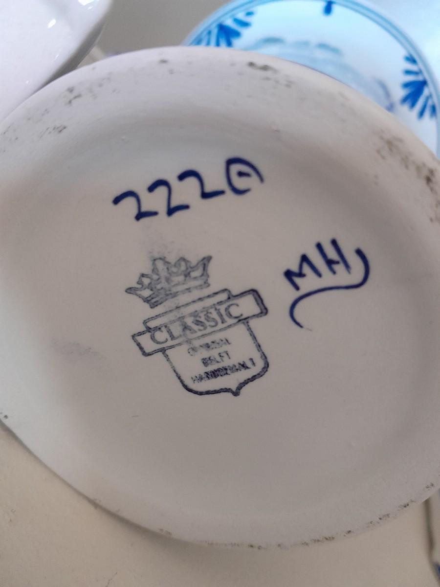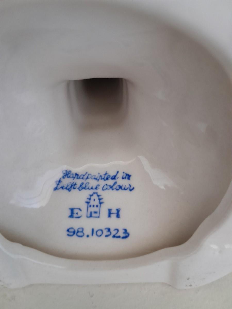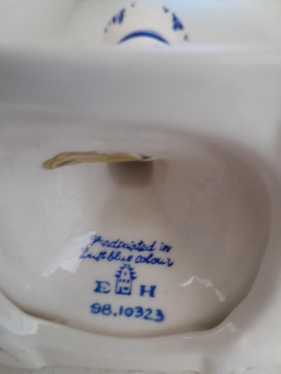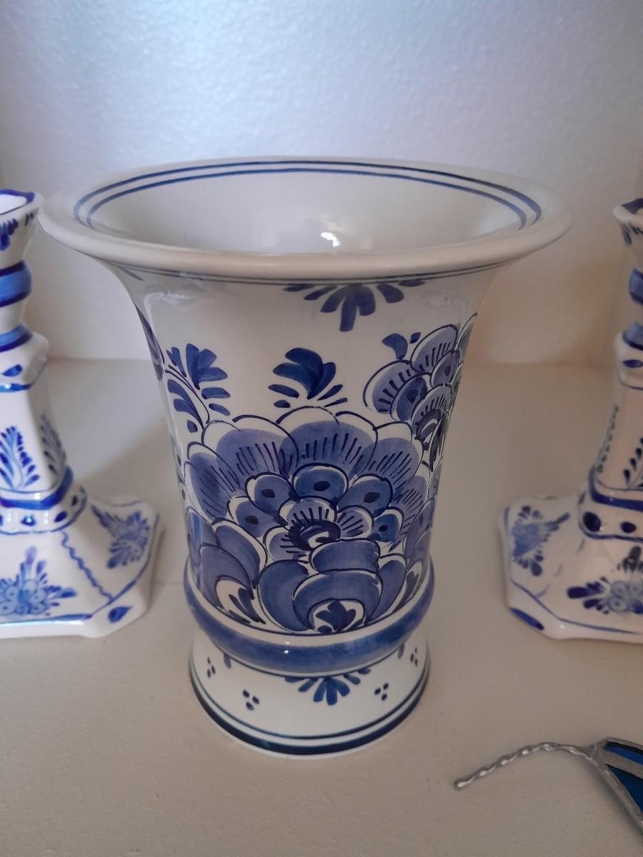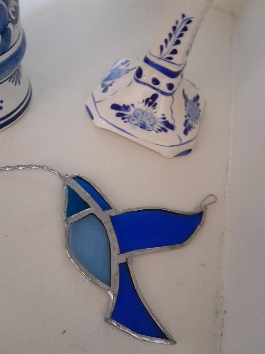 TWO DELFT BLUE HANDPAINTED CANDLESTICKS AND VASE, GLASS HUMMINGBIRD