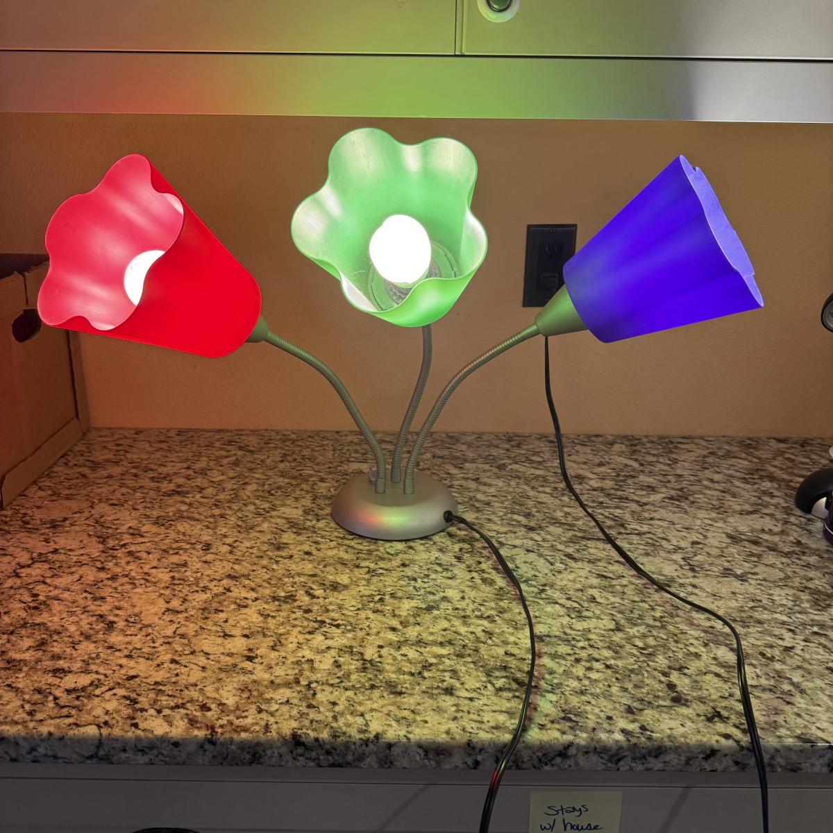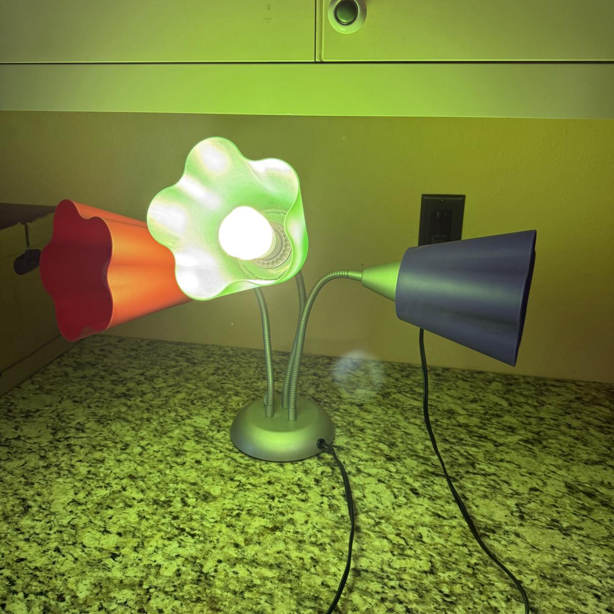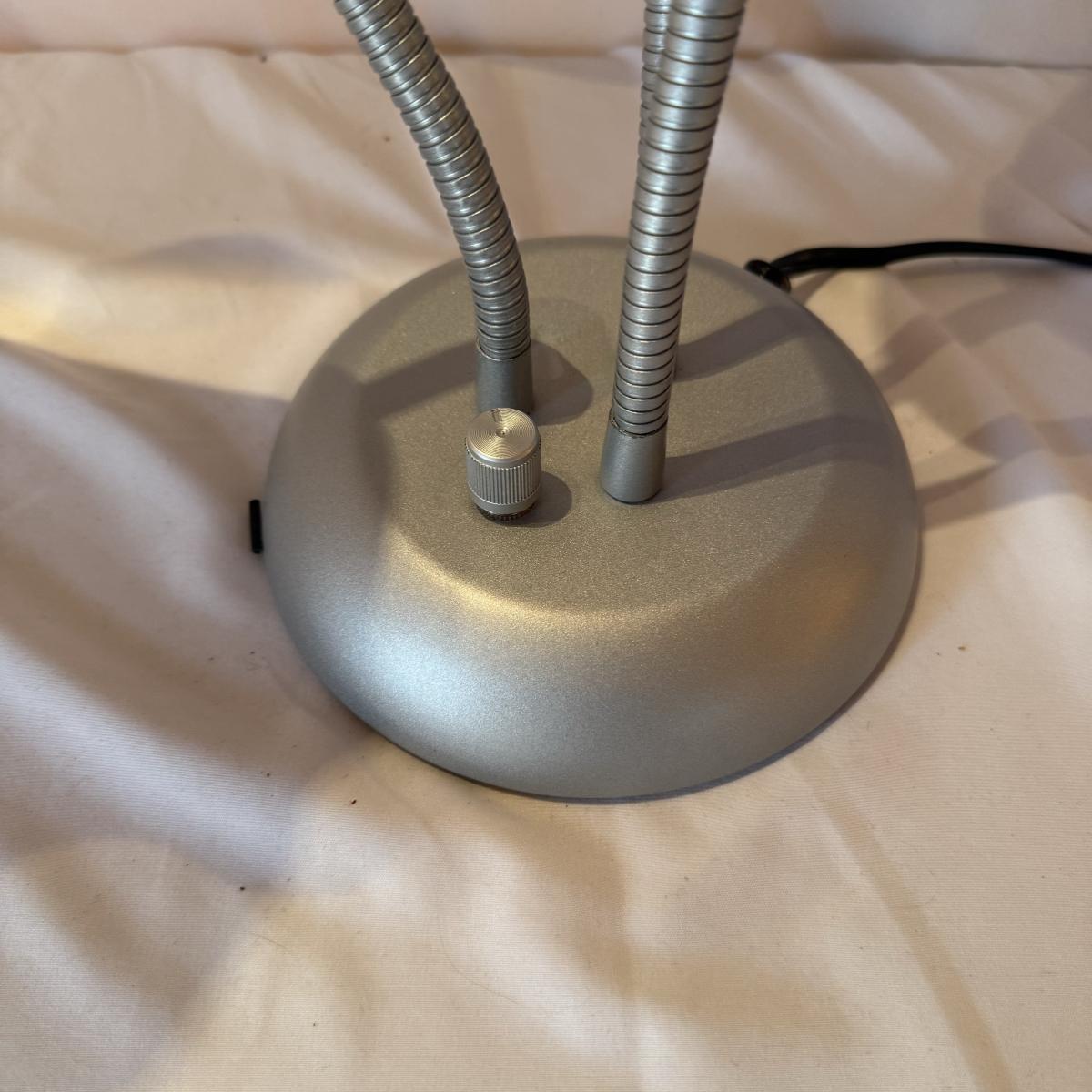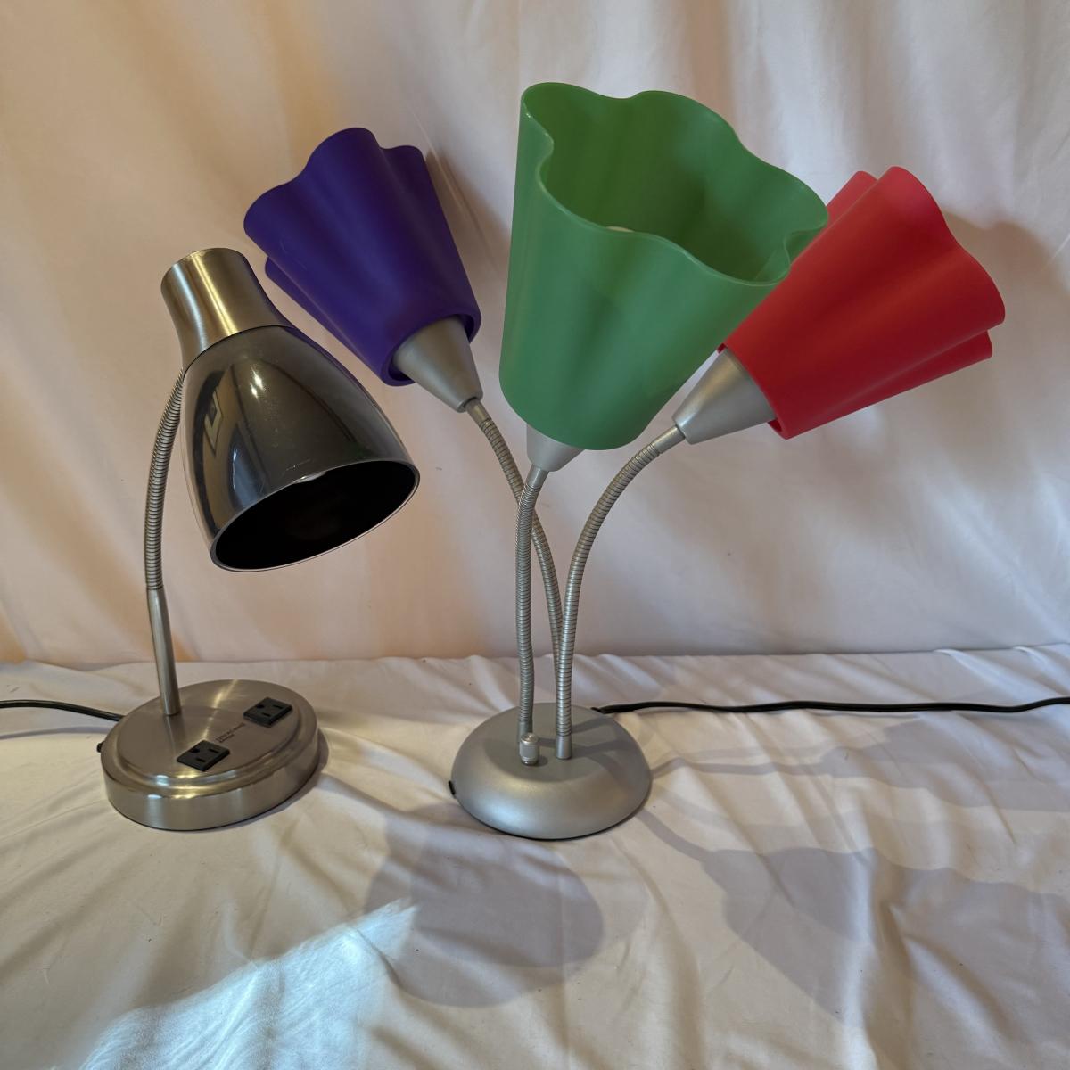 Two desk lamps. The three lamp light operate altogether or one at a time as shown in the photos. The base of this light measures approximately 6”D and is 20”H. The gray desk light’s base is 7”D and is 14”H.