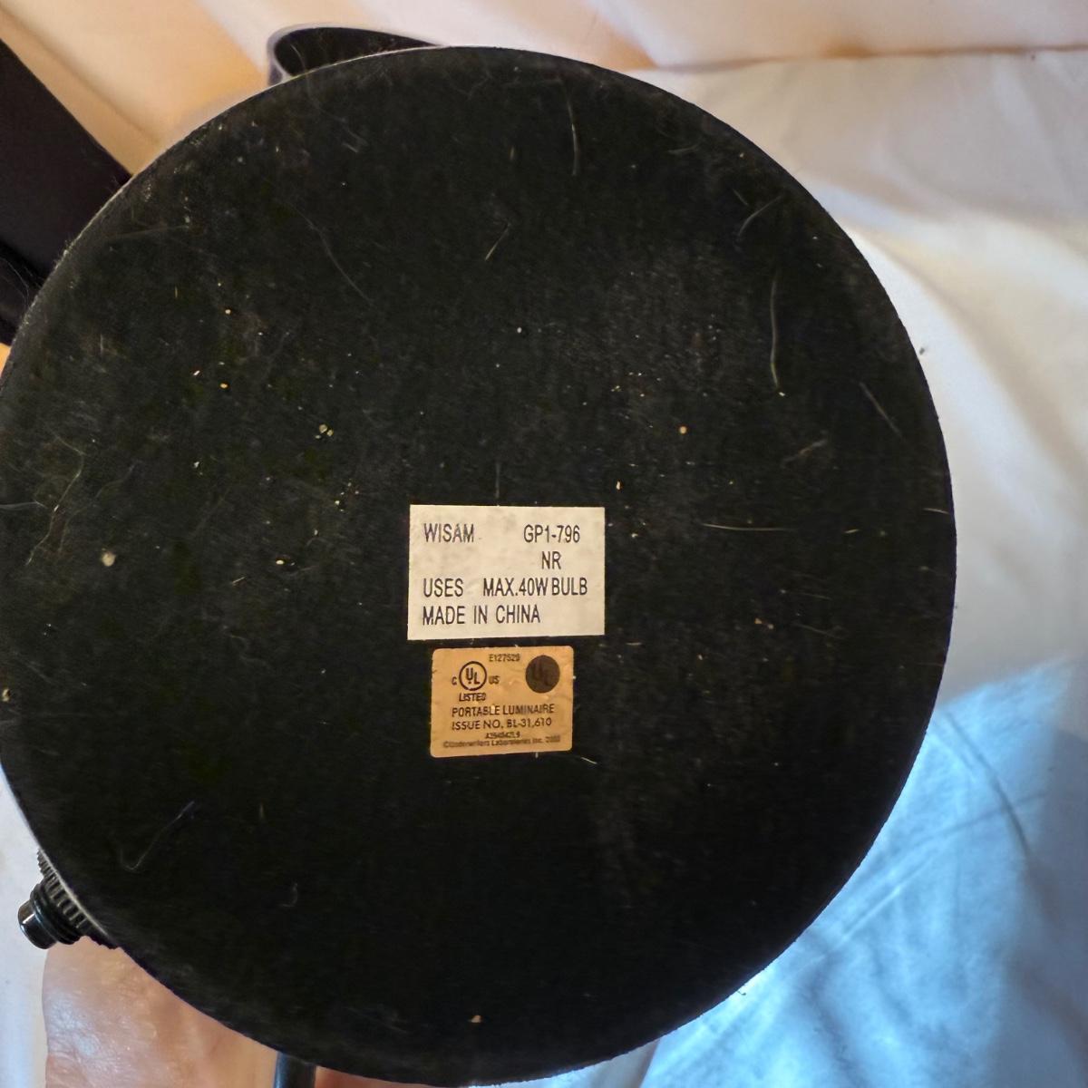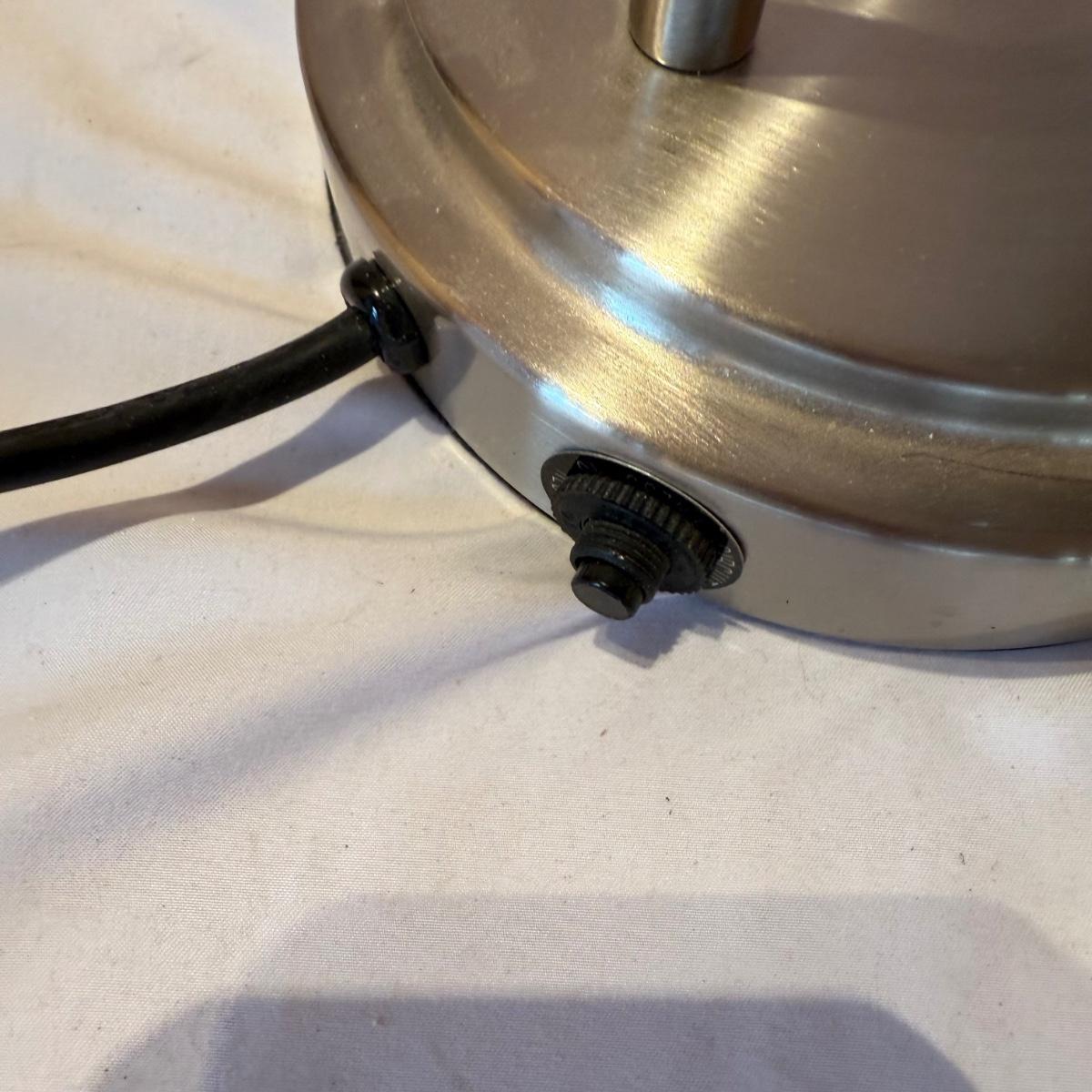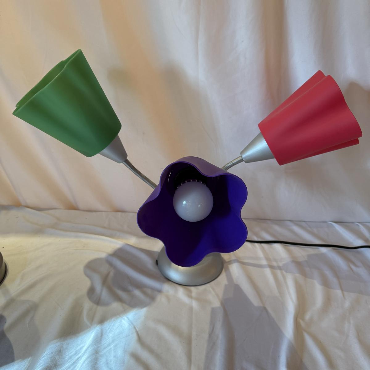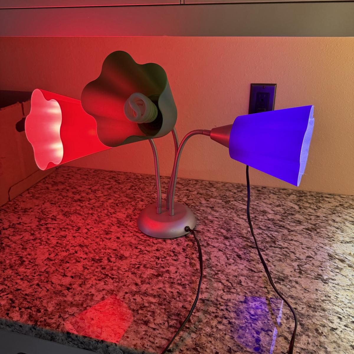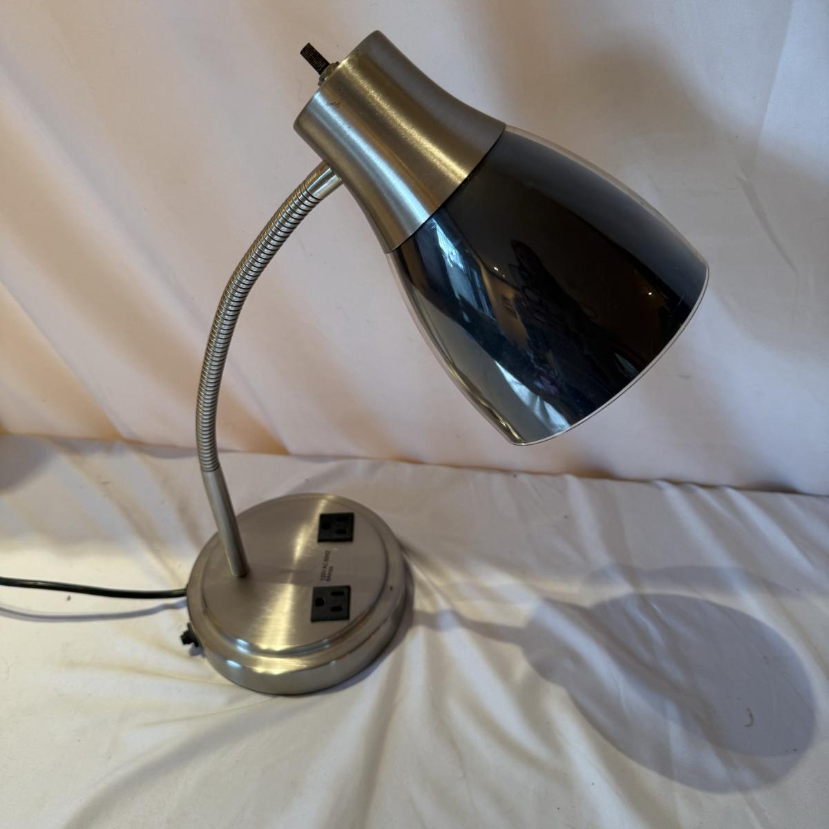 Two desk lamps. The three lamp light operate altogether or one at a time as shown in the photos. The base of this light measures approximately 6”D and is 20”H. The gray desk light’s base is 7”D and is 14”H.