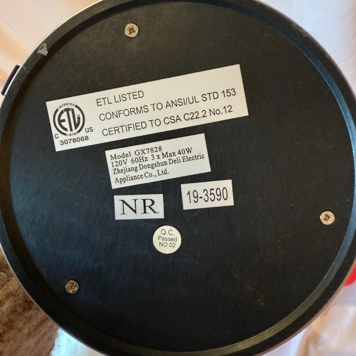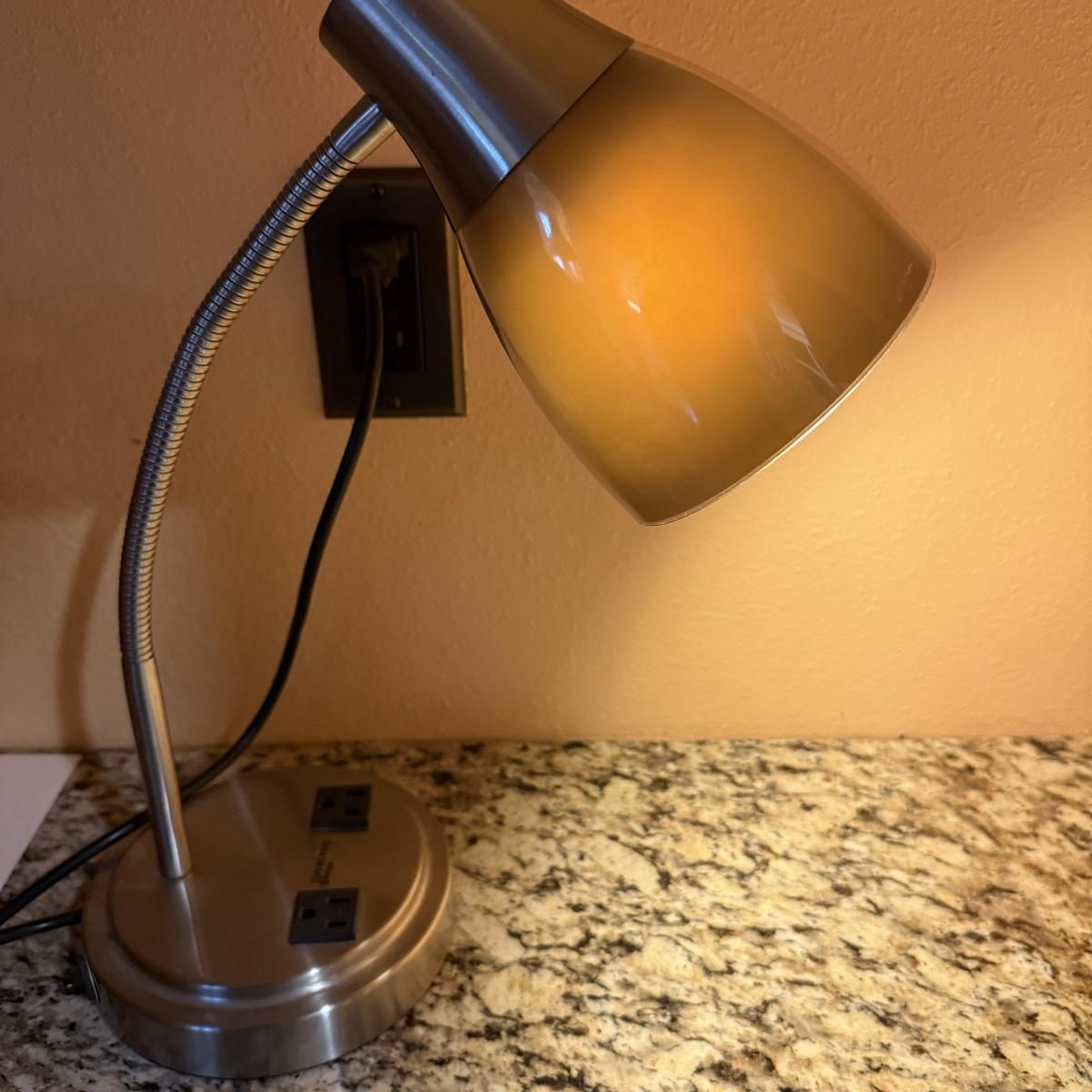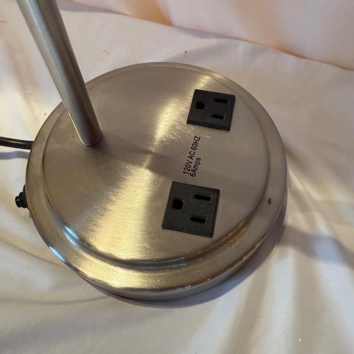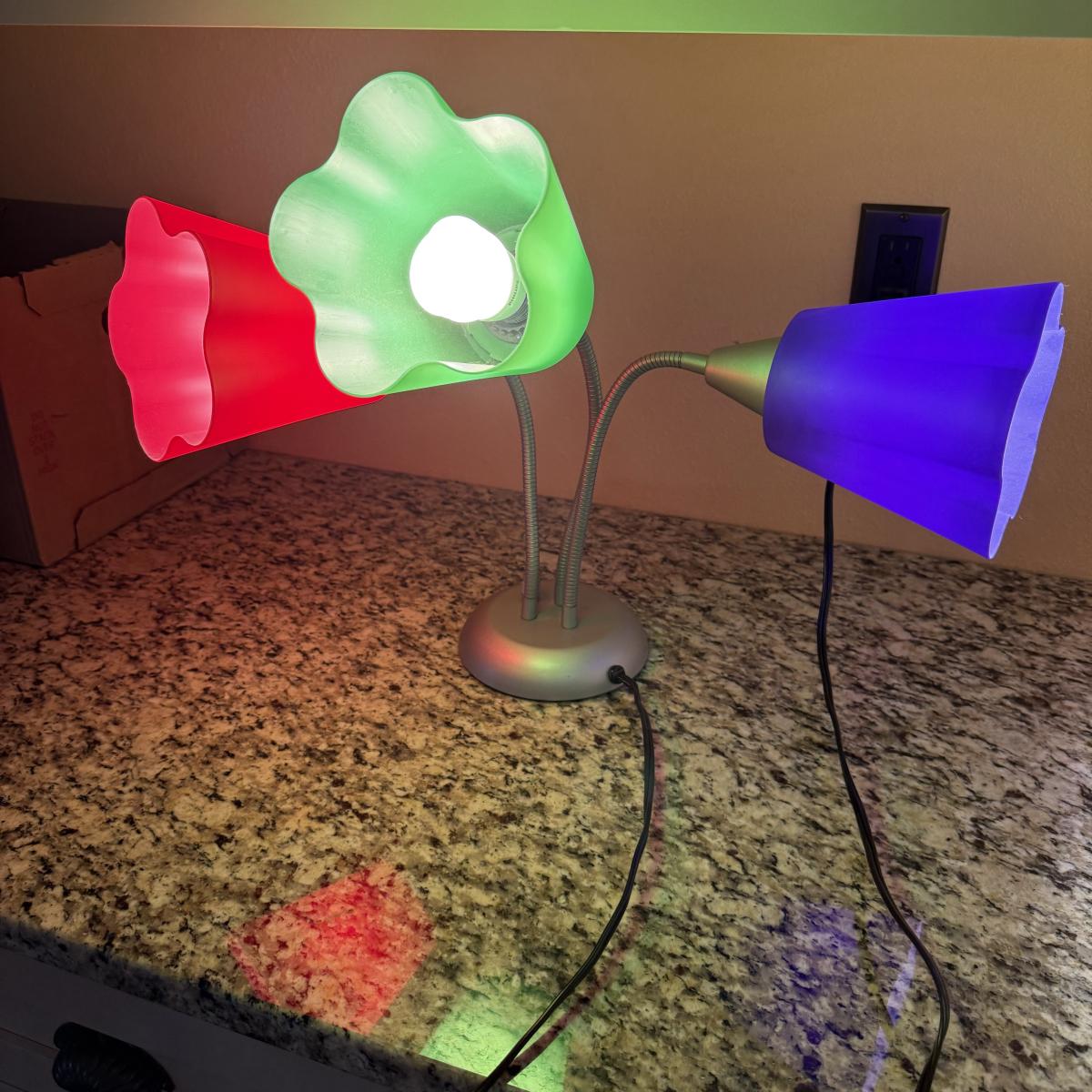 Two desk lamps. The three lamp light operate altogether or one at a time as shown in the photos. The base of this light measures approximately 6”D and is 20”H. The gray desk light’s base is 7”D and is 14”H.