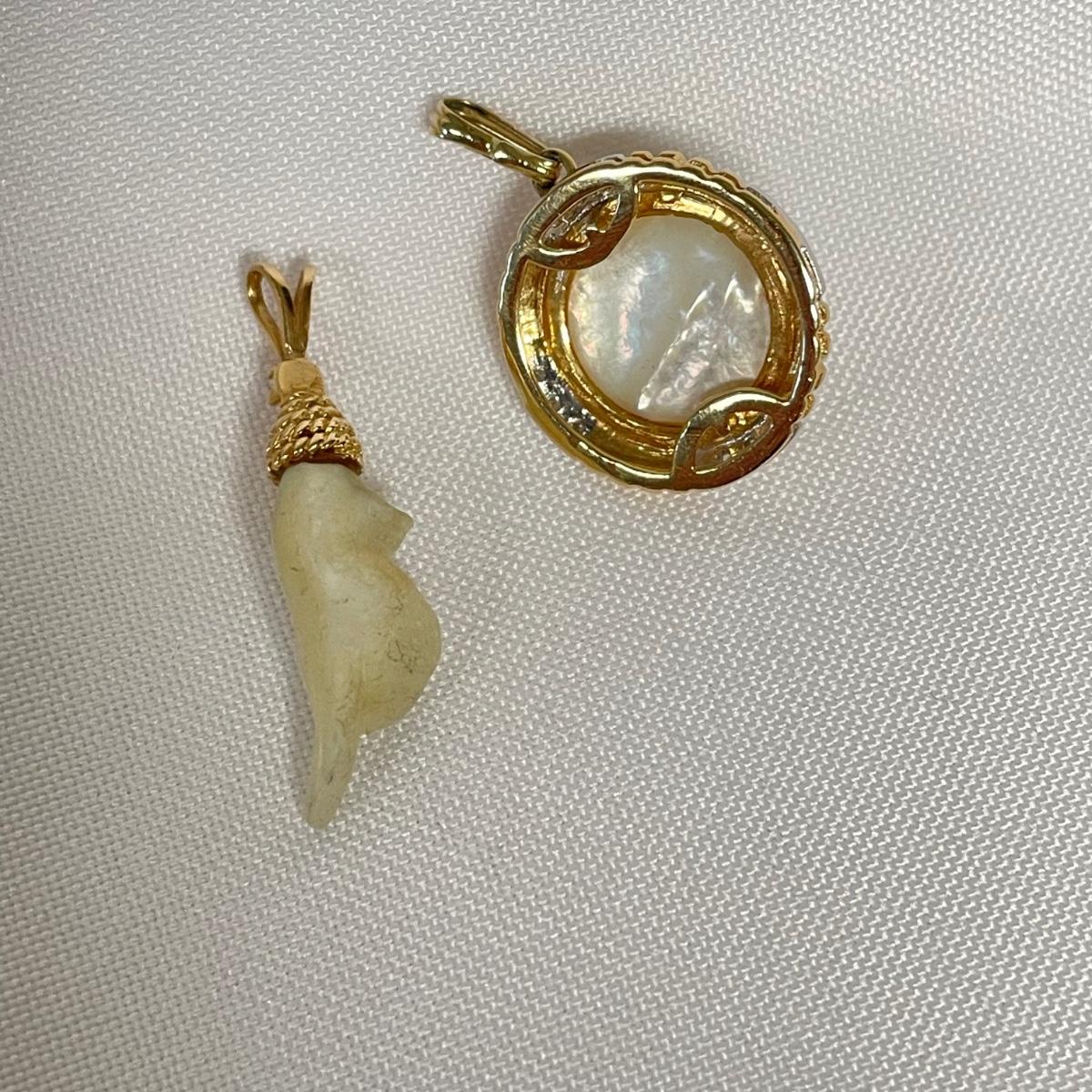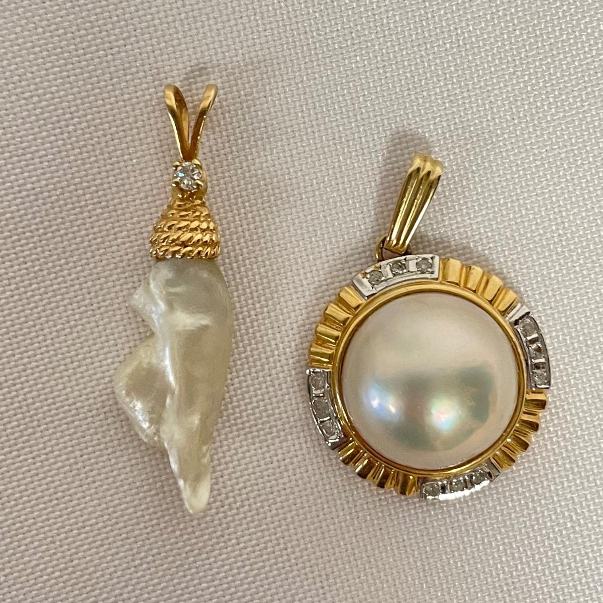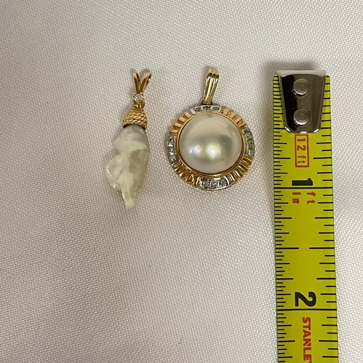 Two beautiful pendants with small stones registering as diamonds on our tester and pearl-like centerpieces. The gold colored metal doesn’t appear to have any markings. See images. Shipping available. All sales are final. No returns or refunds. Please bid accordingly.