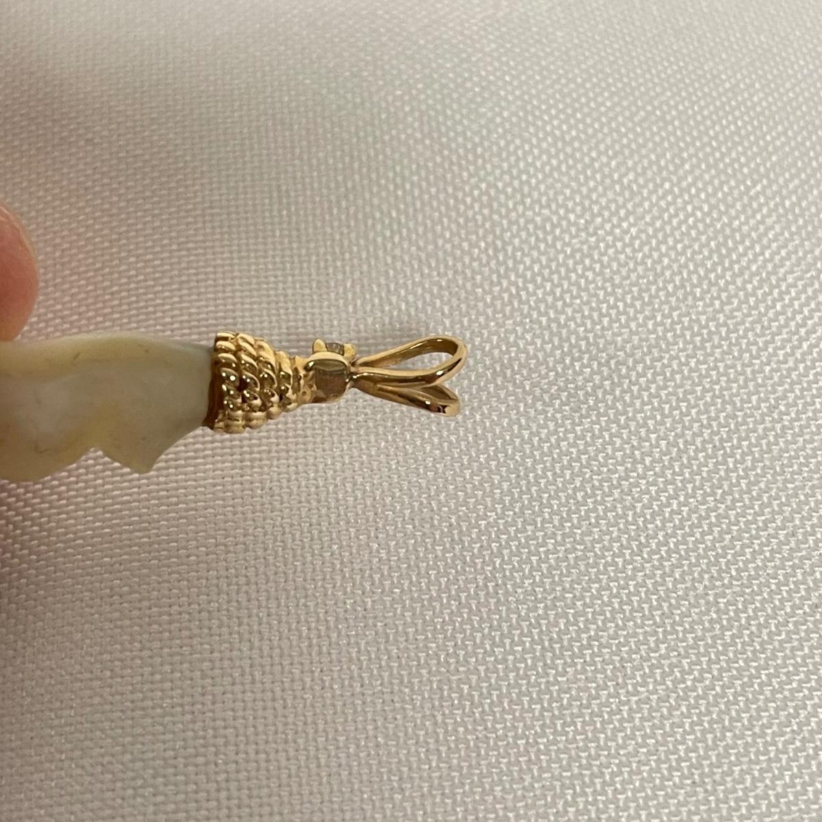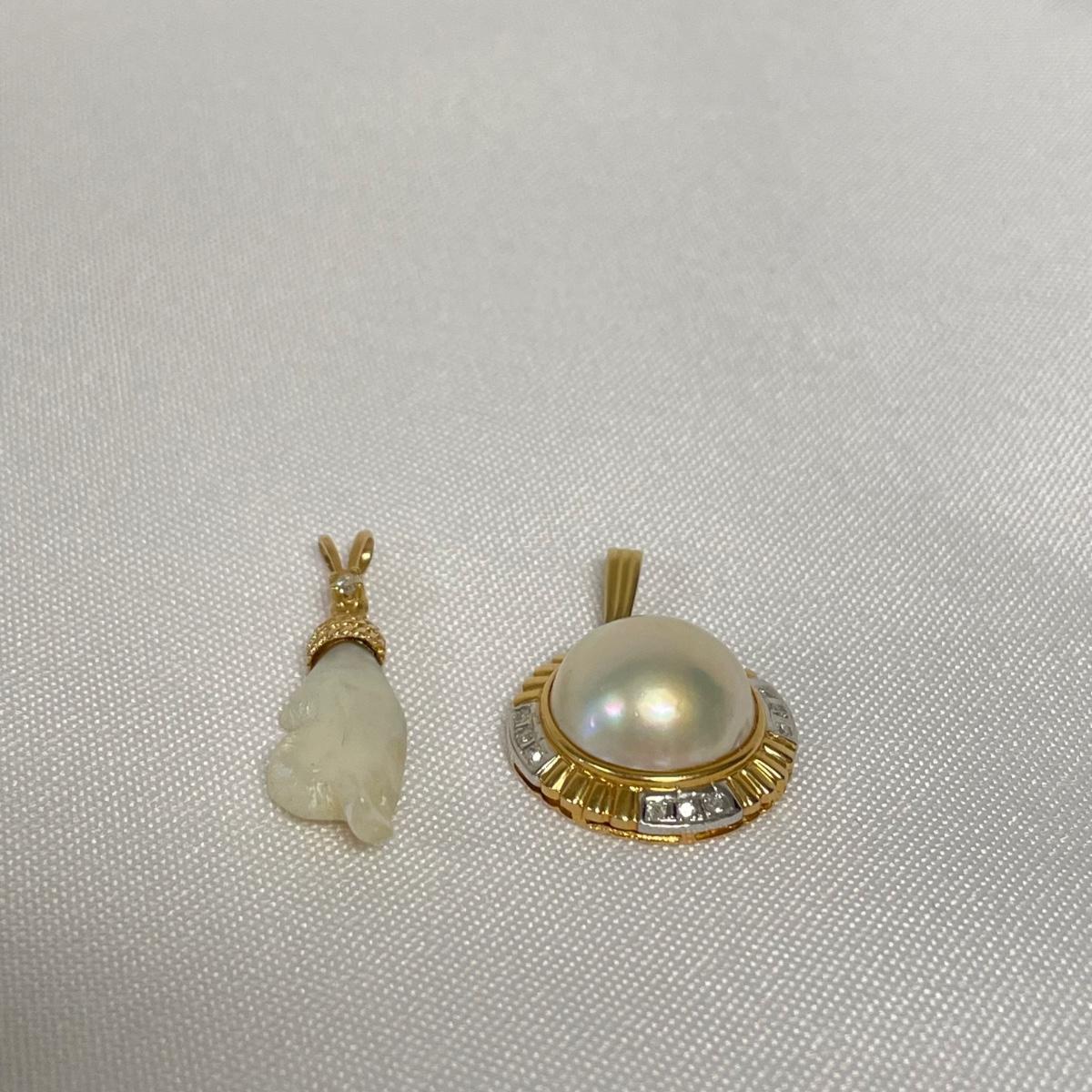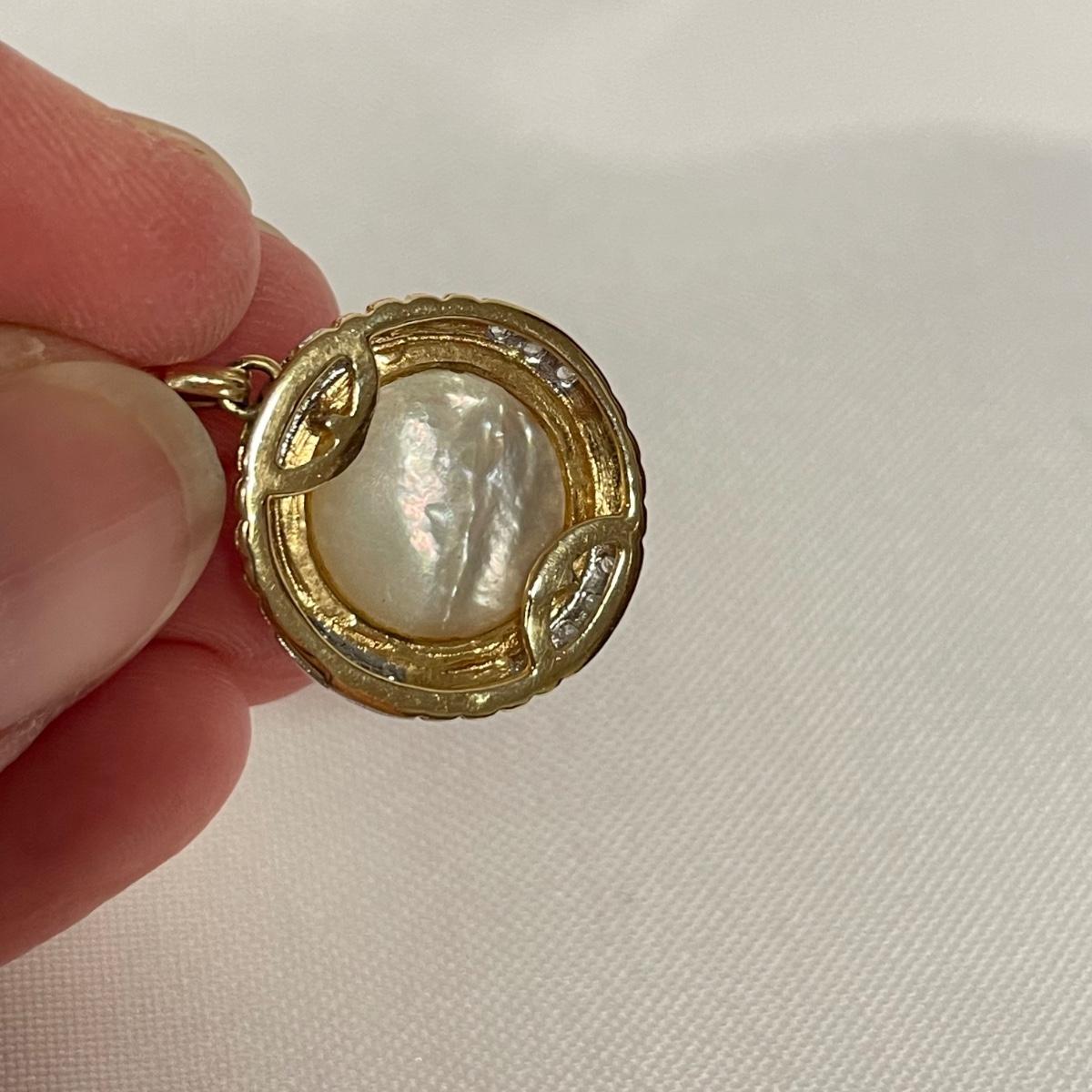 Two beautiful pendants with small stones registering as diamonds on our tester and pearl-like centerpieces. The gold colored metal doesn’t appear to have any markings. See images. Shipping available. All sales are final. No returns or refunds. Please bid accordingly.