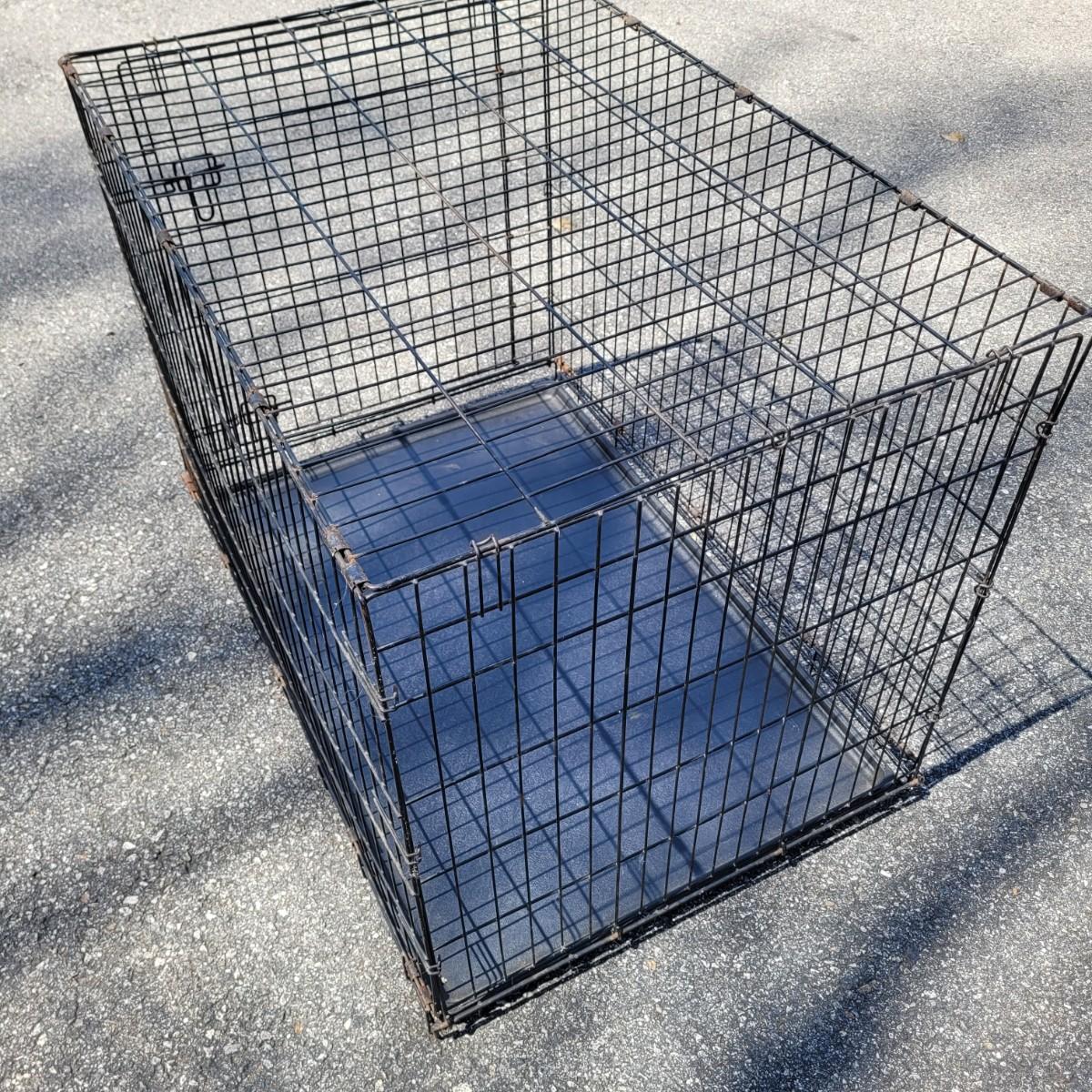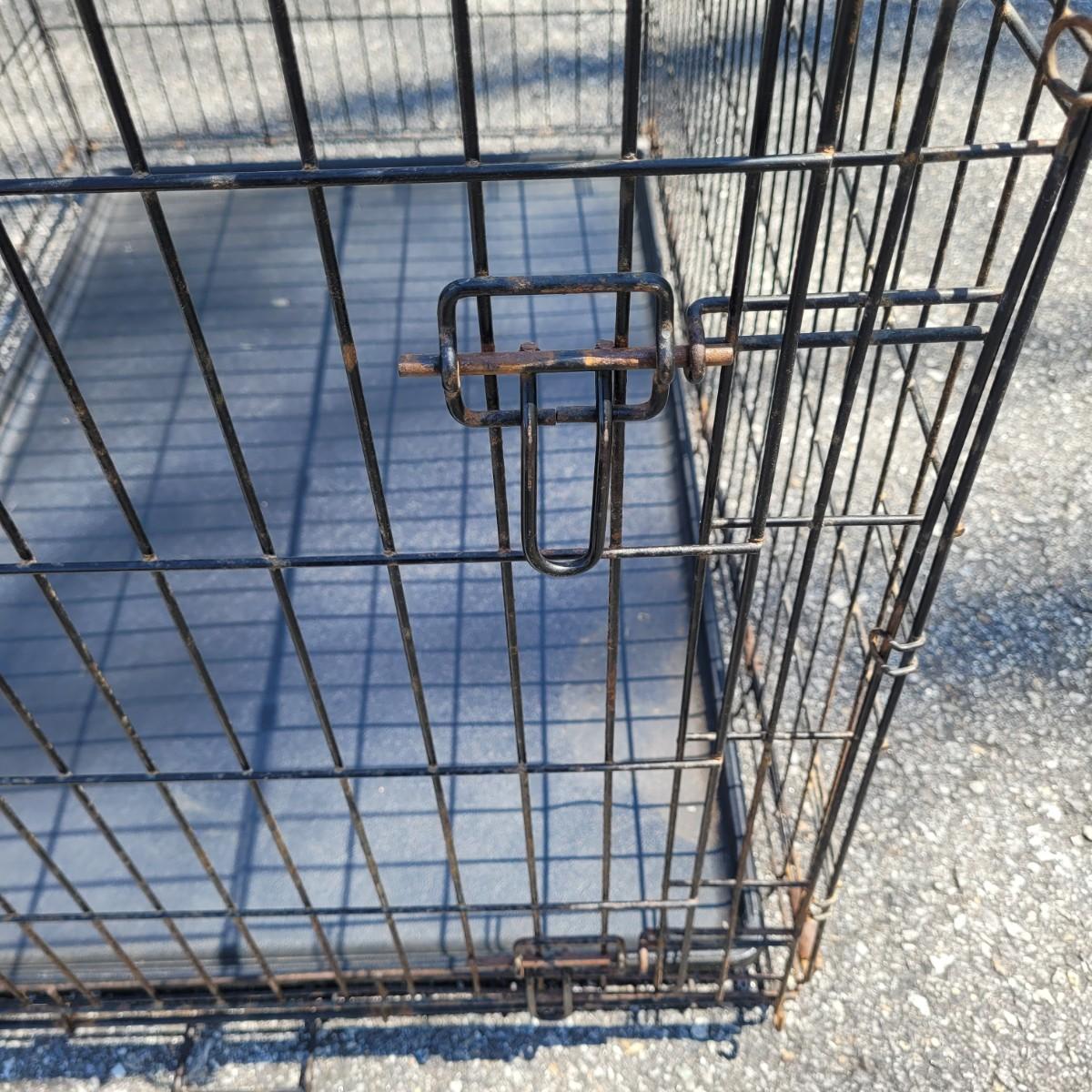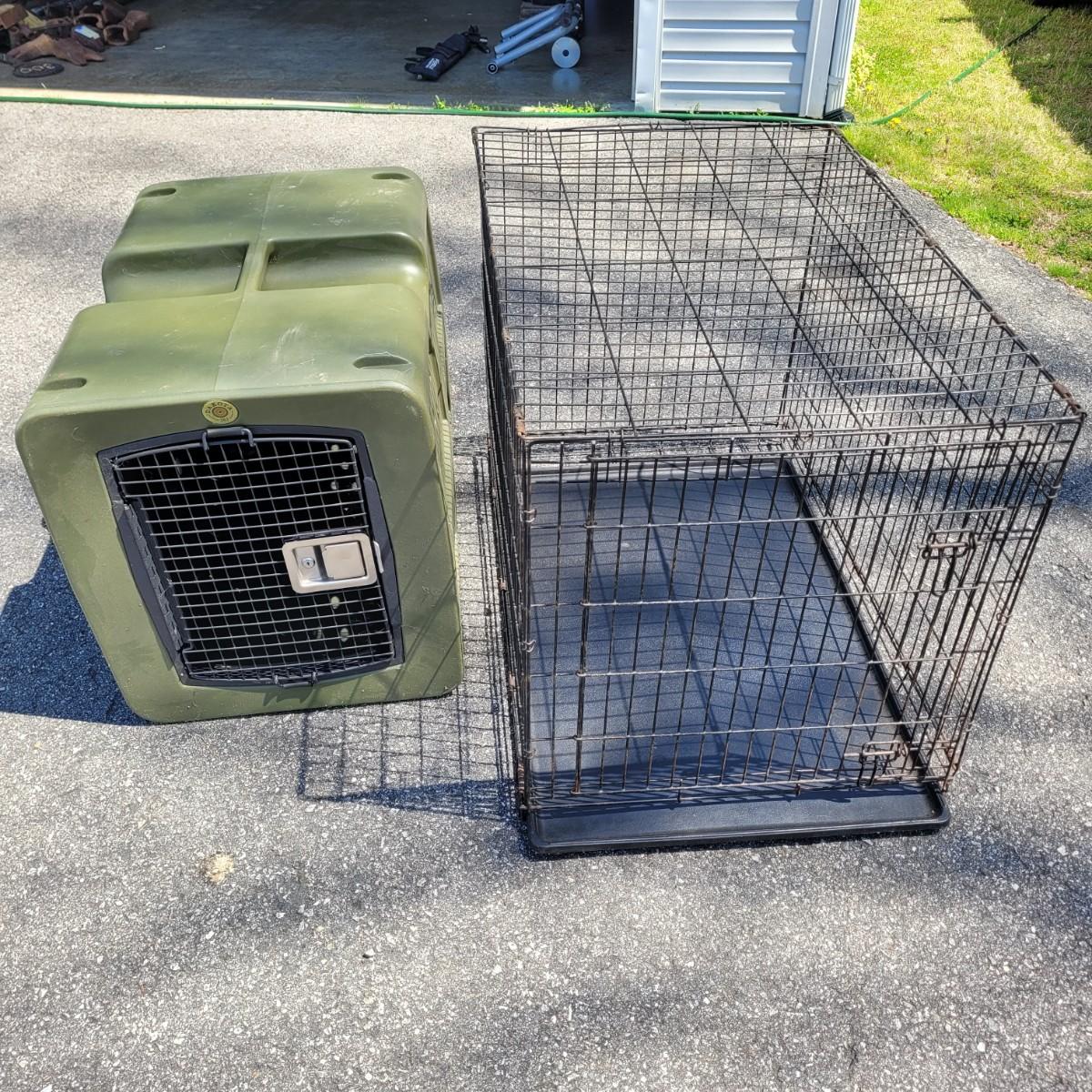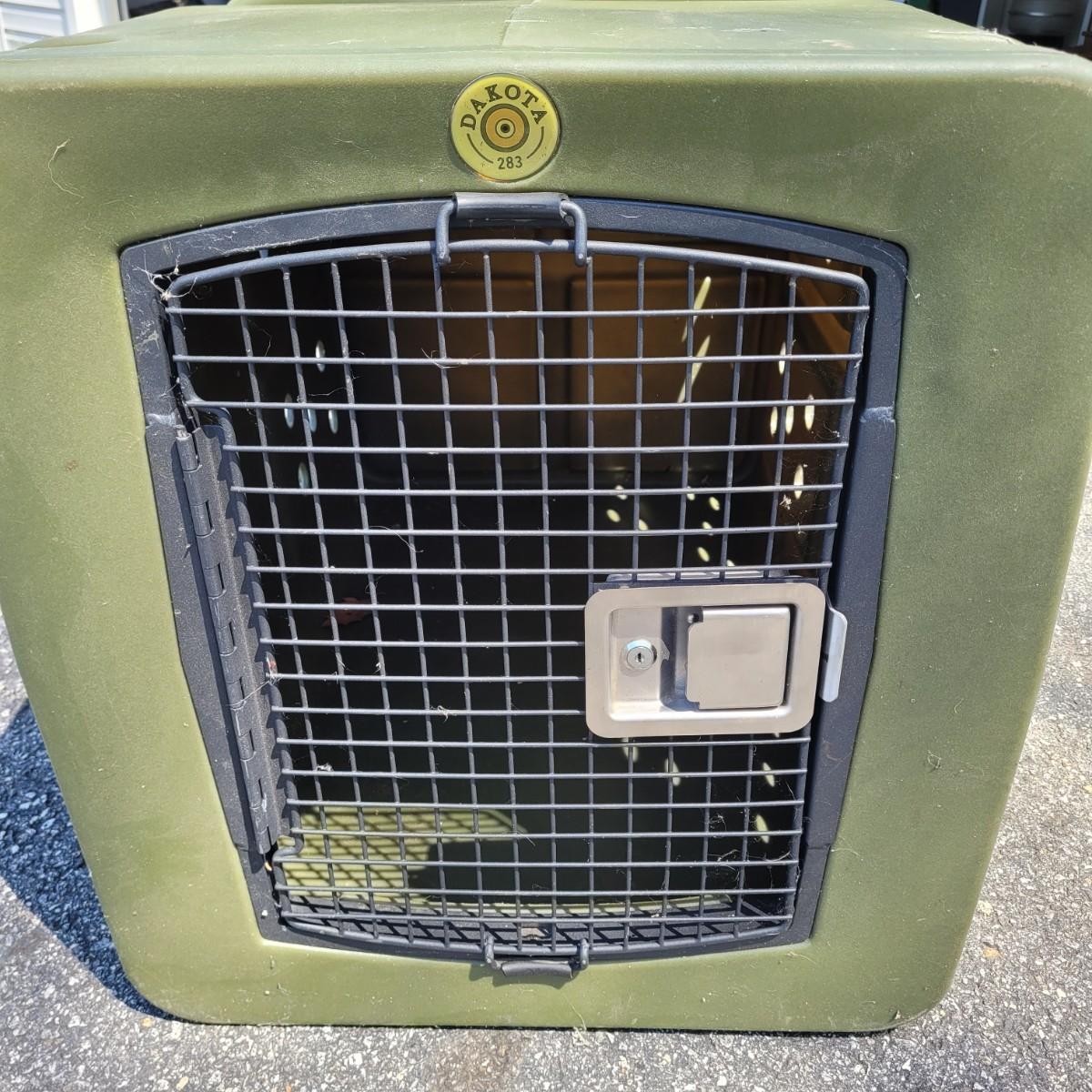 This lot has two dog Kennels. The first is a Dakota 283 G3 Framed Door Dog Kennel designed for pet protection and the second is a generic metal wire kennel. The Dakota brand is made in one solid piece for strength and security and features a stainless-steel door with a secure, lockable paddle latch. Key not included. Metal wire kennel features two locking latches and a removable plastic base for easy cleaning; this kennel shows rust. Green kennel measures 24" x 35" x 27"H. Black wire kennel measures 28" x 42" x 31"H.