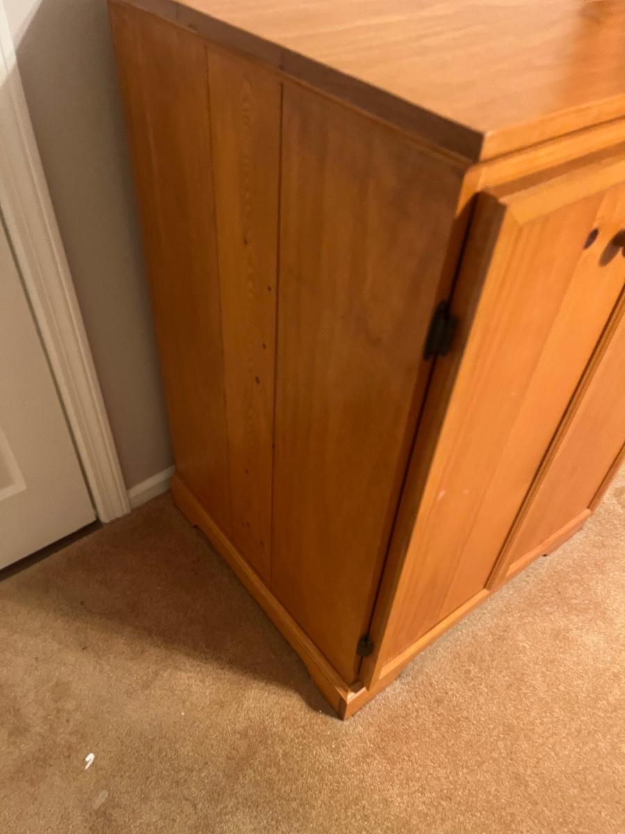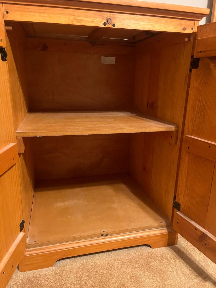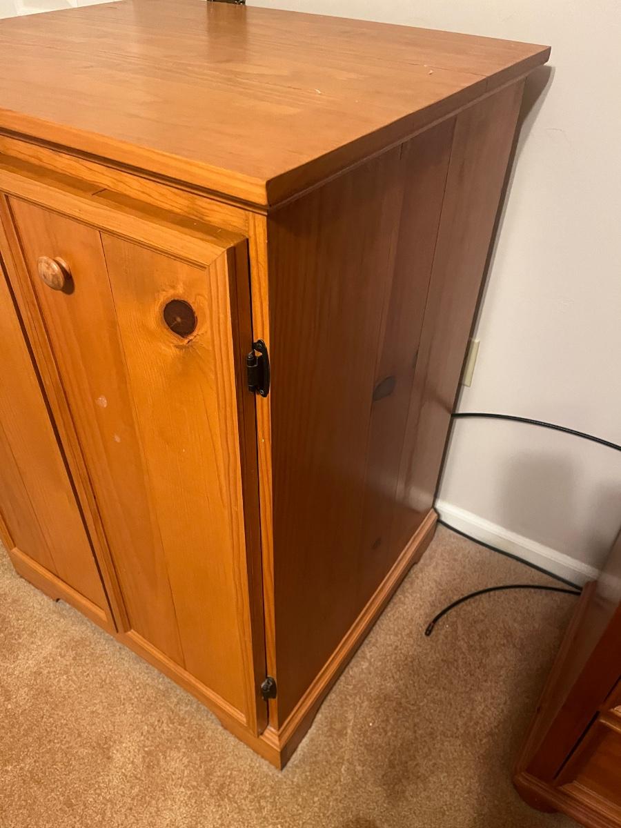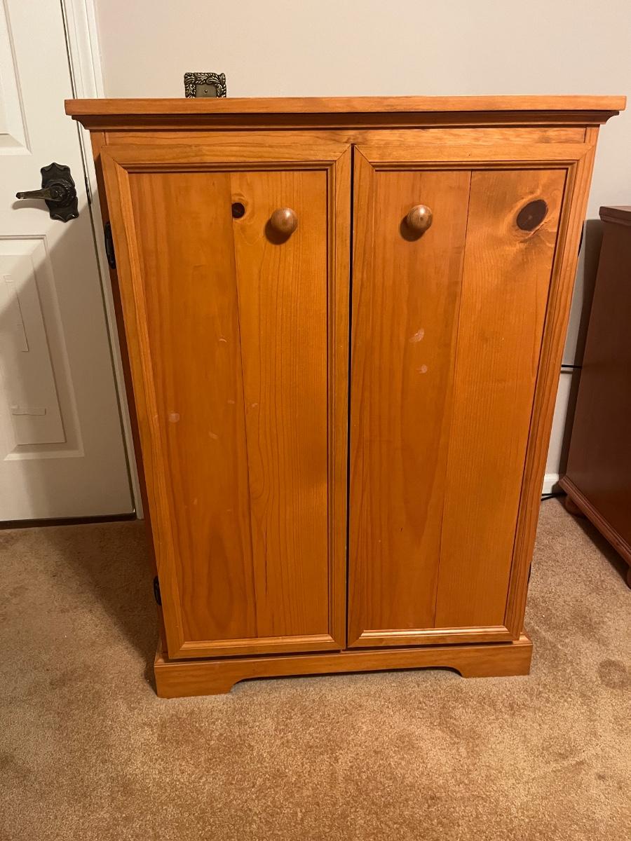 Lot includes a solid wood light colored (possibly pine) two door cabinet that measures 30” x 26” x 41.5”H. Cabinet has a hole cut in back as it was being used as an entertainment cabinet. Item matches other items in auction.