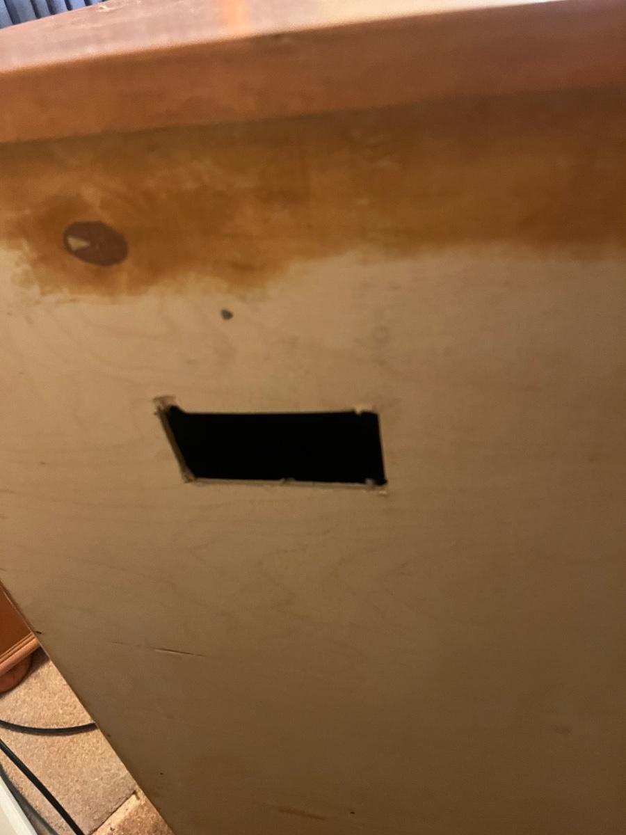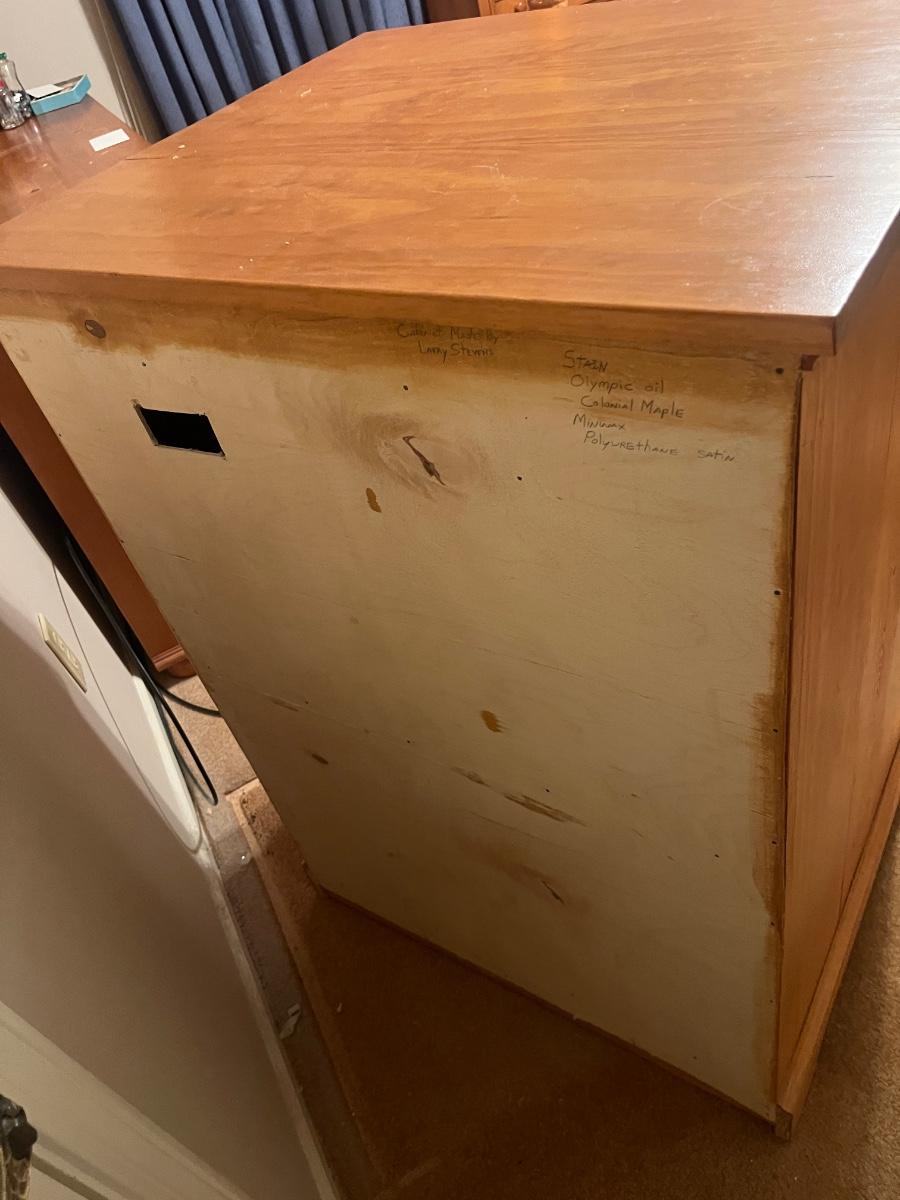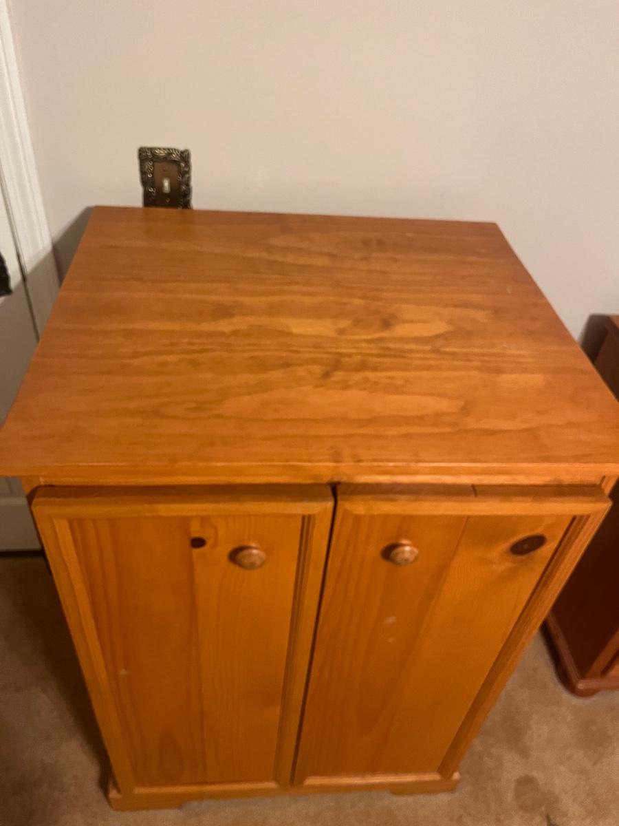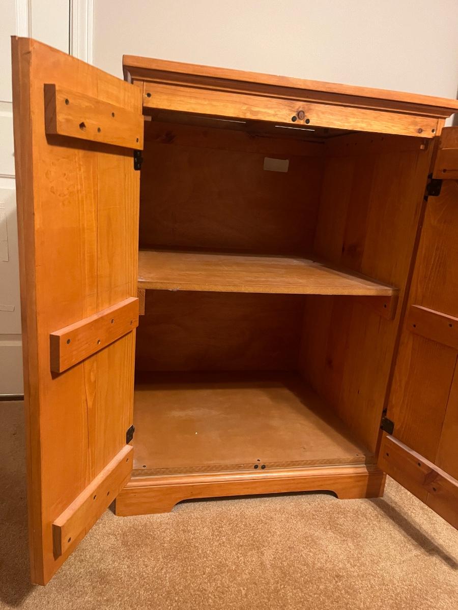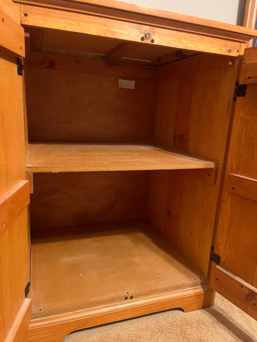 Lot includes a solid wood light colored (possibly pine) two door cabinet that measures 30” x 26” x 41.5”H. Cabinet has a hole cut in back as it was being used as an entertainment cabinet. Item matches other items in auction.