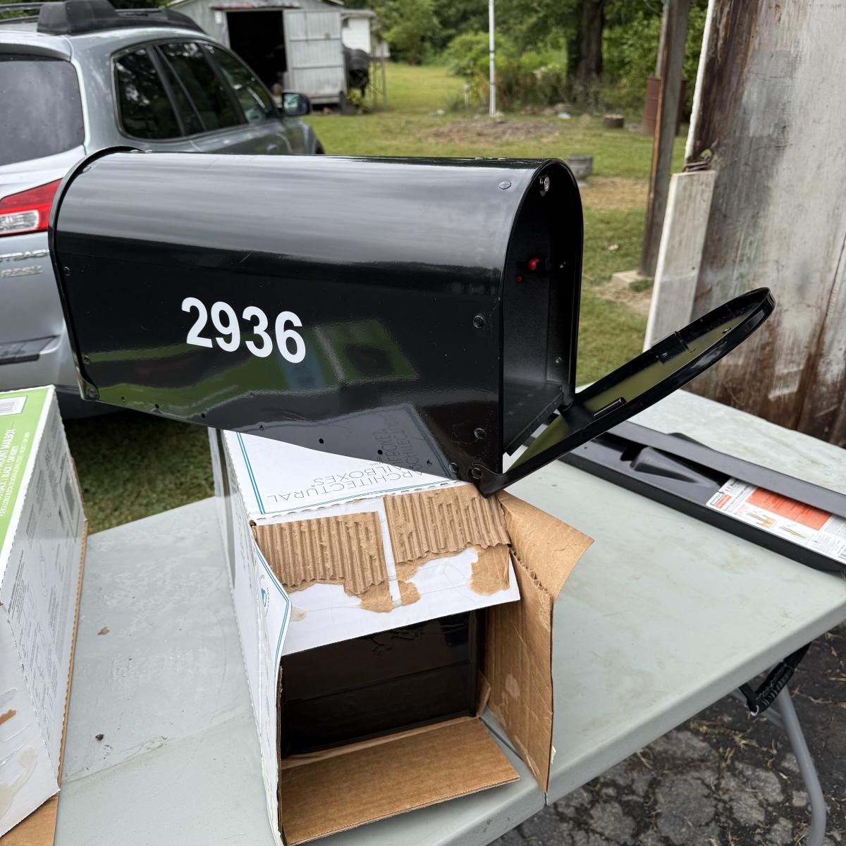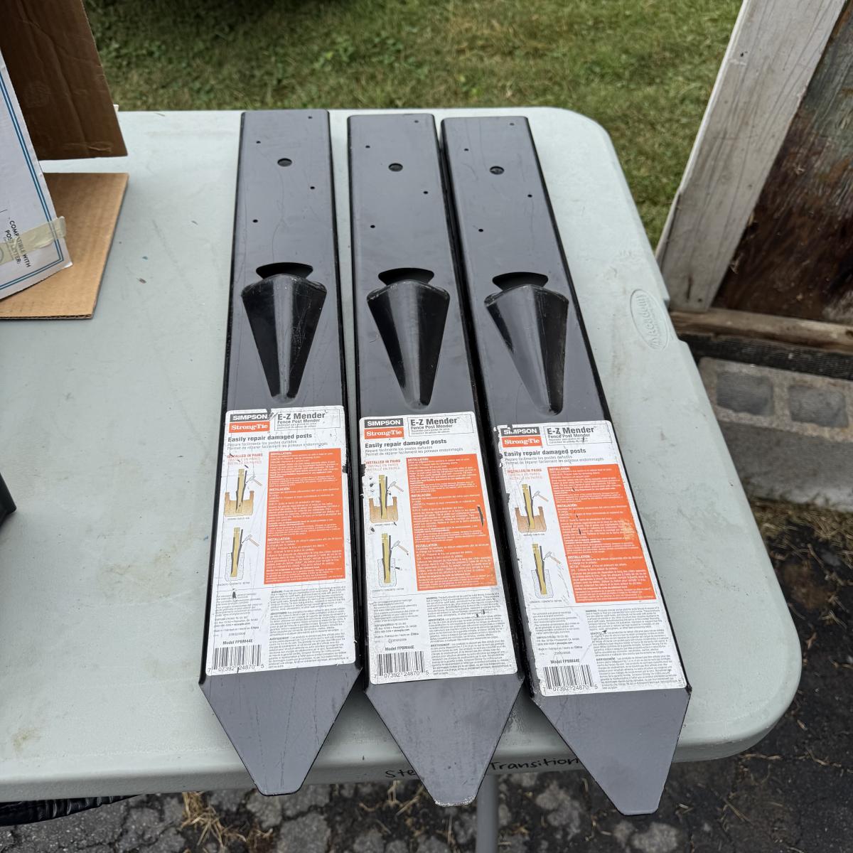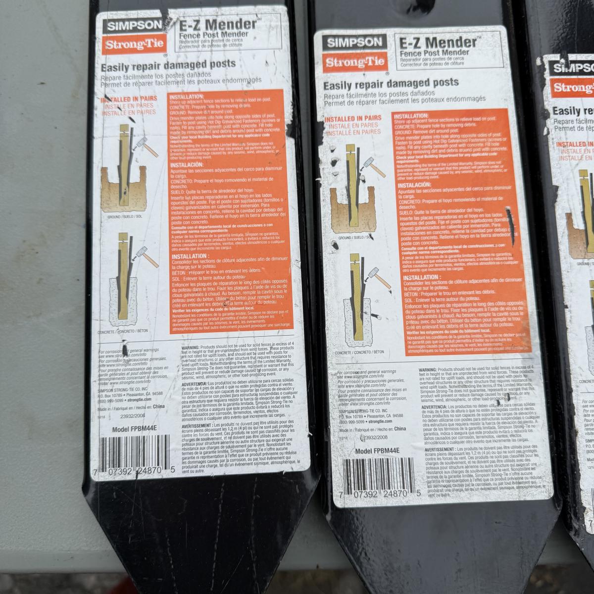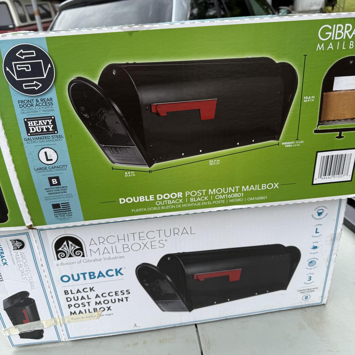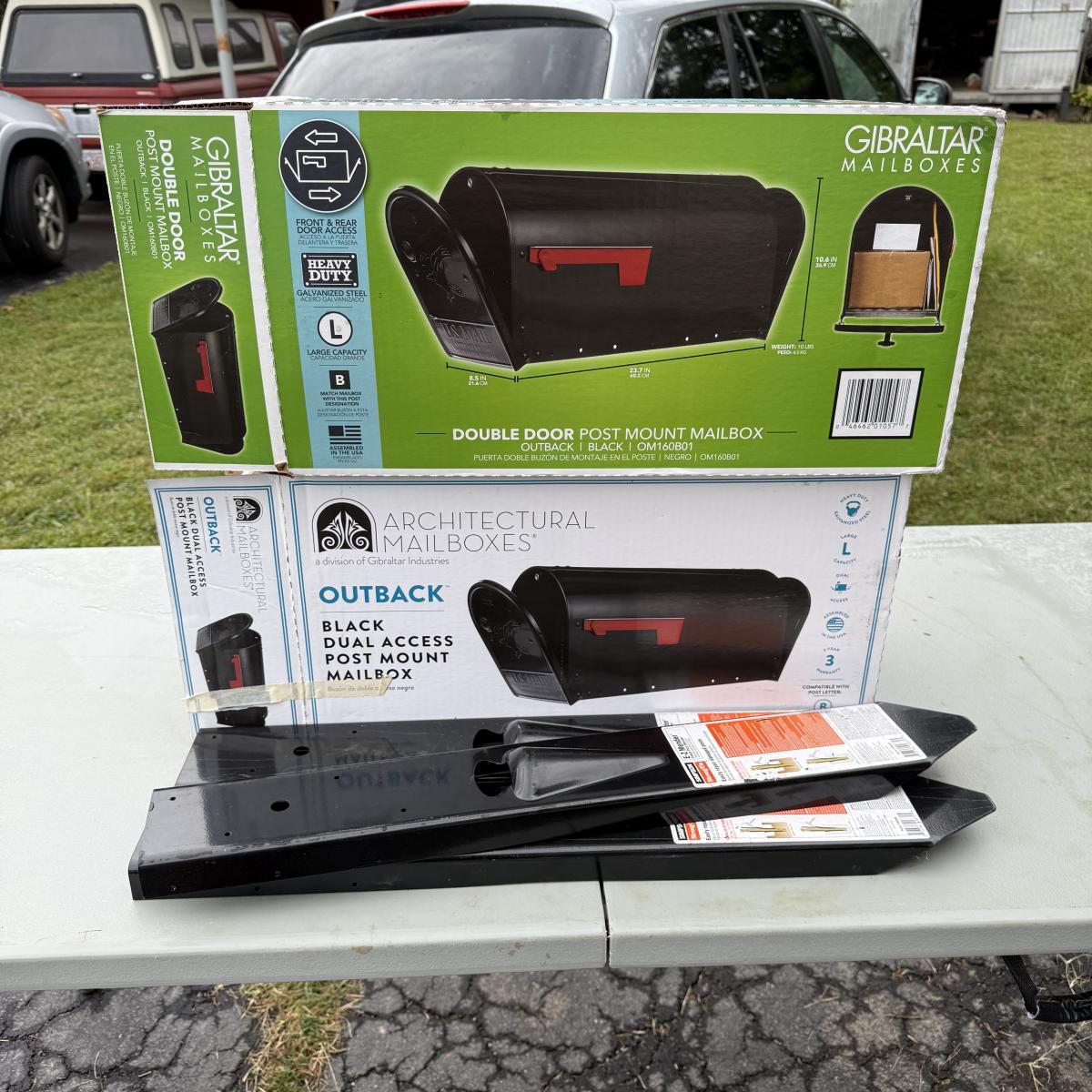 This lot contains two double door mailboxes as well as three E-Z Mender fence post mender. They both measure 8.5” x 23.5” x 10.5”H. The fence posts measures 4” x 28”. One of the mailbox's back door is a bit bent, see pictures for details. Local pick up only.