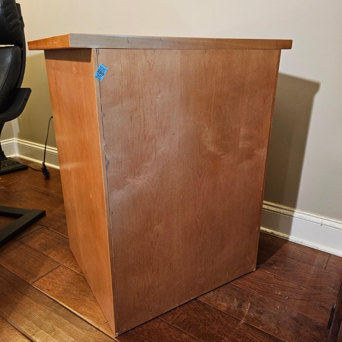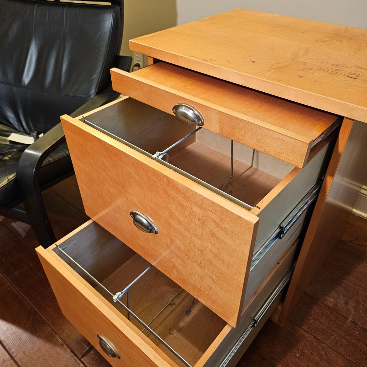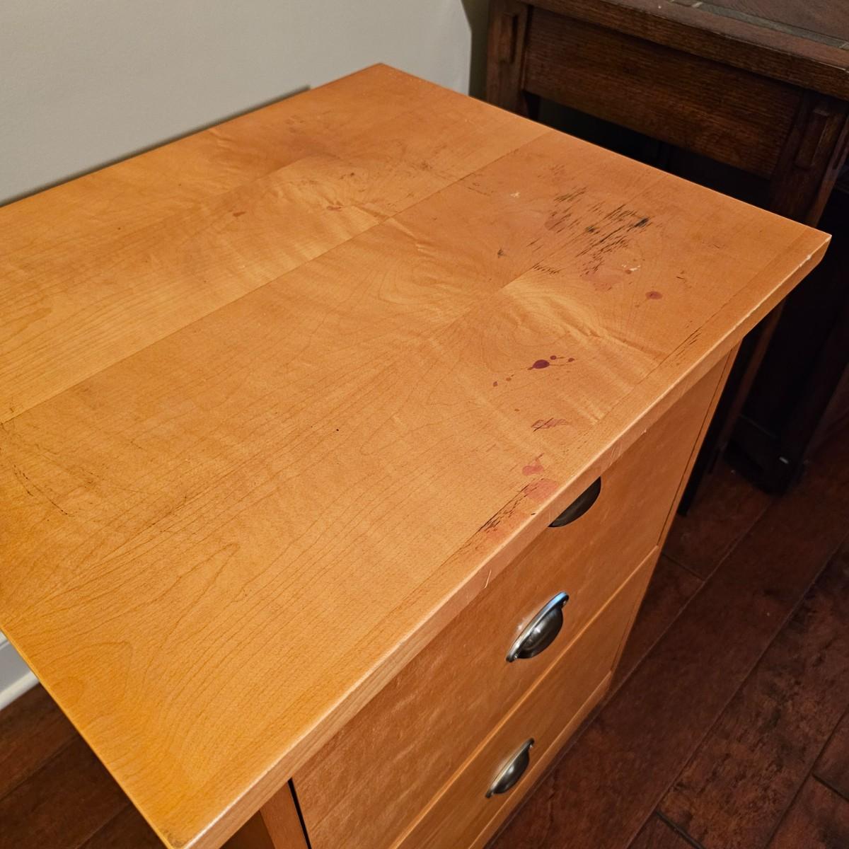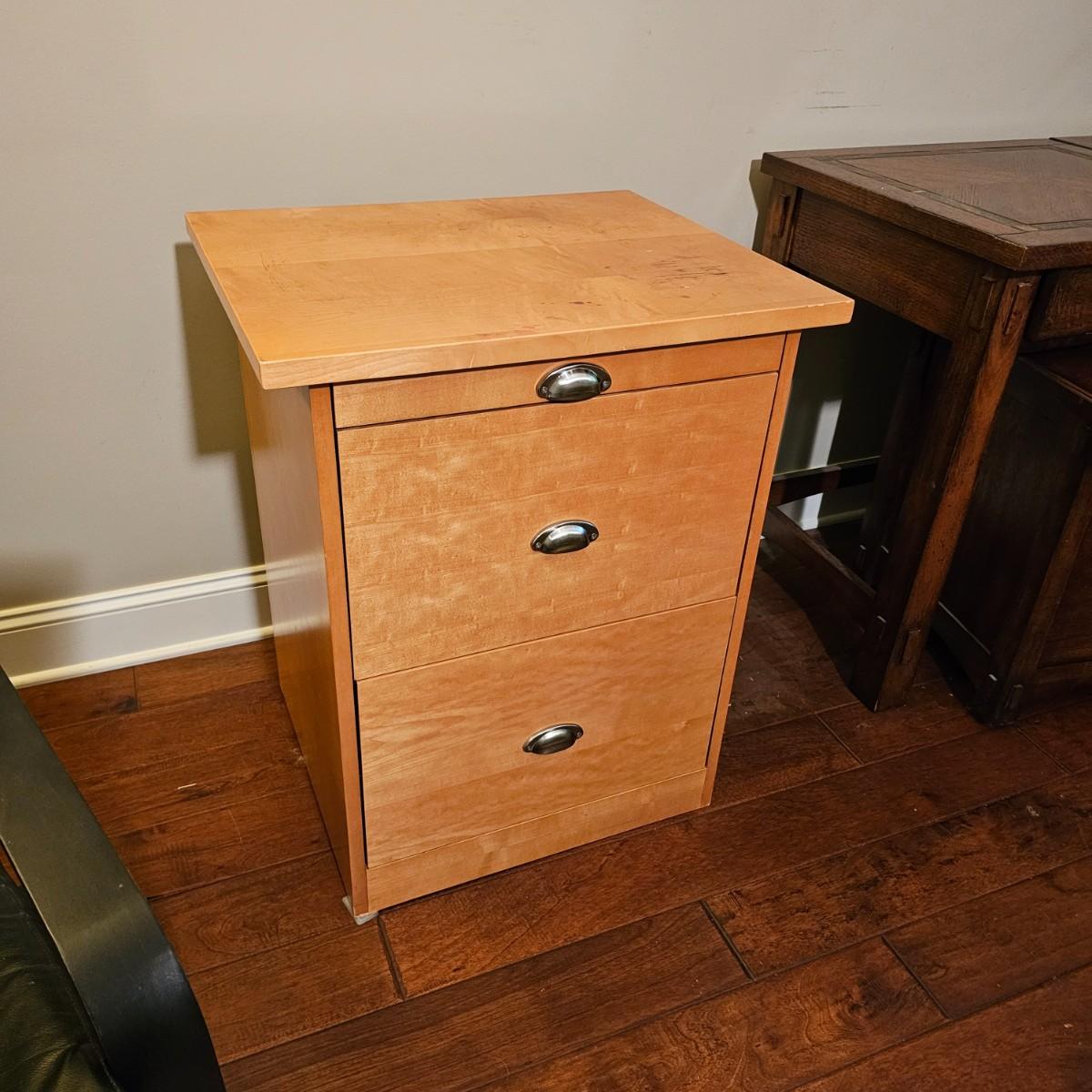 Maple colored file cabinet with two drawers and a pull out shelf for sorting. Drawers have metal racks for hanging file sideways. Piece appears to be solid wood. Piece measures 24" x 20" x 30"H, has some small nicks and blemishes on front and top. See photos for details. Local pickup only. Winning bidder must bring assistance to help move and load this item due to its weight and/or size.