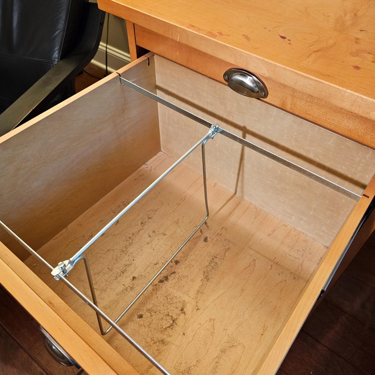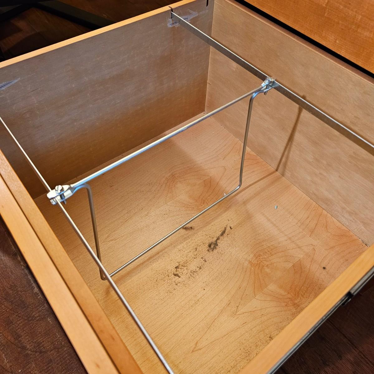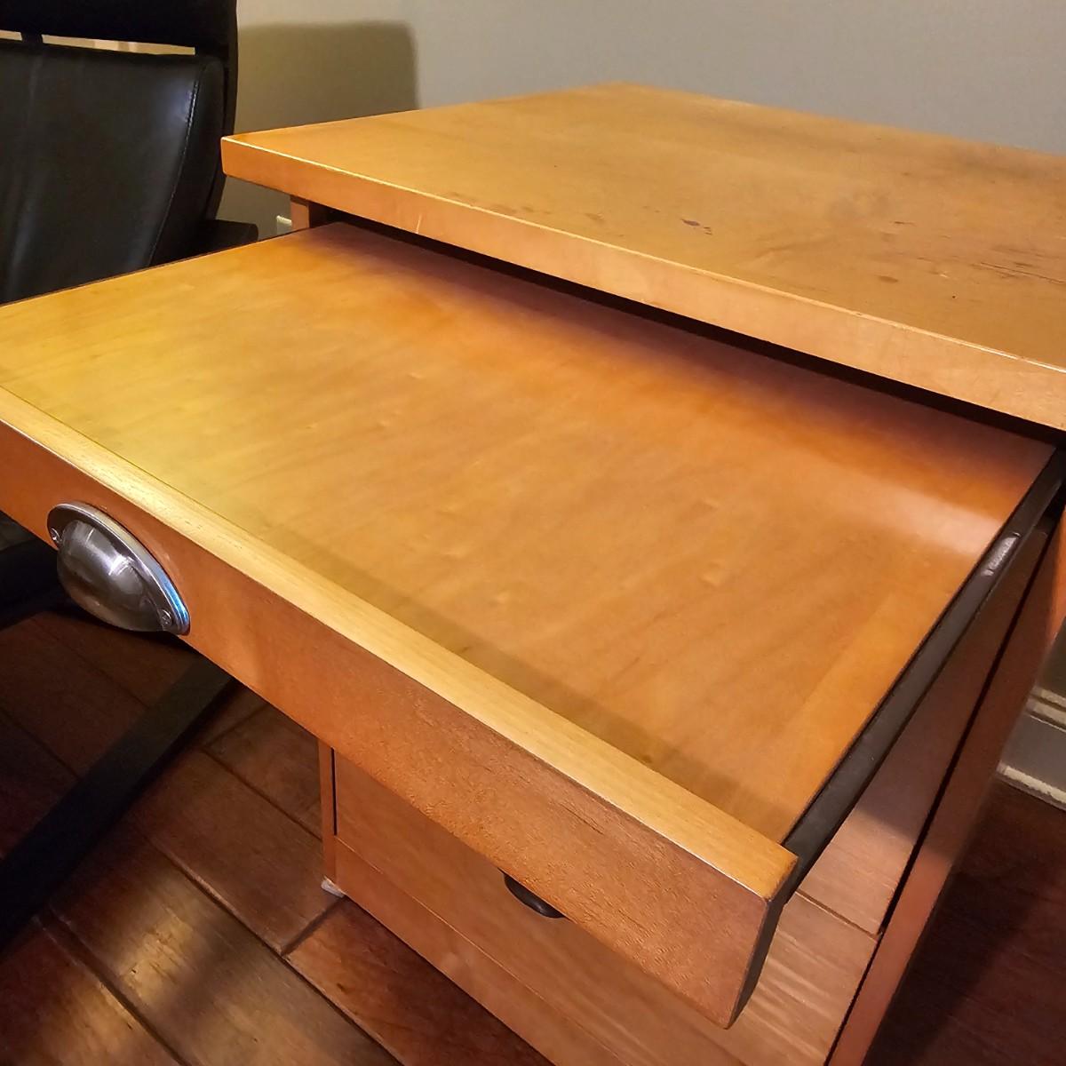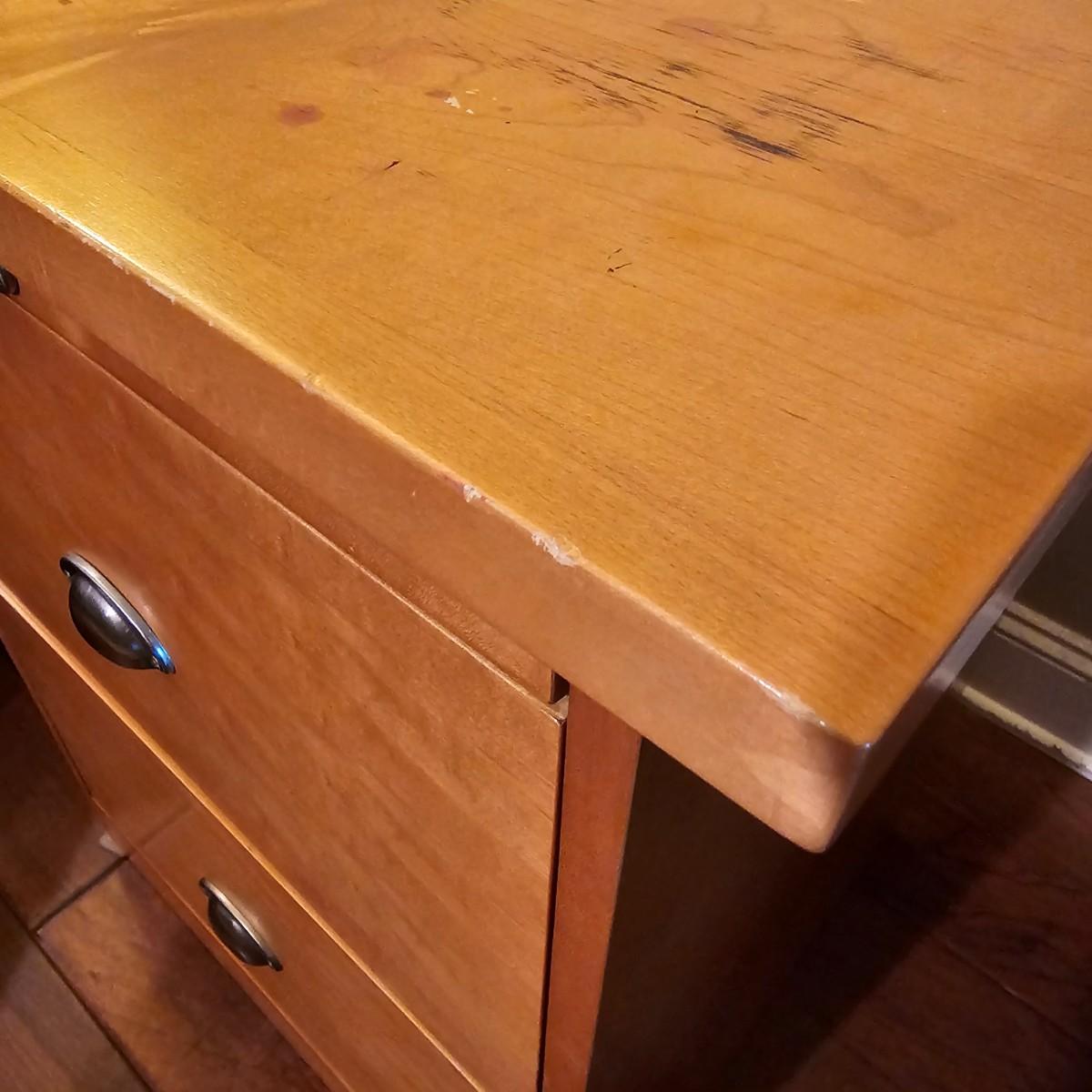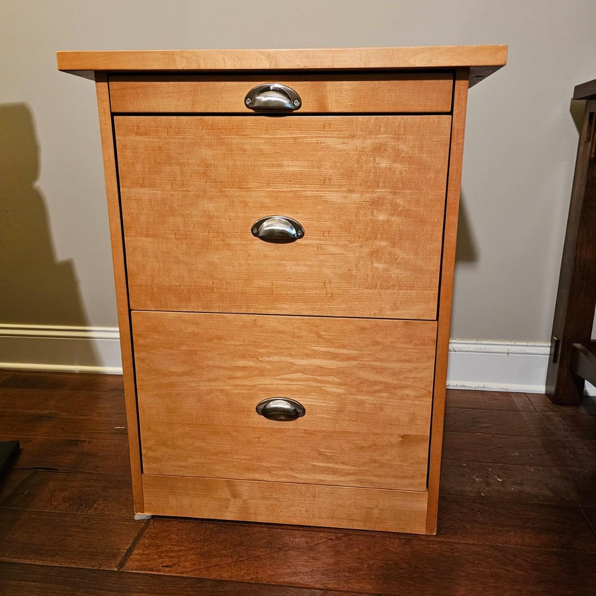 Maple colored file cabinet with two drawers and a pull out shelf for sorting. Drawers have metal racks for hanging file sideways. Piece appears to be solid wood. Piece measures 24" x 20" x 30"H, has some small nicks and blemishes on front and top. See photos for details. Local pickup only. Winning bidder must bring assistance to help move and load this item due to its weight and/or size.
