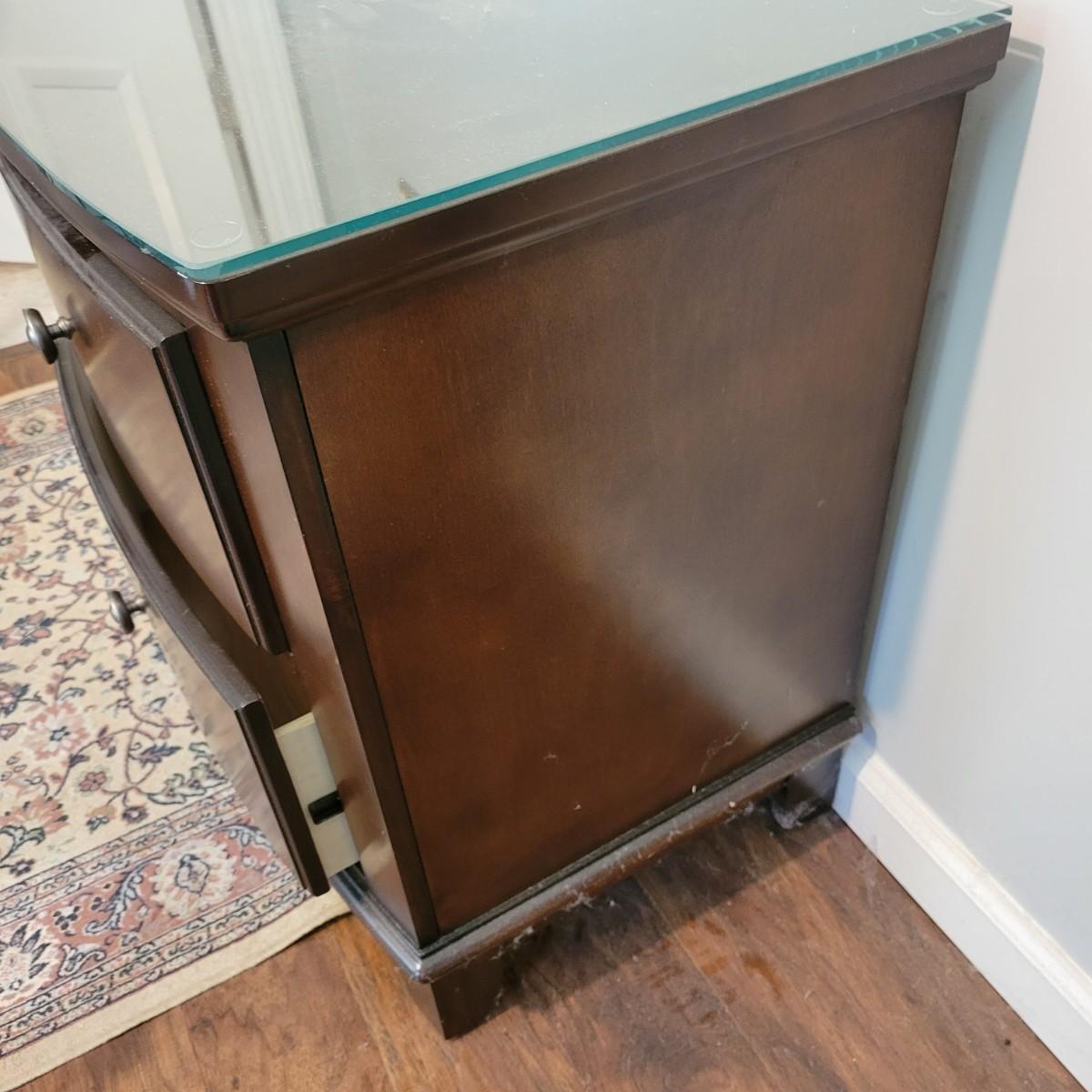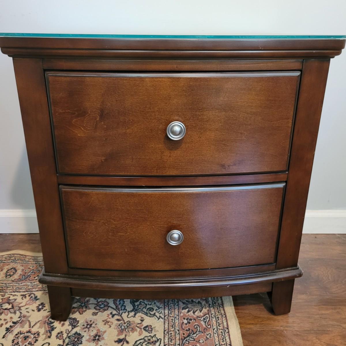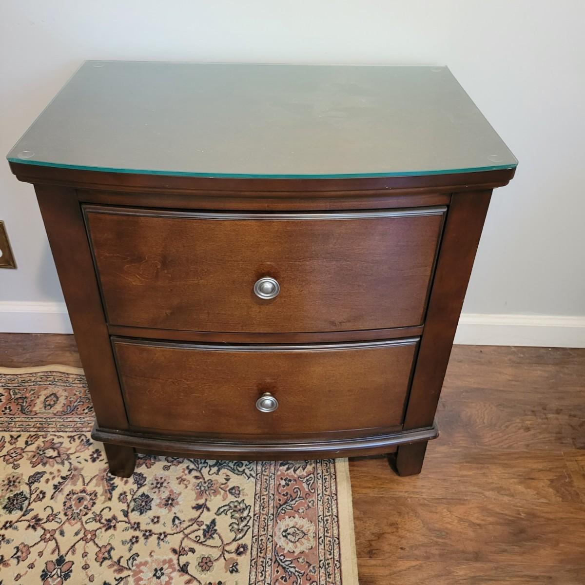 A two drawer night table that has a brushed nickel finished hardware. It includes a tempered glass top and measures approximately 25" x 17" x 26.5"H. Local pickup only