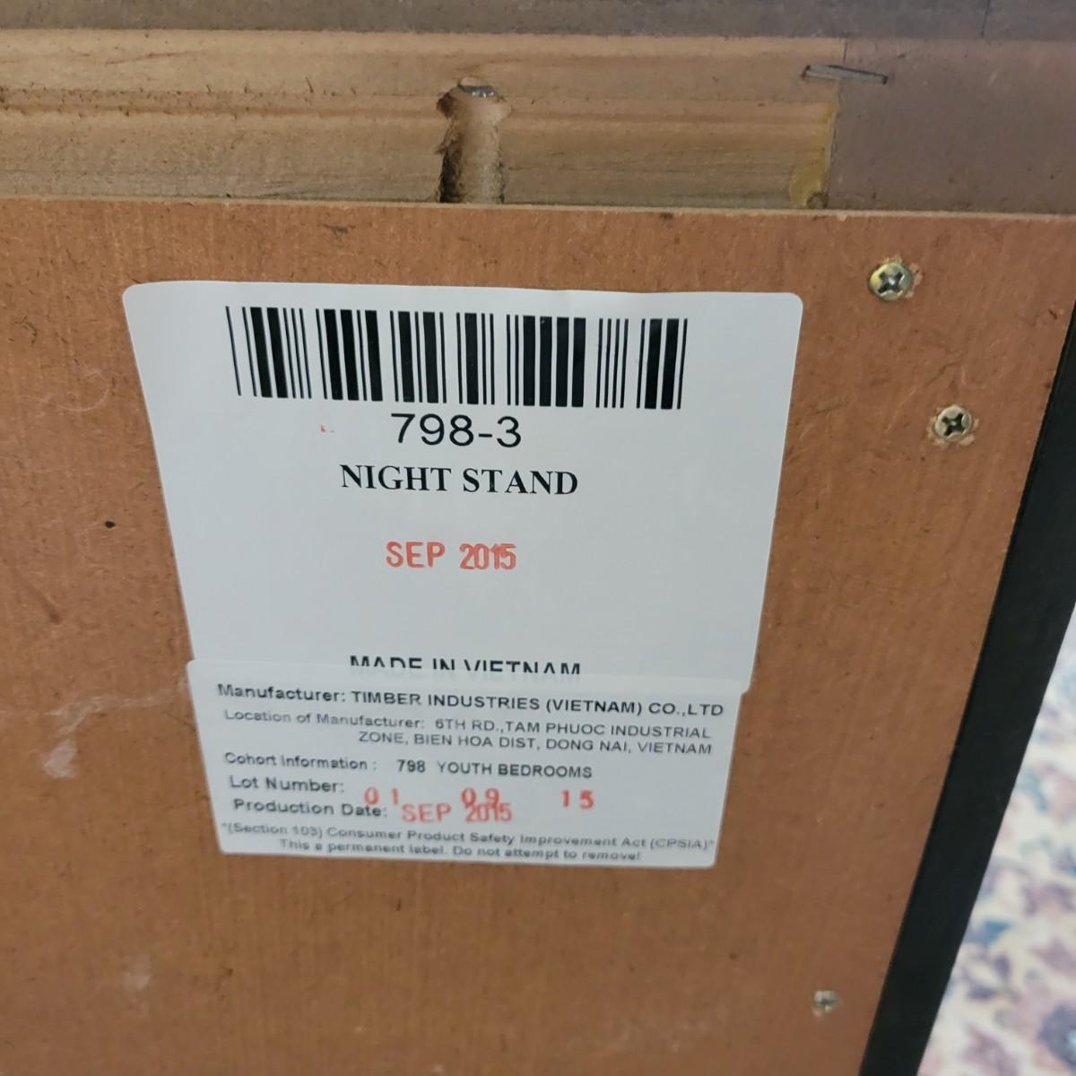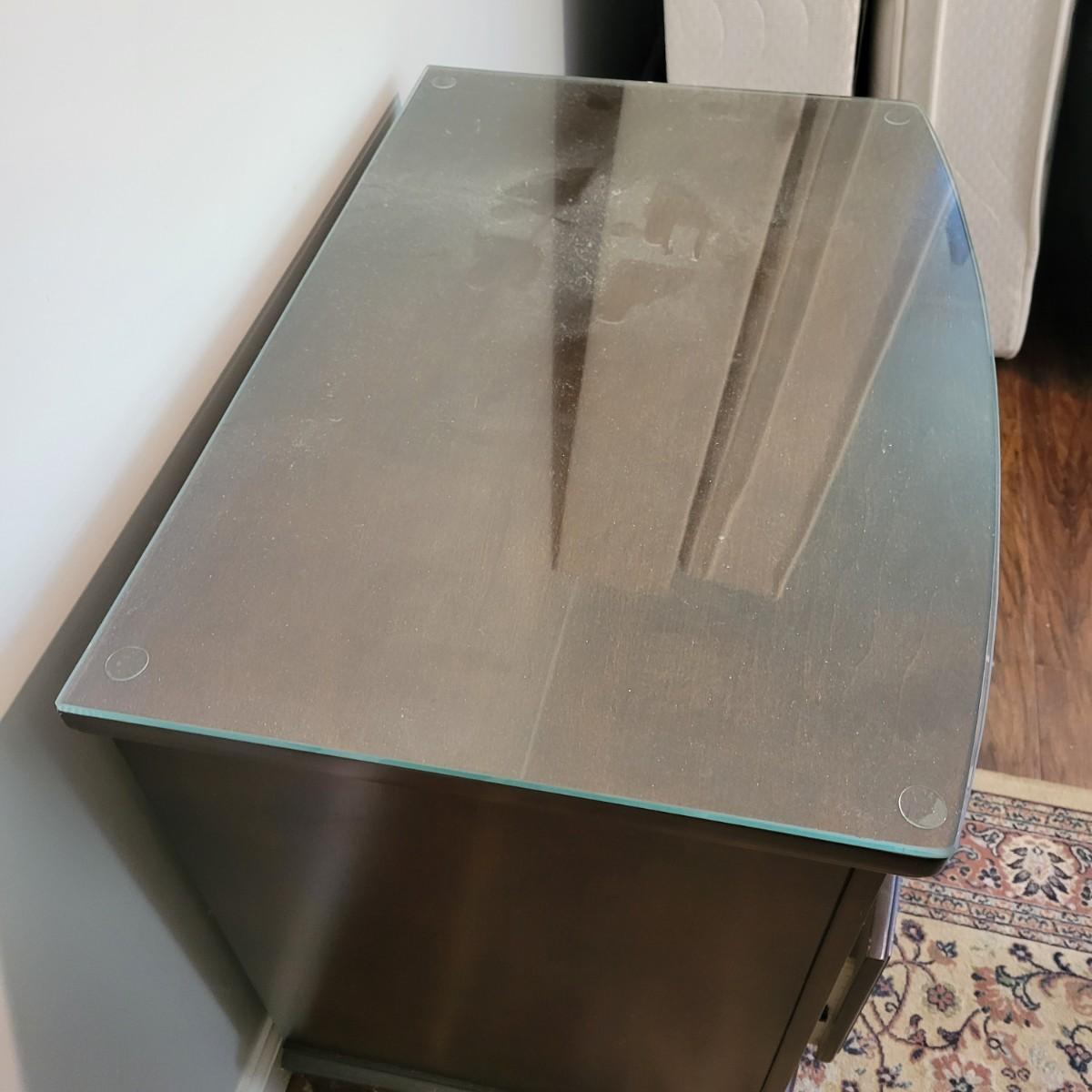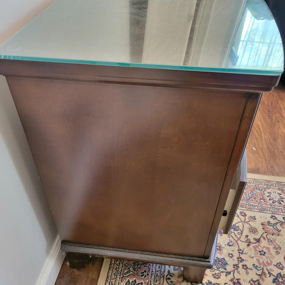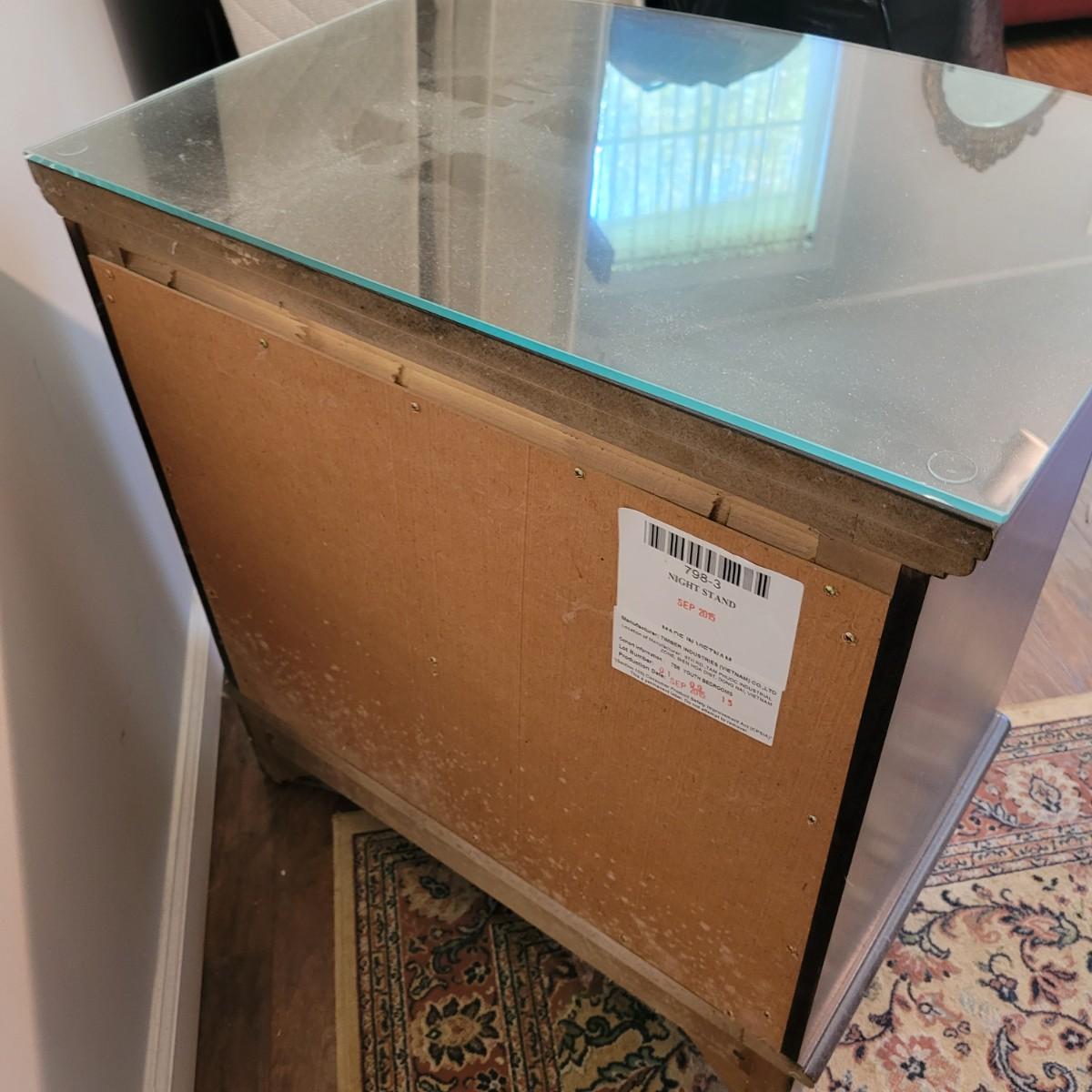 A two drawer night table that has a brushed nickel finished hardware. It includes a tempered glass top and measures approximately 25" x 17" x 26.5"H. Local pickup only