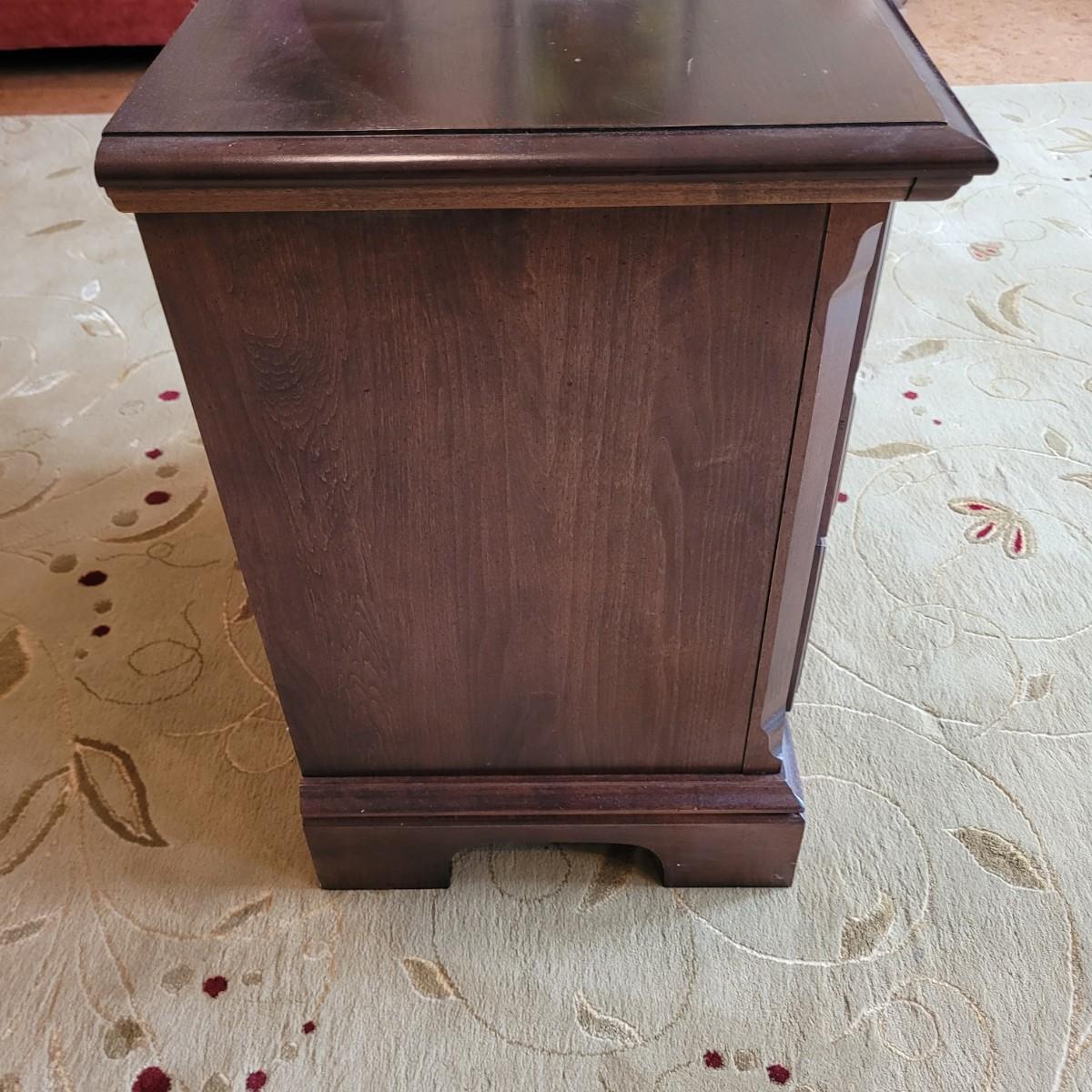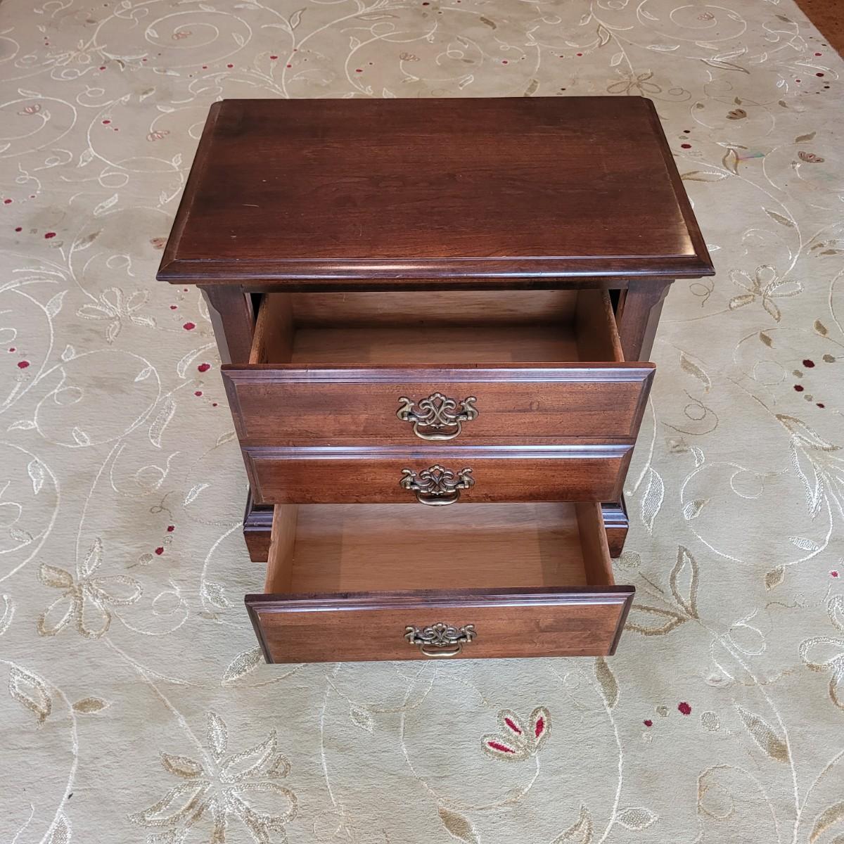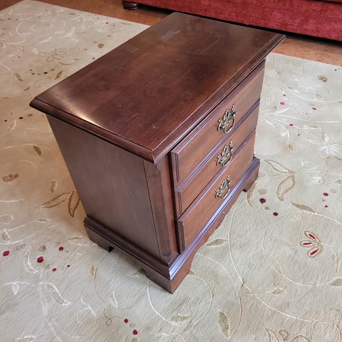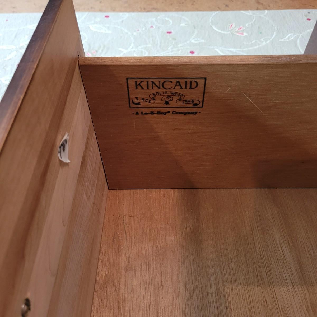 Wooden two drawer traditional style nightstand. Made from solid wood that appears to be cherry. Features two large pull out drawers with metal handles. Has the appearance of three drawers, but the top two are combined into one. Stamped Kincaid furniture company inside the top drawer. Item measures 26.5" x 13" x 25.5"H. Background rug is for sale in another lot.