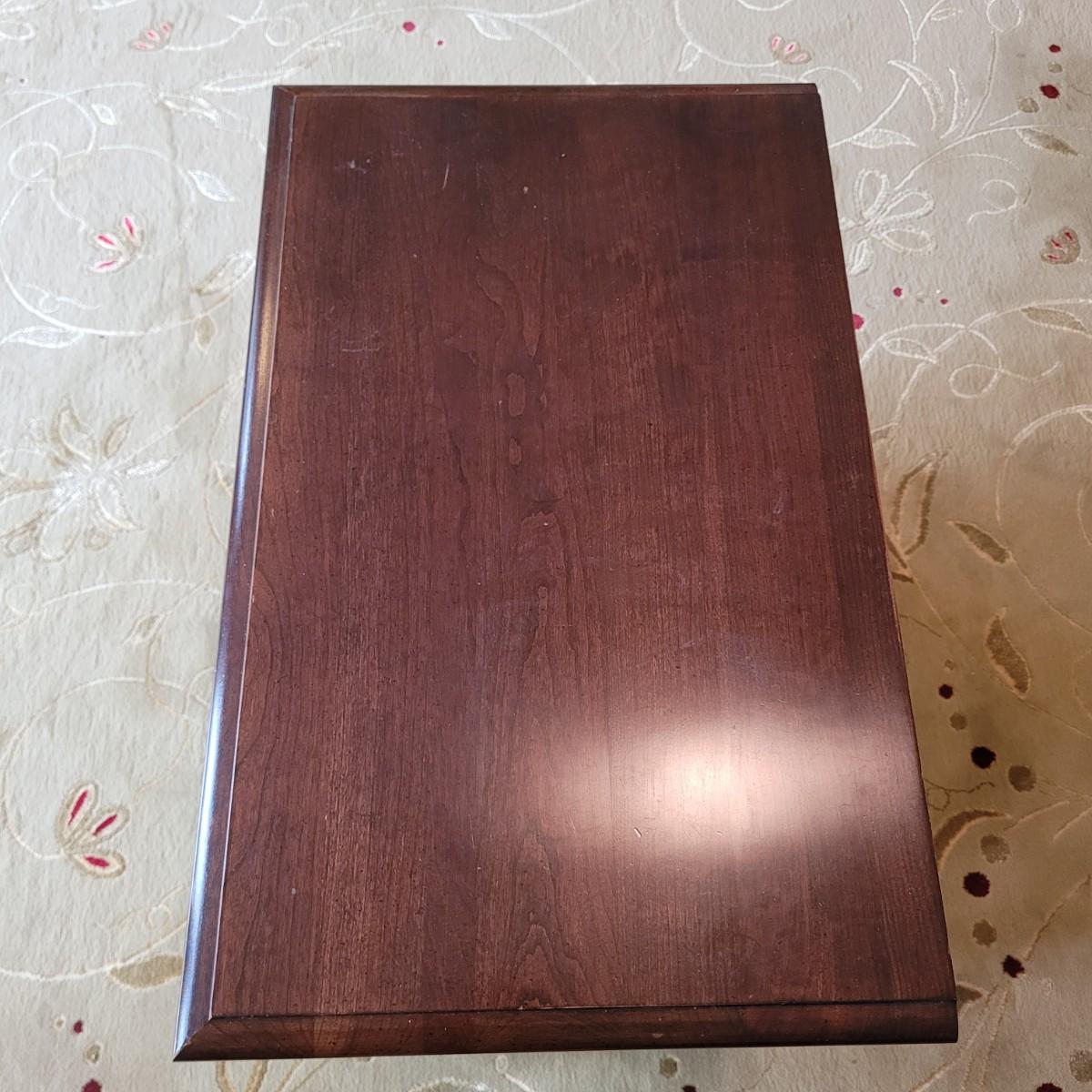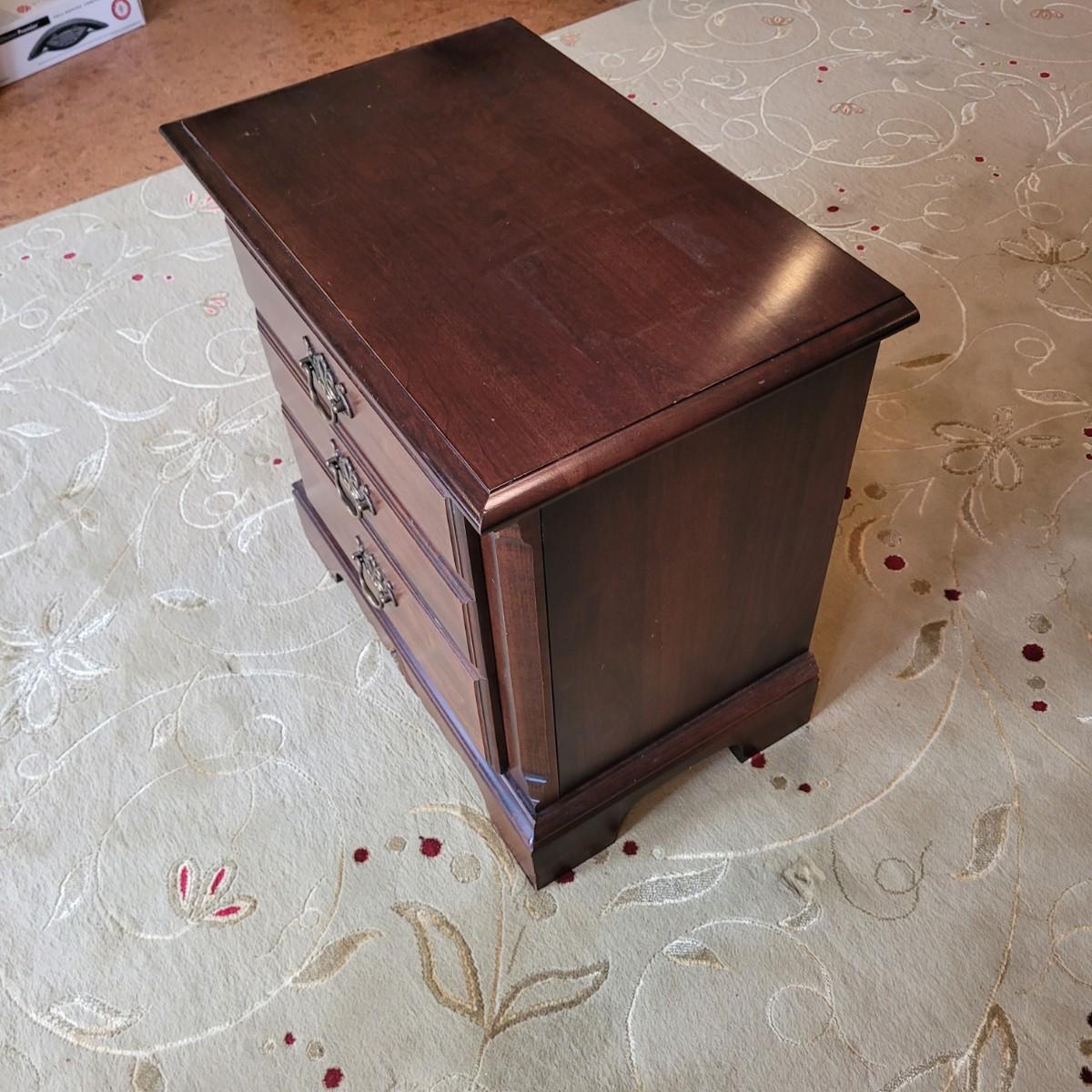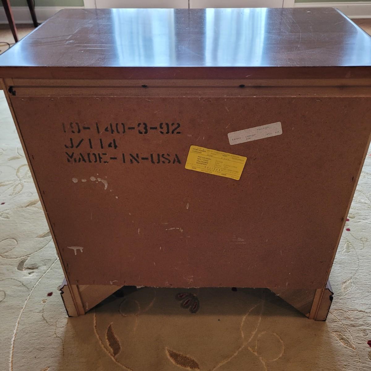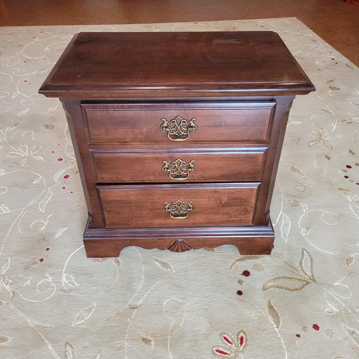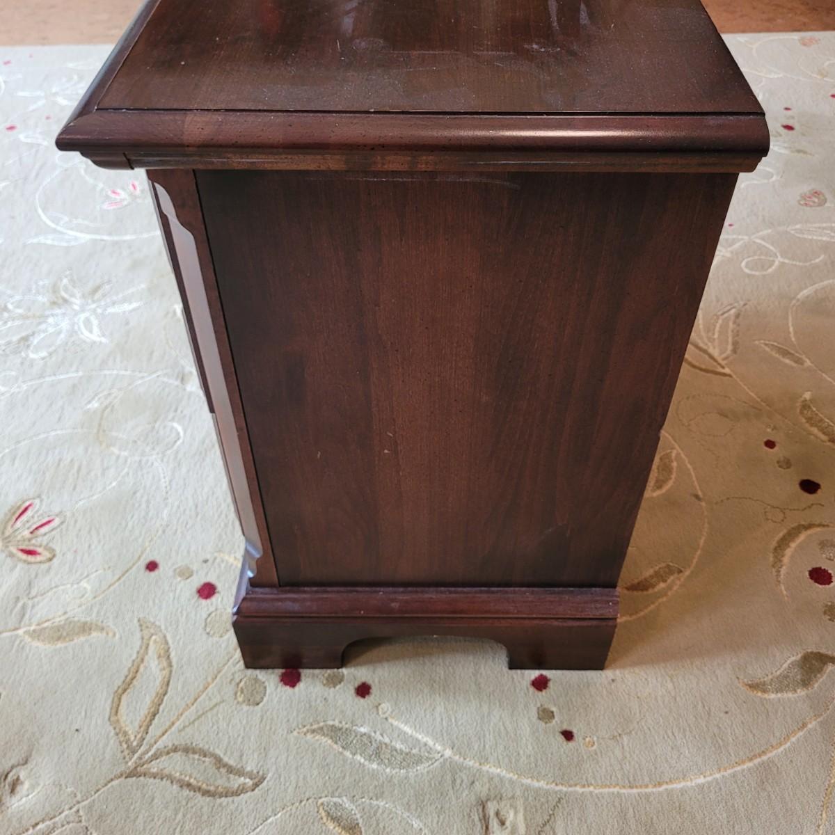 Wooden two drawer traditional style nightstand. Made from solid wood that appears to be cherry. Features two large pull out drawers with metal handles. Has the appearance of three drawers, but the top two are combined into one. Stamped Kincaid furniture company inside the top drawer. Item measures 26.5" x 13" x 25.5"H. Background rug is for sale in another lot.