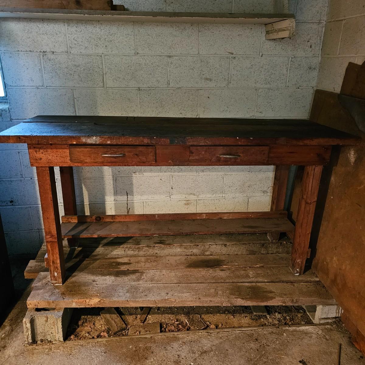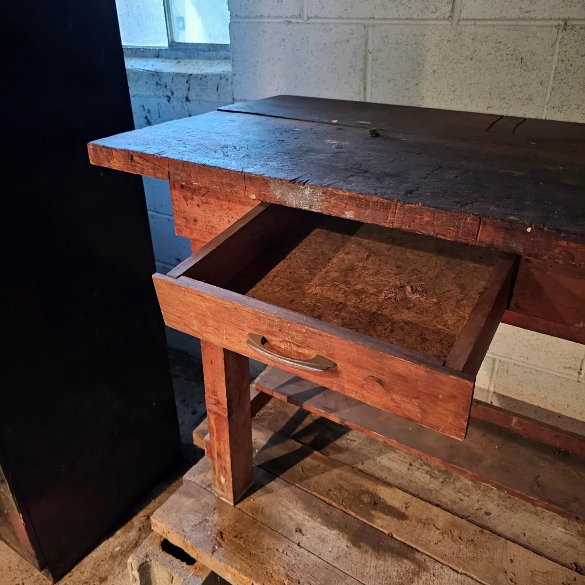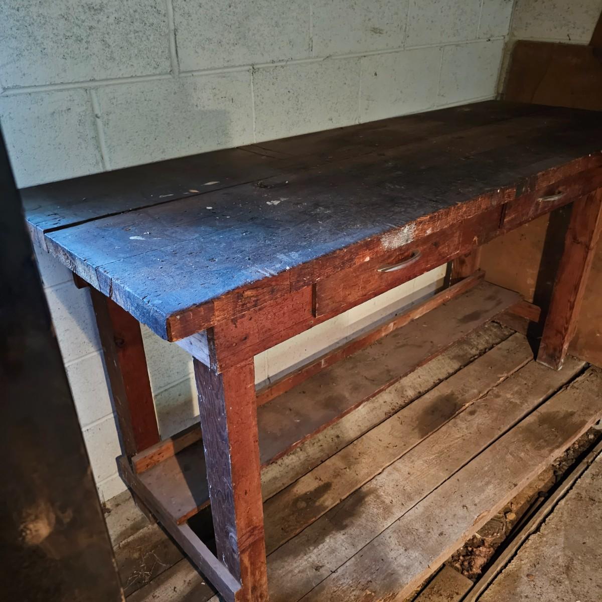 Solid wood workbench with two drawers for storage. 1.5" thick top, 2.5" legs. Bench has seen several projects, some cuts and nicks in top. Overall measurement is 72" x 25" x 36"H. See photos for details. Local pickup only. Winning bidder must bring assistance to help move and load this item due to its weight and/or size.