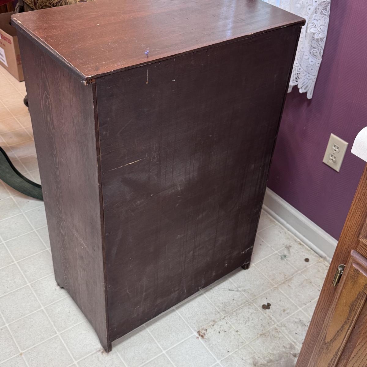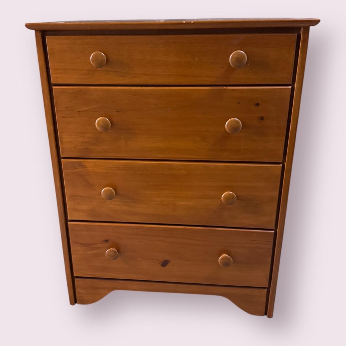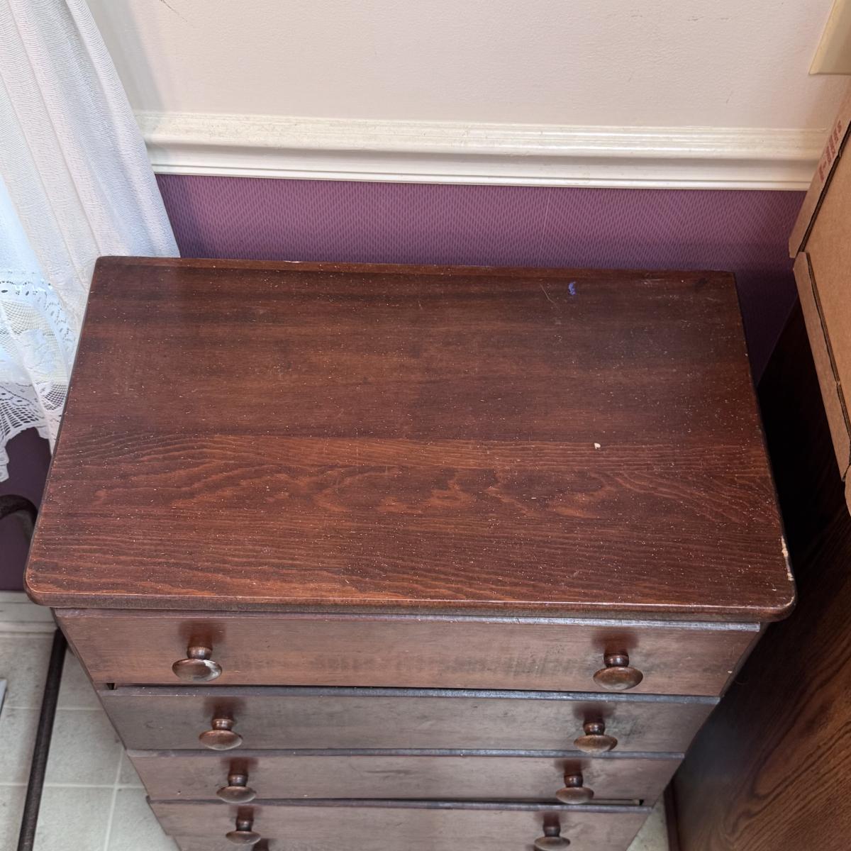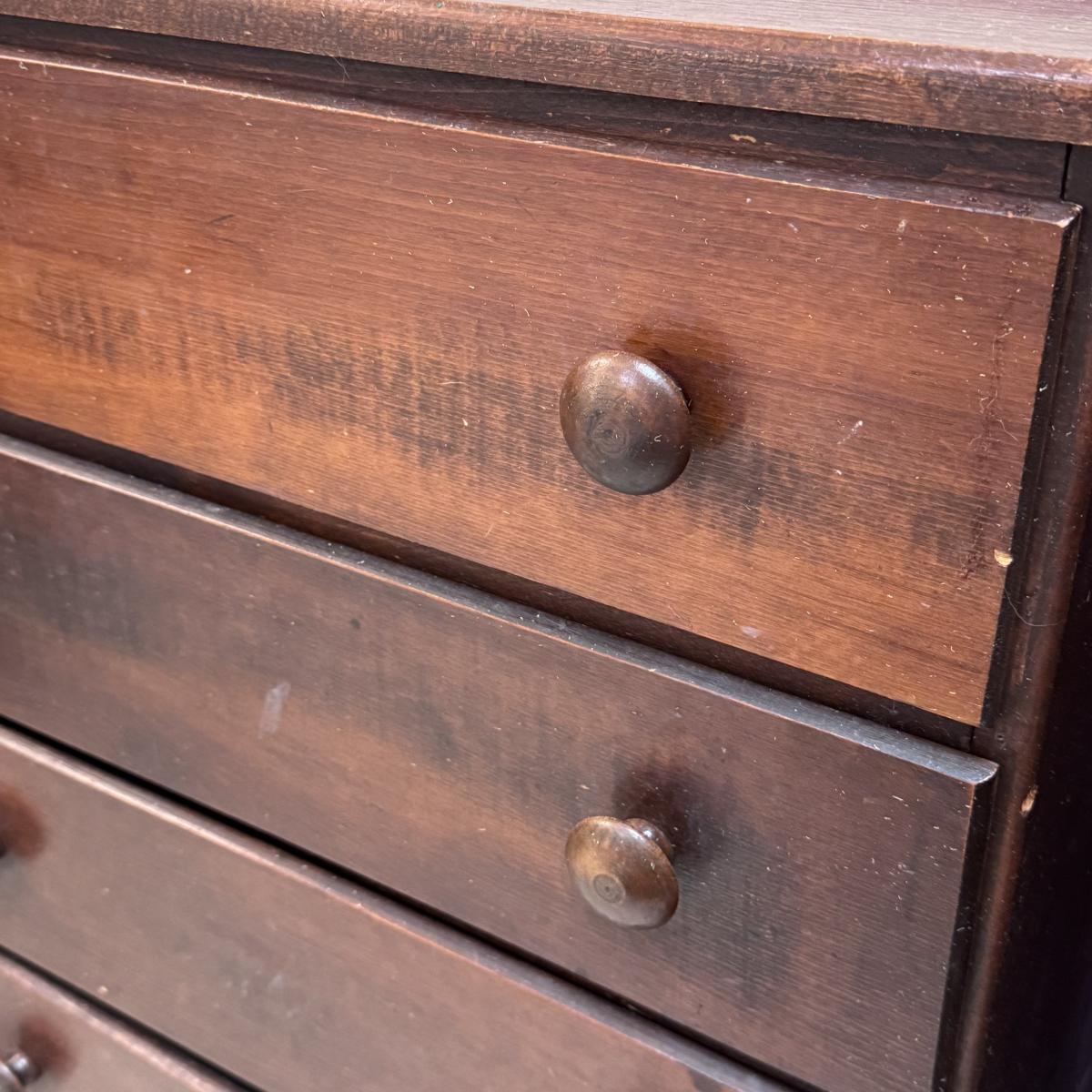 This lot includes two cute wooden dressers with round knobs. The light-colored wooden dressers has five drawers and measures 26” x 17” x 23”H. The darker dresser has six drawers and measures 23” x 14” x 35”H. Local pickup only.