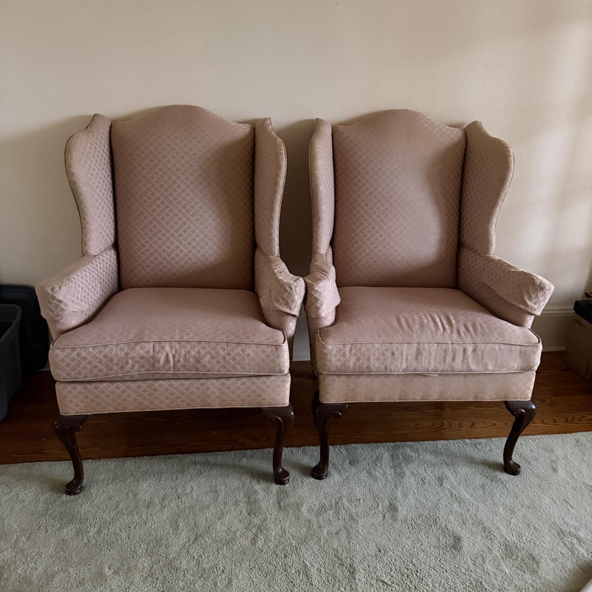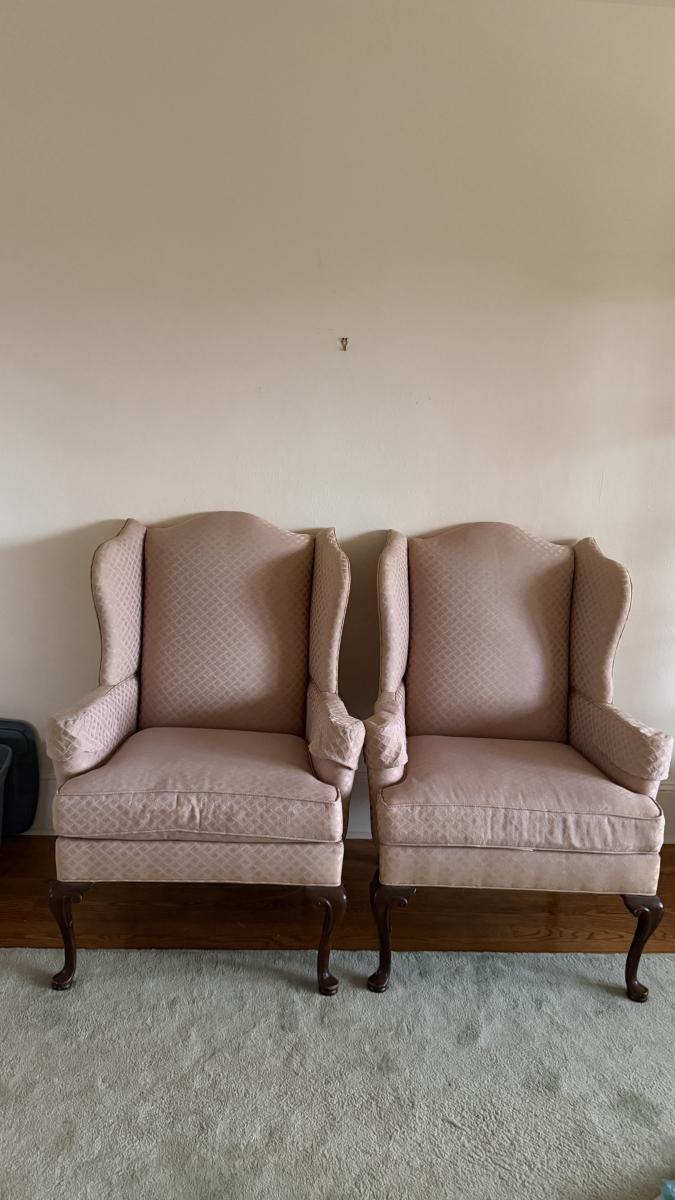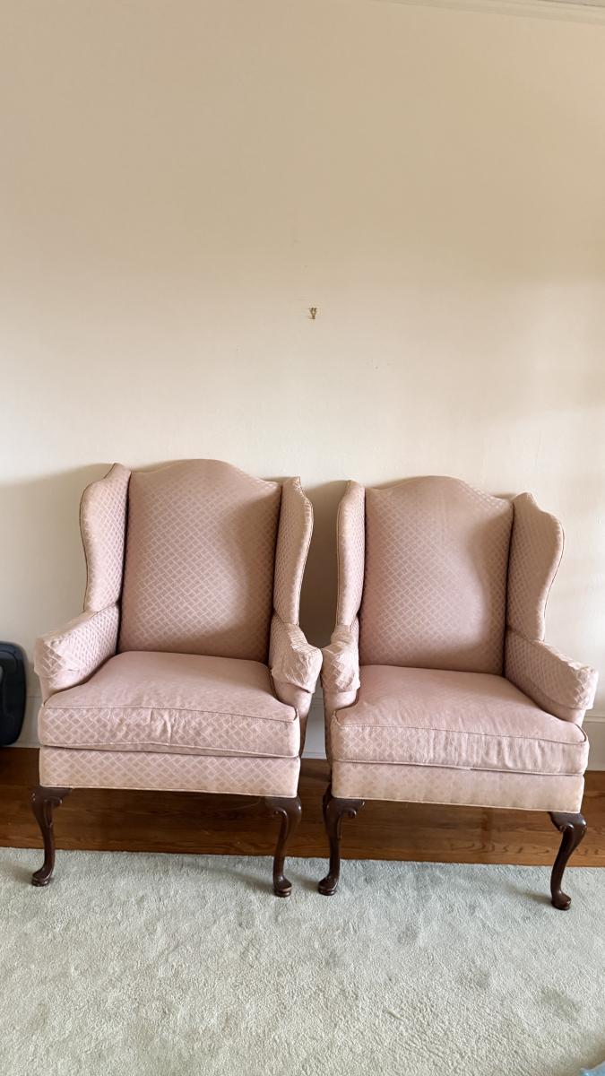 Matching pair of Drexel Queen Anne style upholstered wingback chairs. Upholstery is a soft pink color. Chairs measure 30” x 32” x 45”H with a 21” seat height. Legs have scratches and one seat cushion has marks, see pictures.