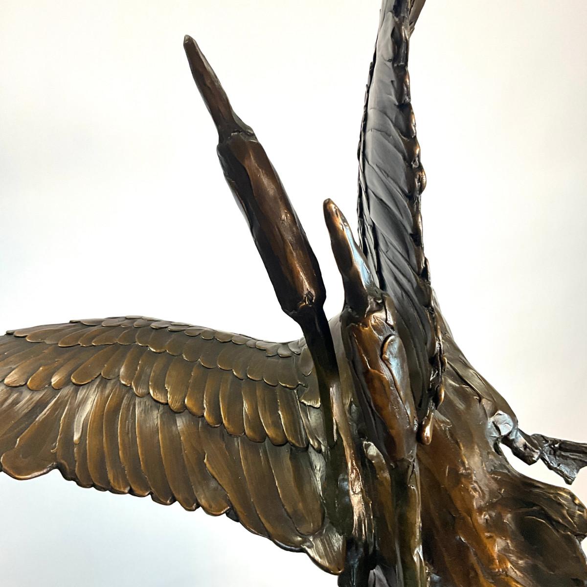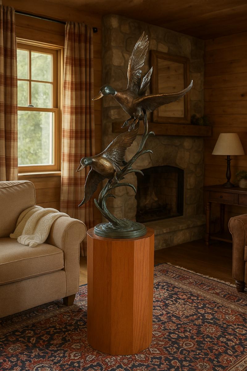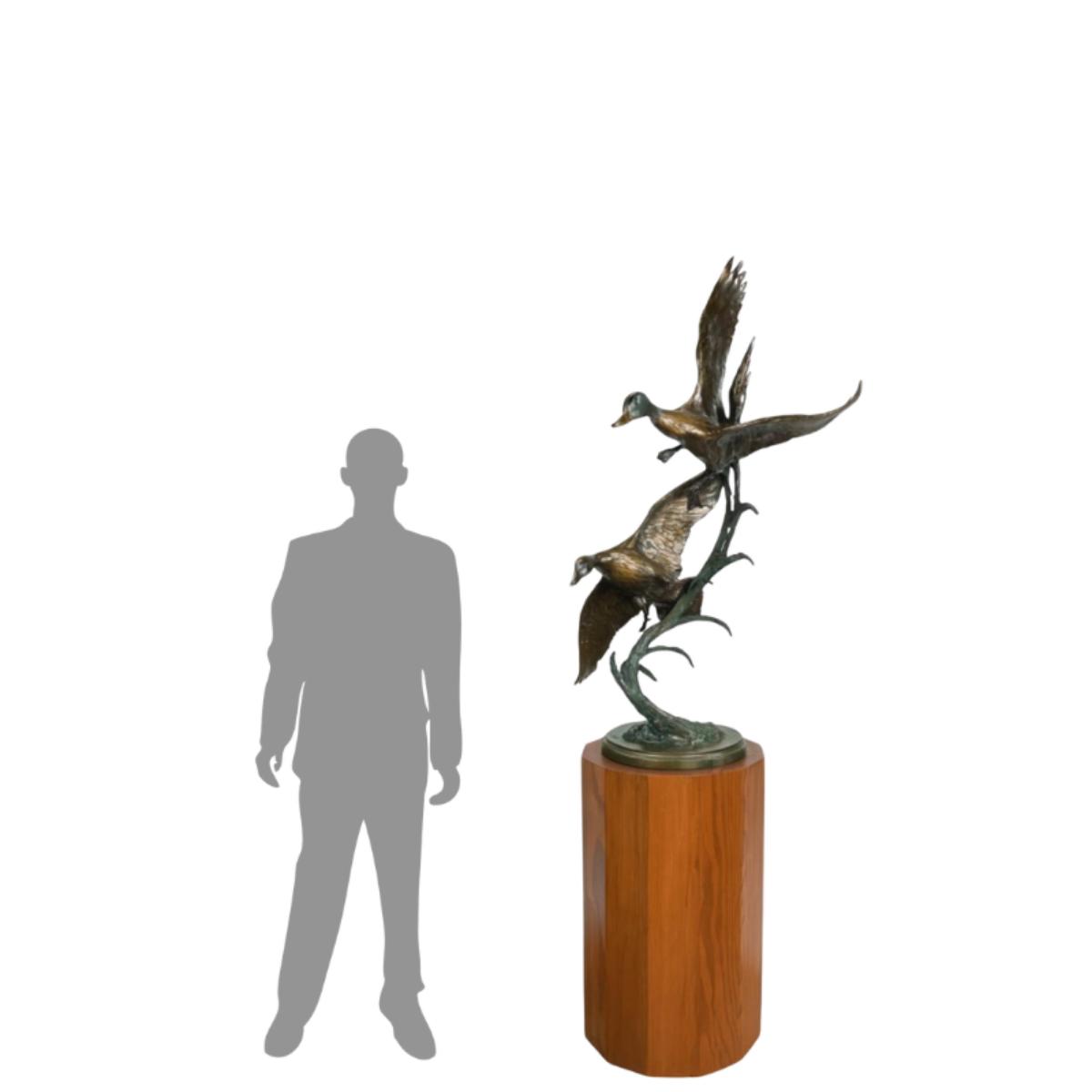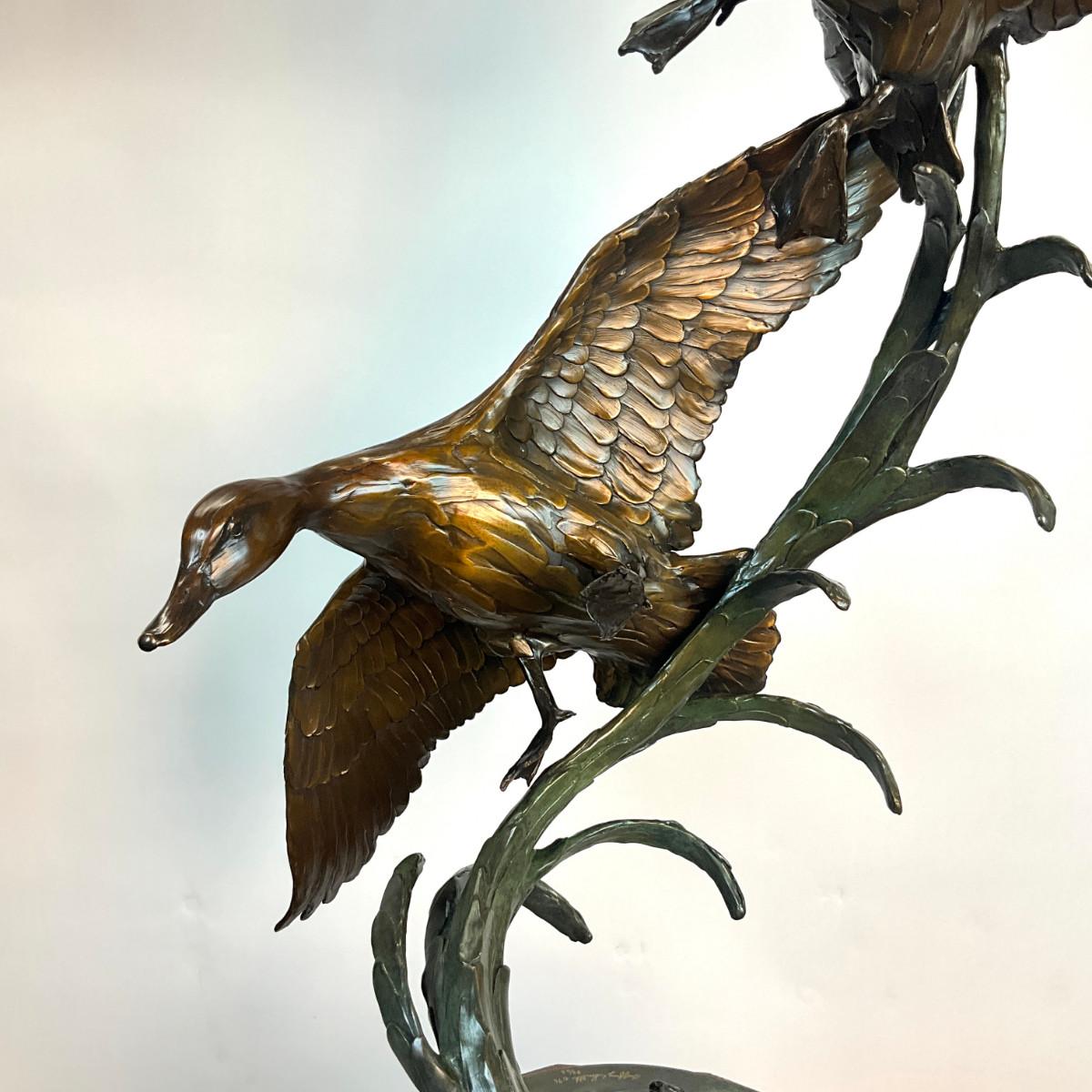 Against the Wind is an elegant rendition of a pair of mallards cutting through the wind for a landing . The design incorporates beautiful "S" curves and circular motion rising out of an integrated formal bronze base. This piece is suitable for indoor, outdoor and fountain use.